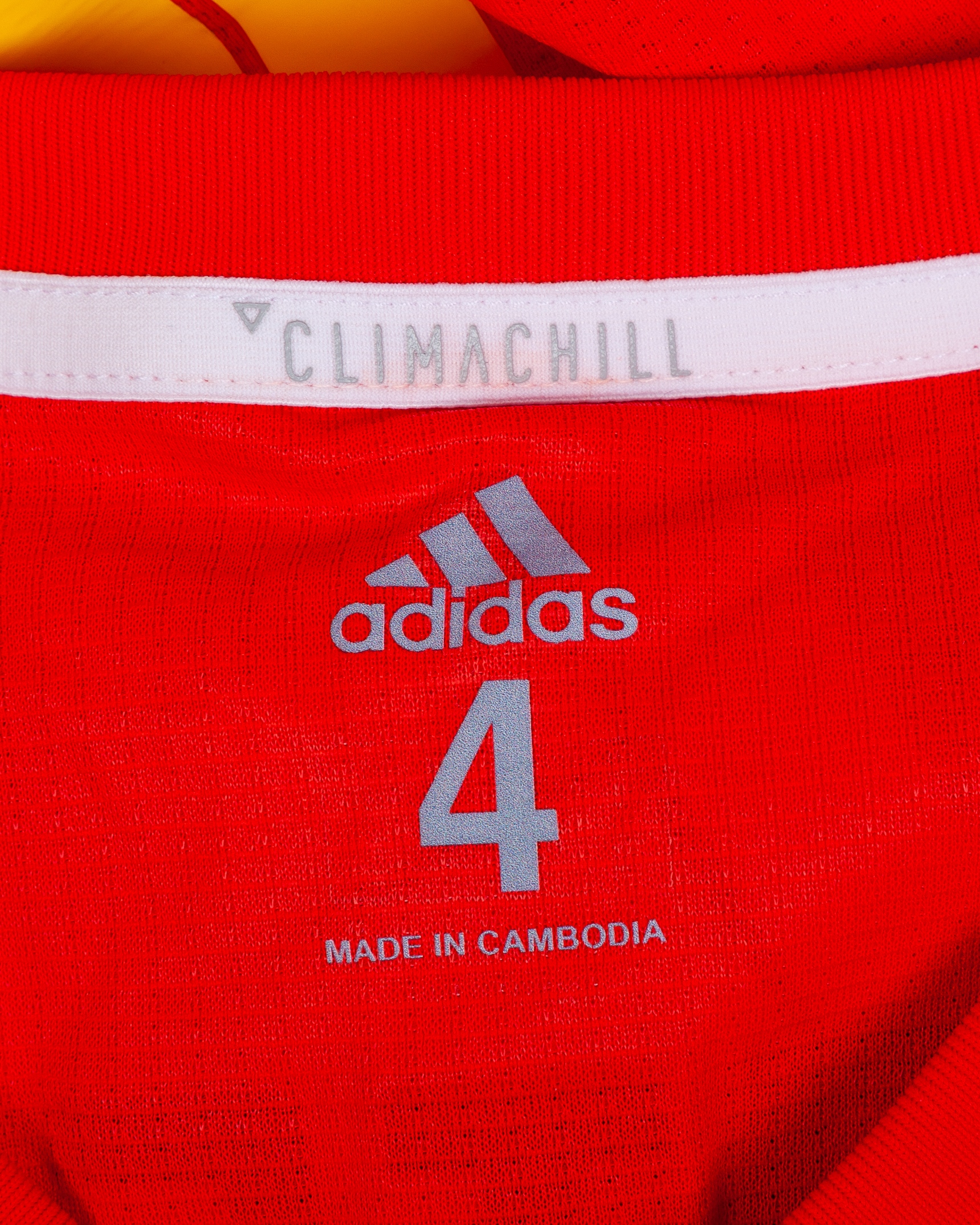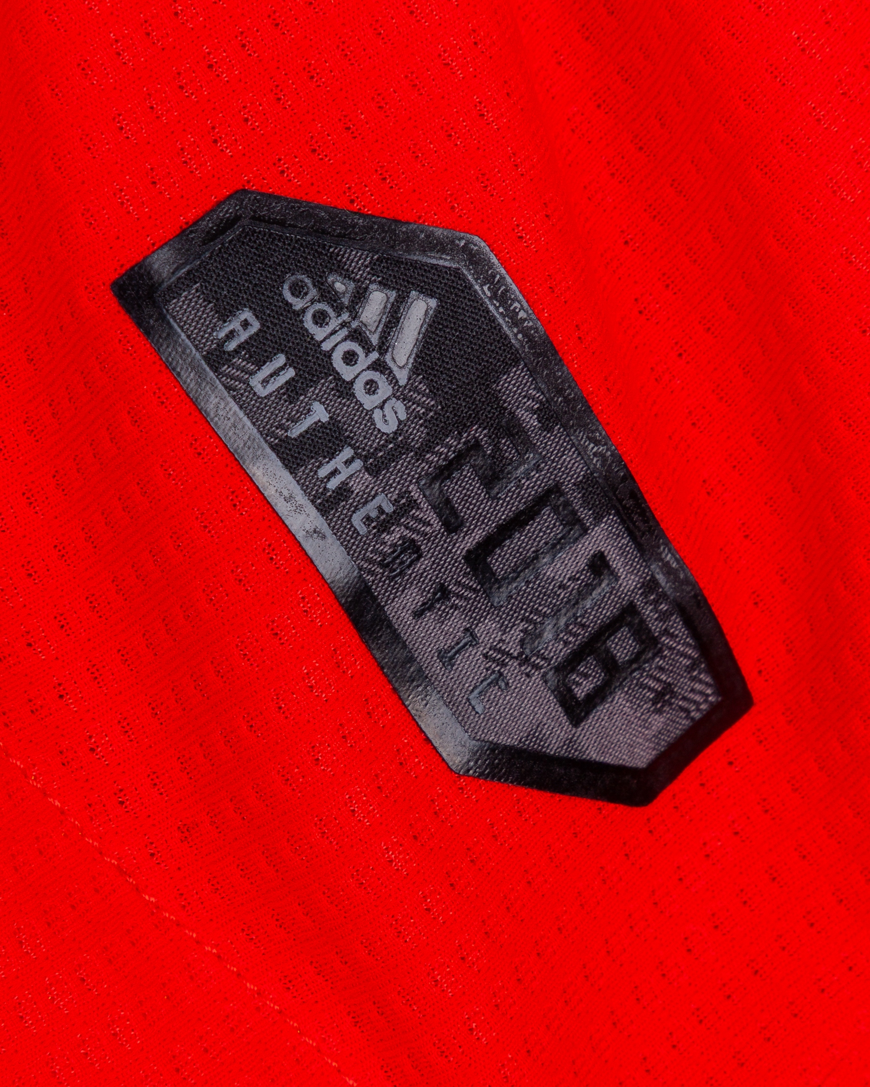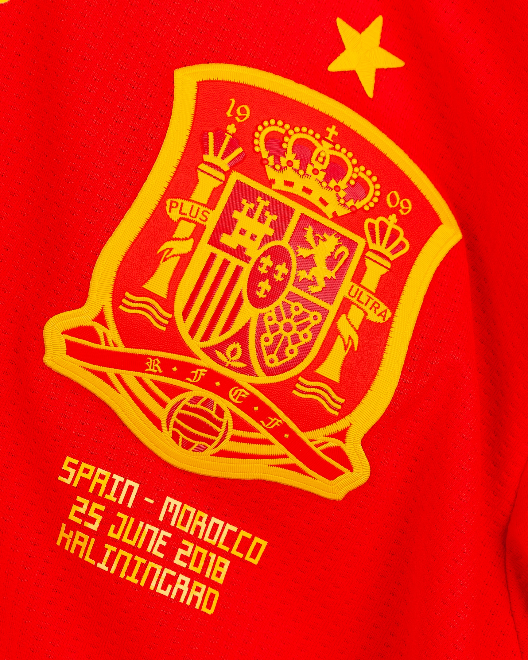 Andres Iniesta red and yellow No.6 Spain v. Morocco match issued short-sleeved shirt, 2018, Adidas, 4, with crew-neck collar and printed badge with SPAIN - MOROCCO 25 JUNE 2018 KALININGARD decal, the reverse lettered A. INIESTA, the right sleeve with FIFA World Cup Russia 2018/Living Football flashes