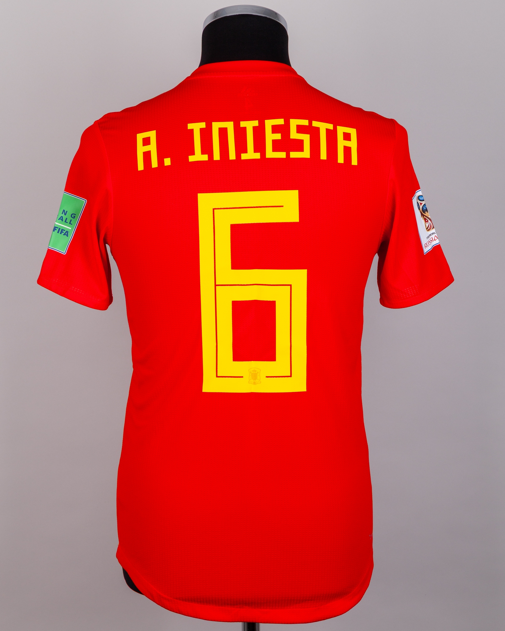 Andres Iniesta red and yellow No.6 Spain v. Morocco match issued short-sleeved shirt