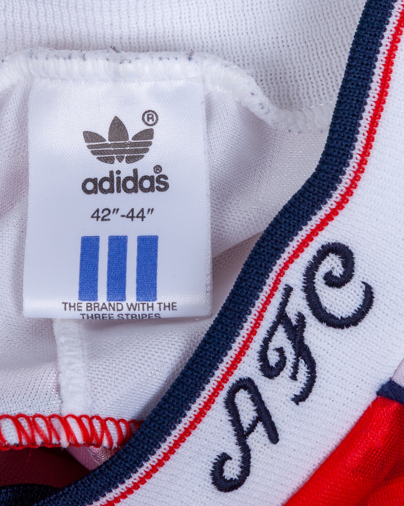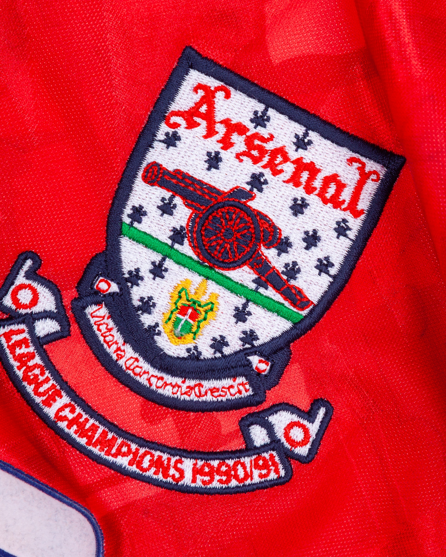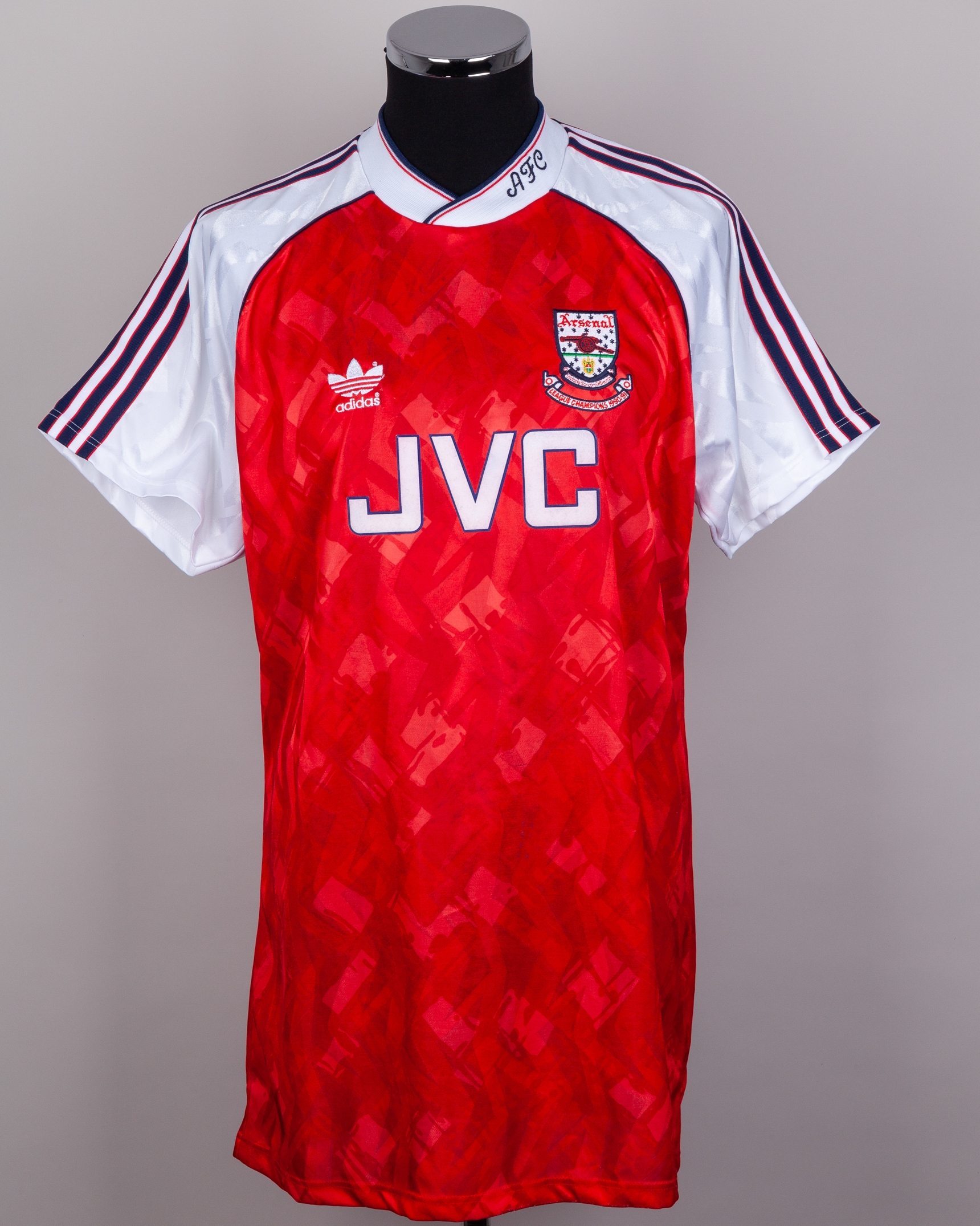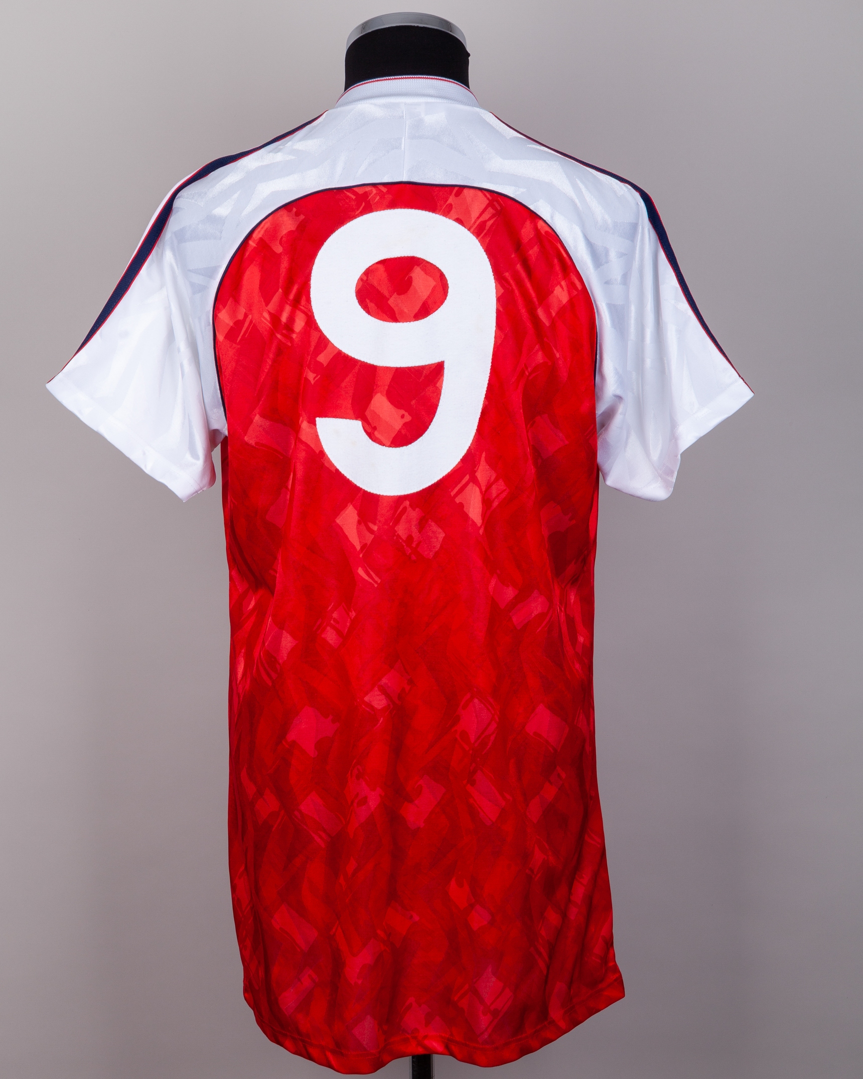 Alan Smith red and white No.9 Arsenal v Benfica autographed short-sleeved shirt, 1991, Adidas, 42"-44", with crew-neck collar and embroidered badge inscribed Arsenal Victoria Concordia Crescit LEAGUE CHAMPIONS 1990/91, the collar inscribed AFC, the front with several very faded autographs