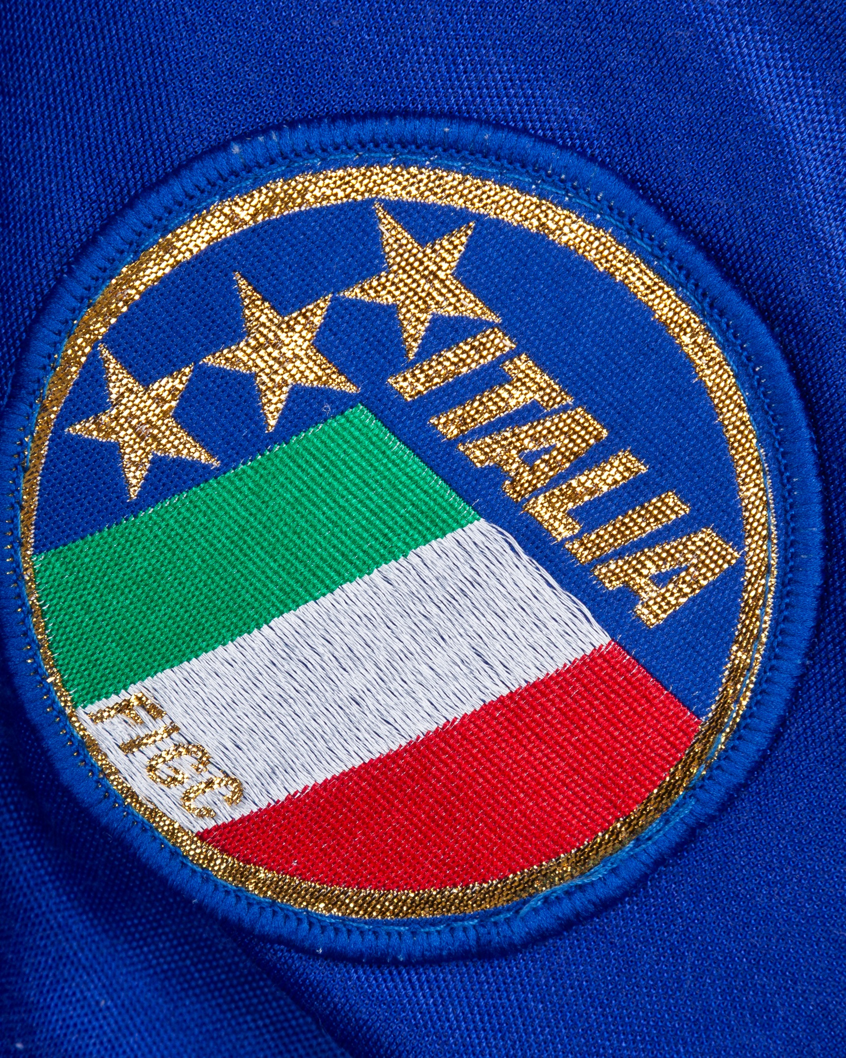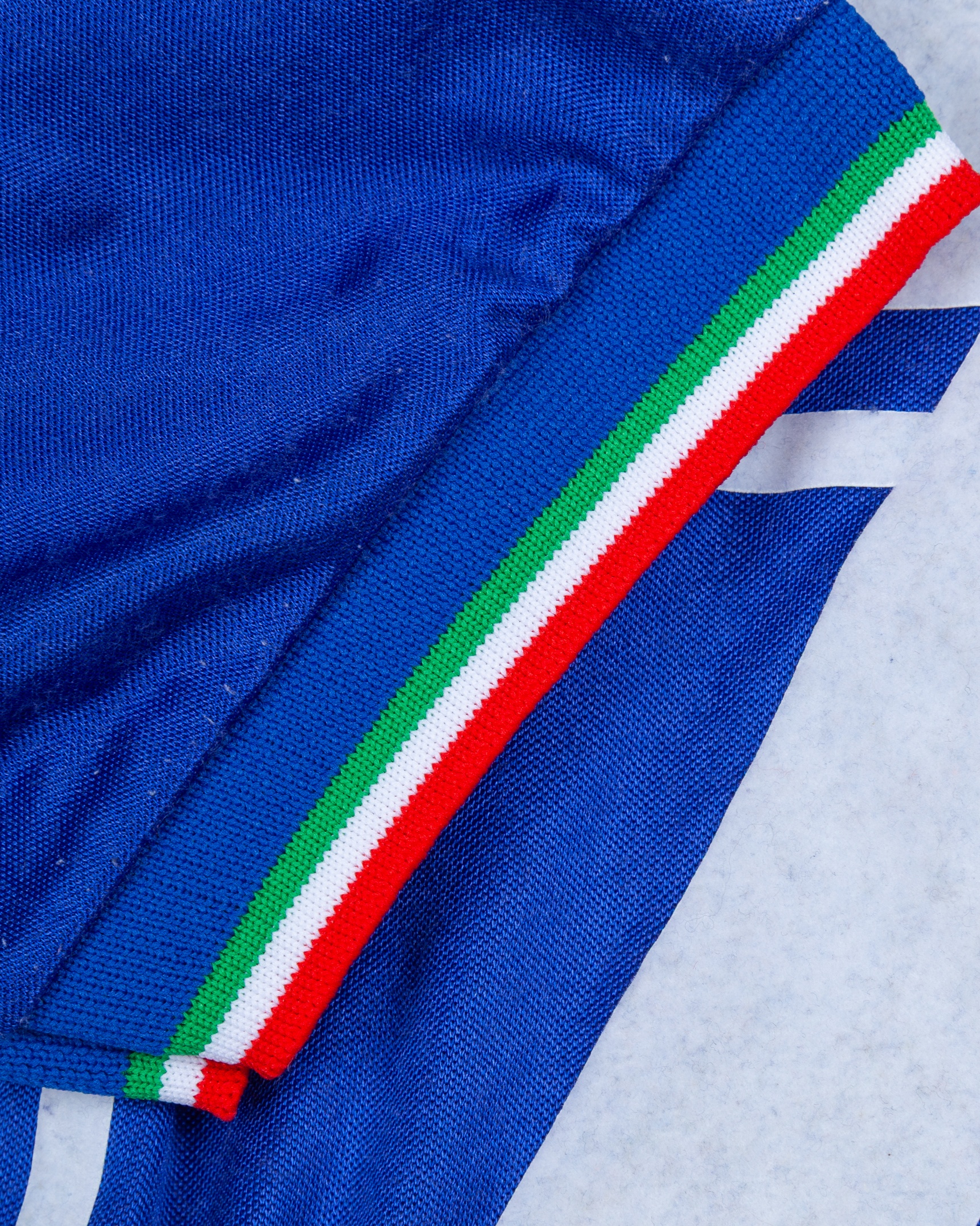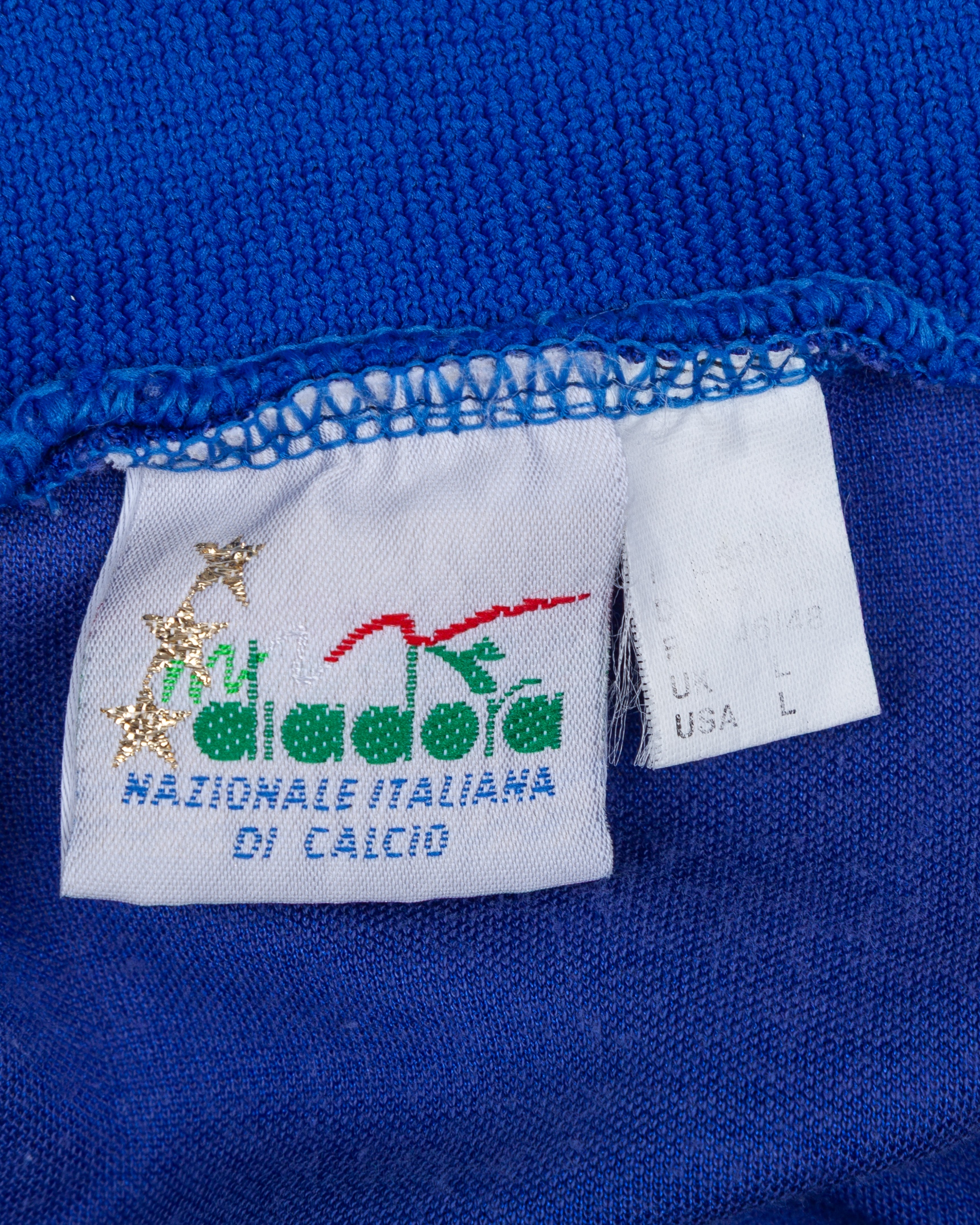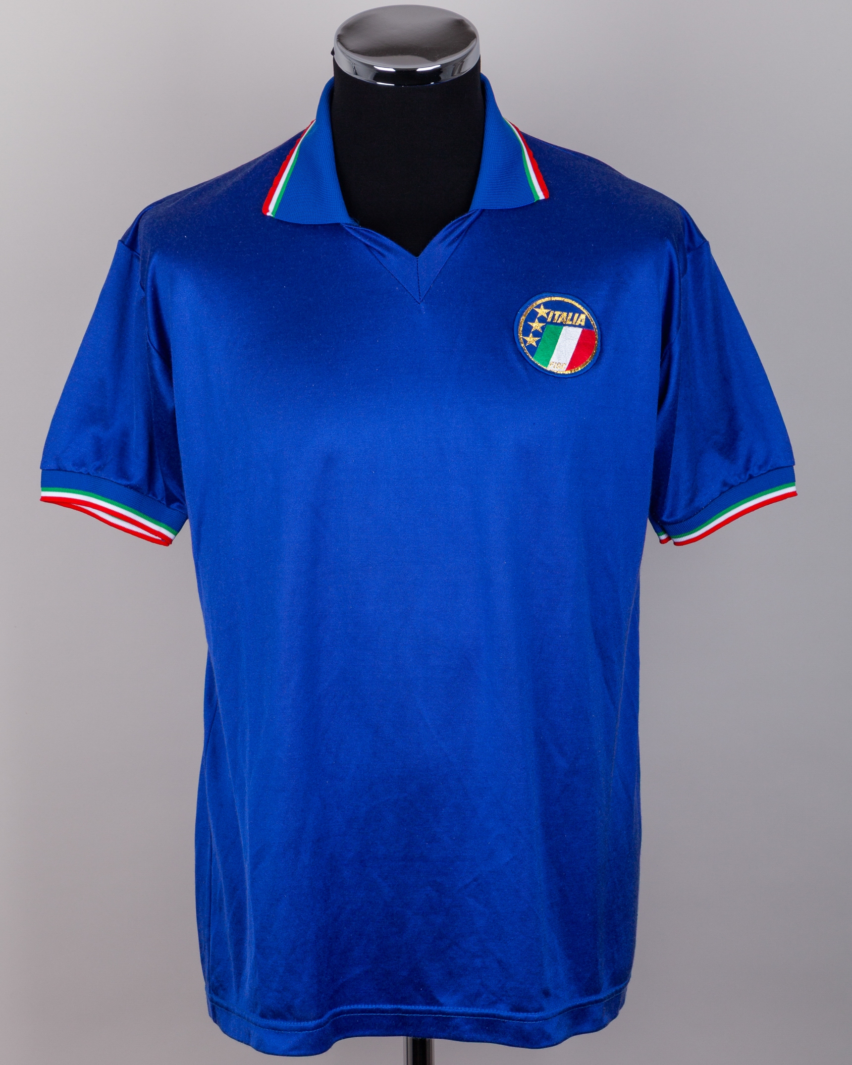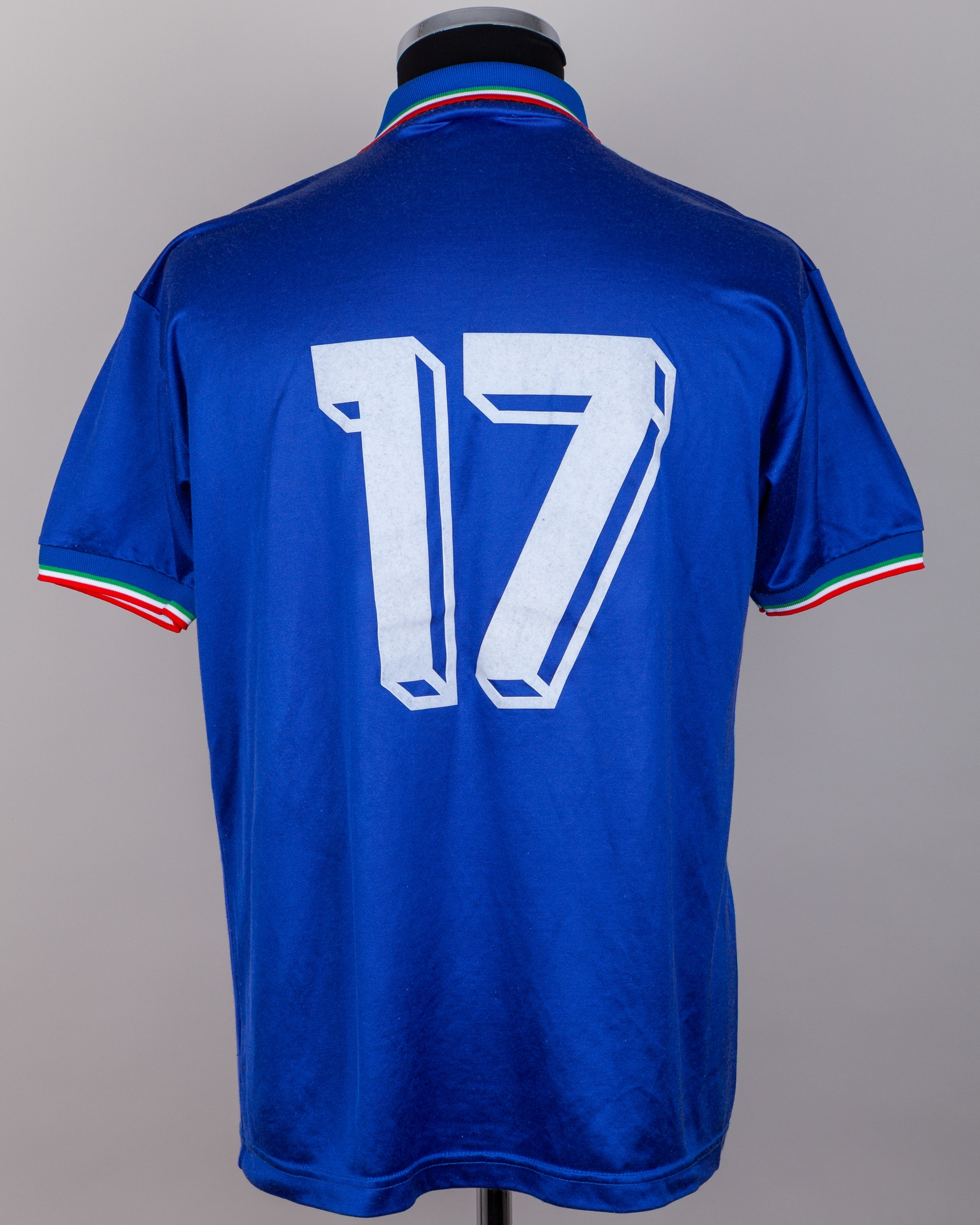 Roberto Donadoni blue No.17 Italy v. Austria short-sleeved shirt, 1990, Adidas, L, with v-neck collar and embroidered cloth badge inscribed ITALIA FIGC, the number with some discolouration