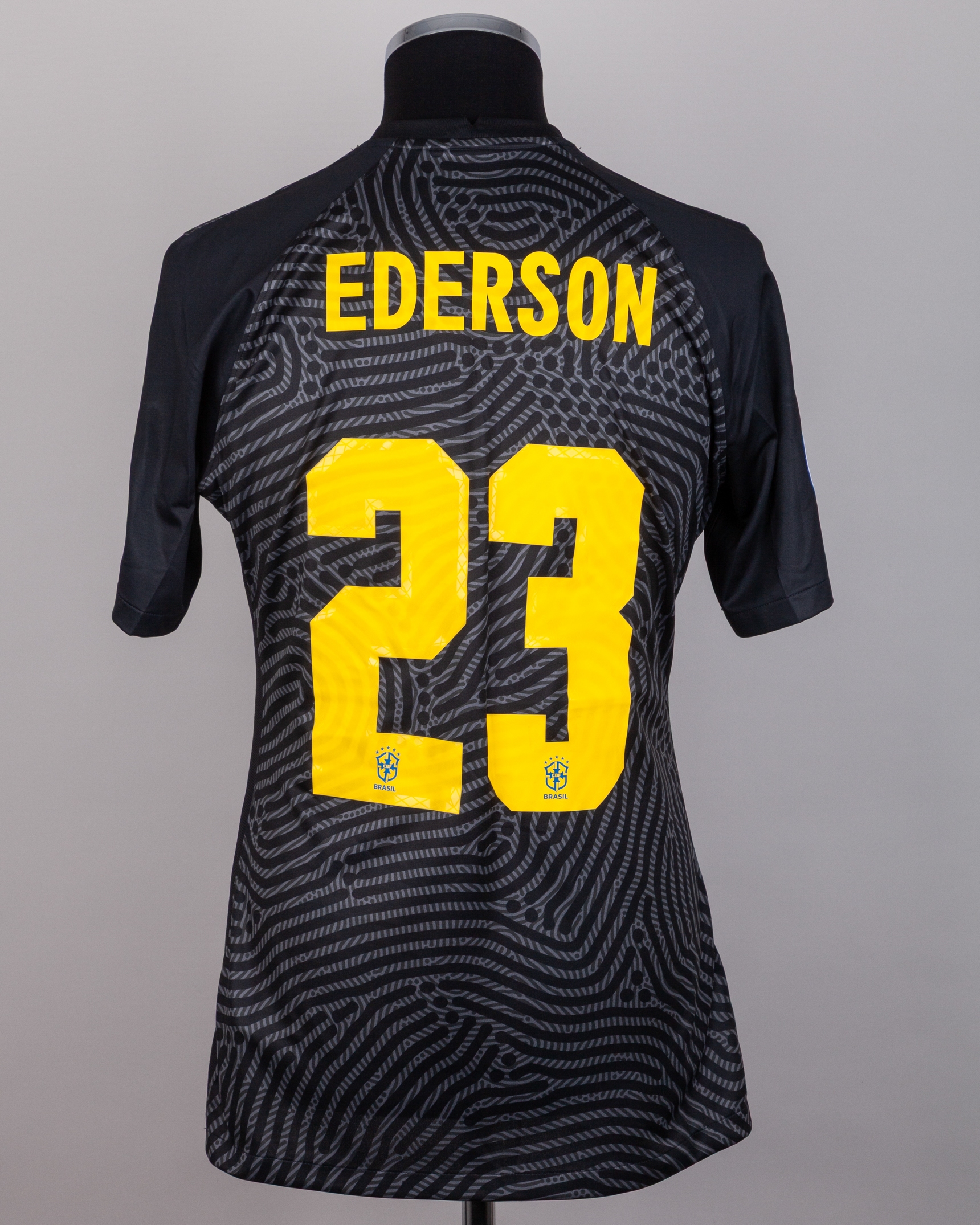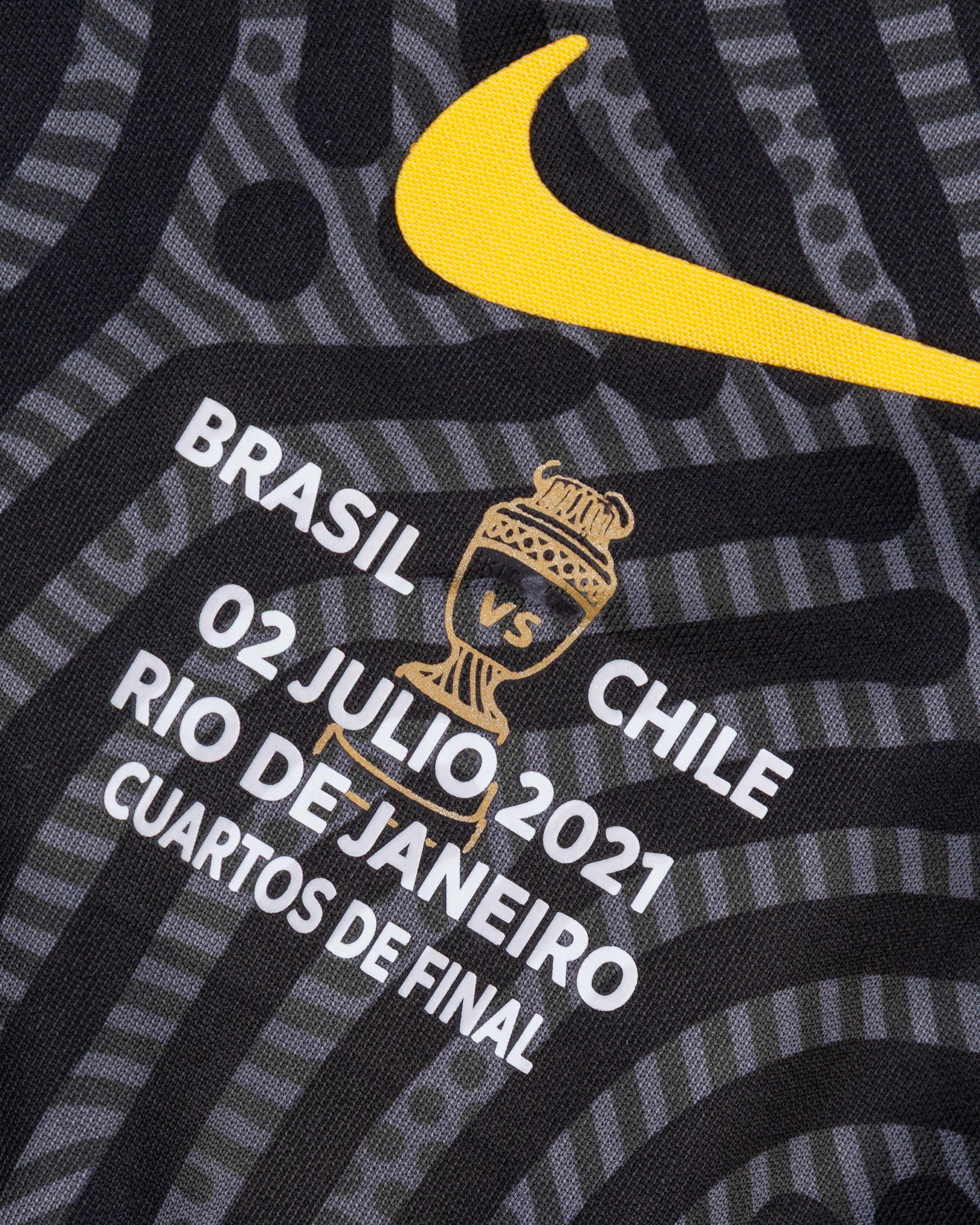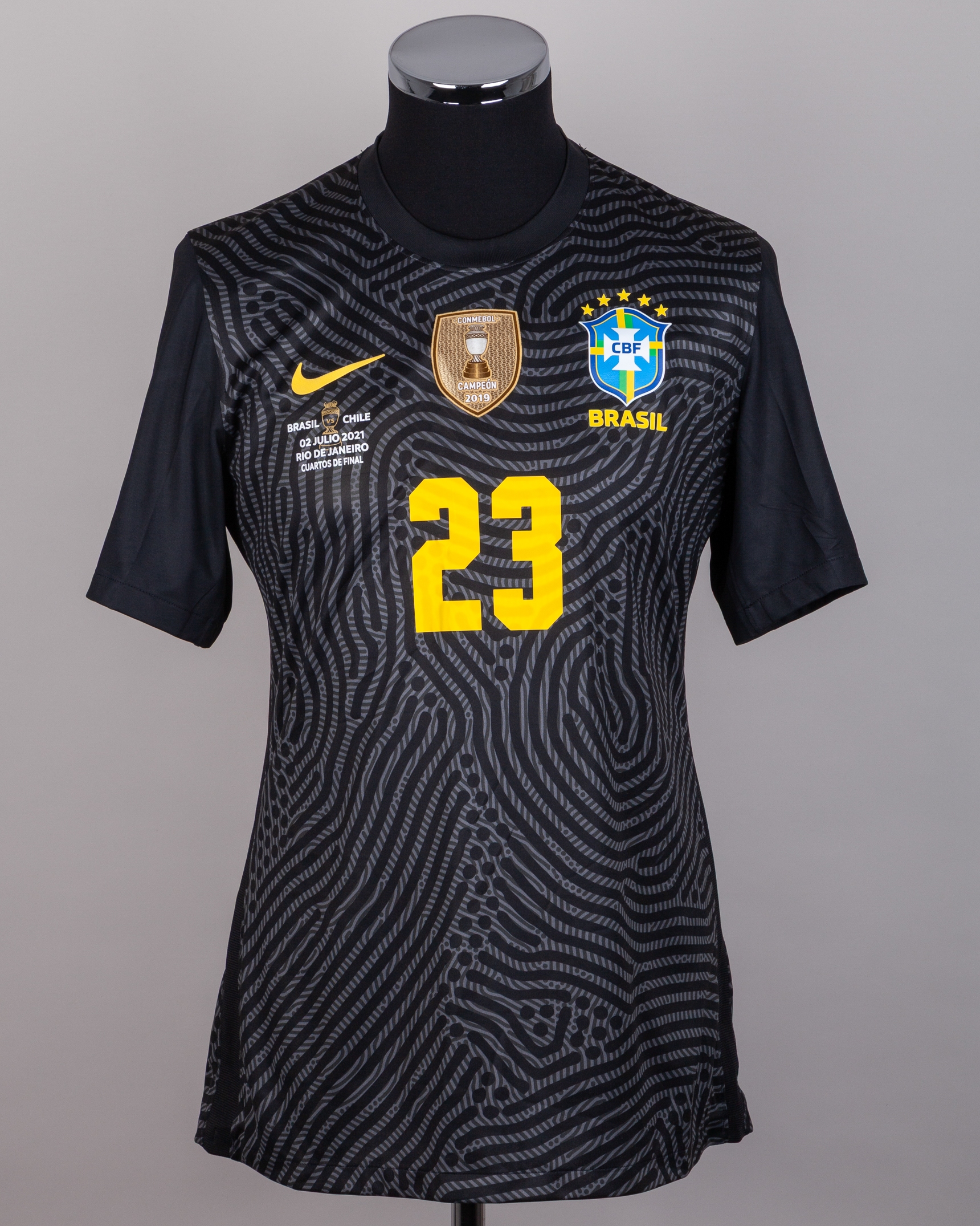 Ederson black No.23 Brazil v. Chile Copa America match issued short-sleeved shirt, 2021, Nike, L, with crew-neck collar and printed badge with CONMEBOL Copa America Campeon 2019 badge, with BRASIL vs CHILE 02 JULIO 2021 RIO DE JANEIRO CUARTOS FINAL decal, the reverse lettered EDERSON, the sleeves with COPA AMERICA 2021 flashes