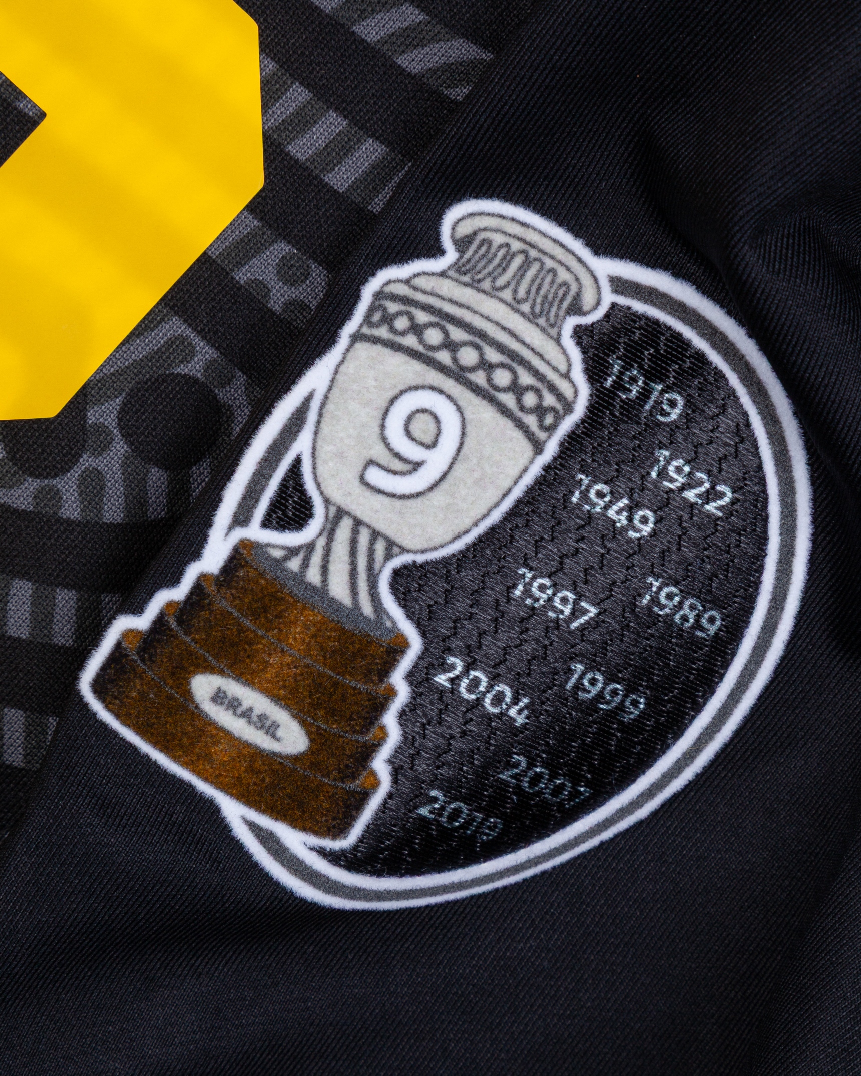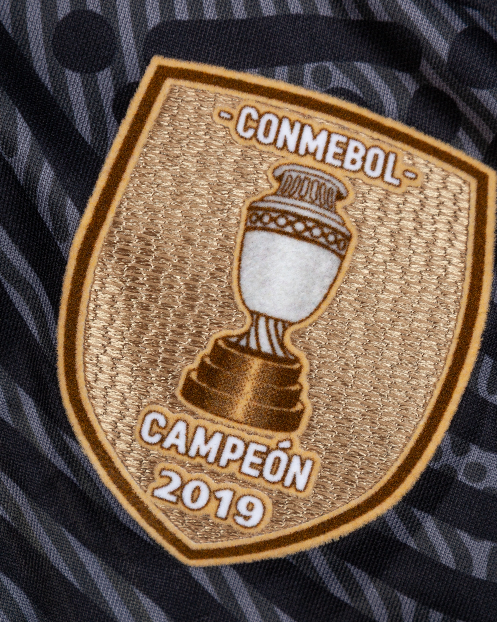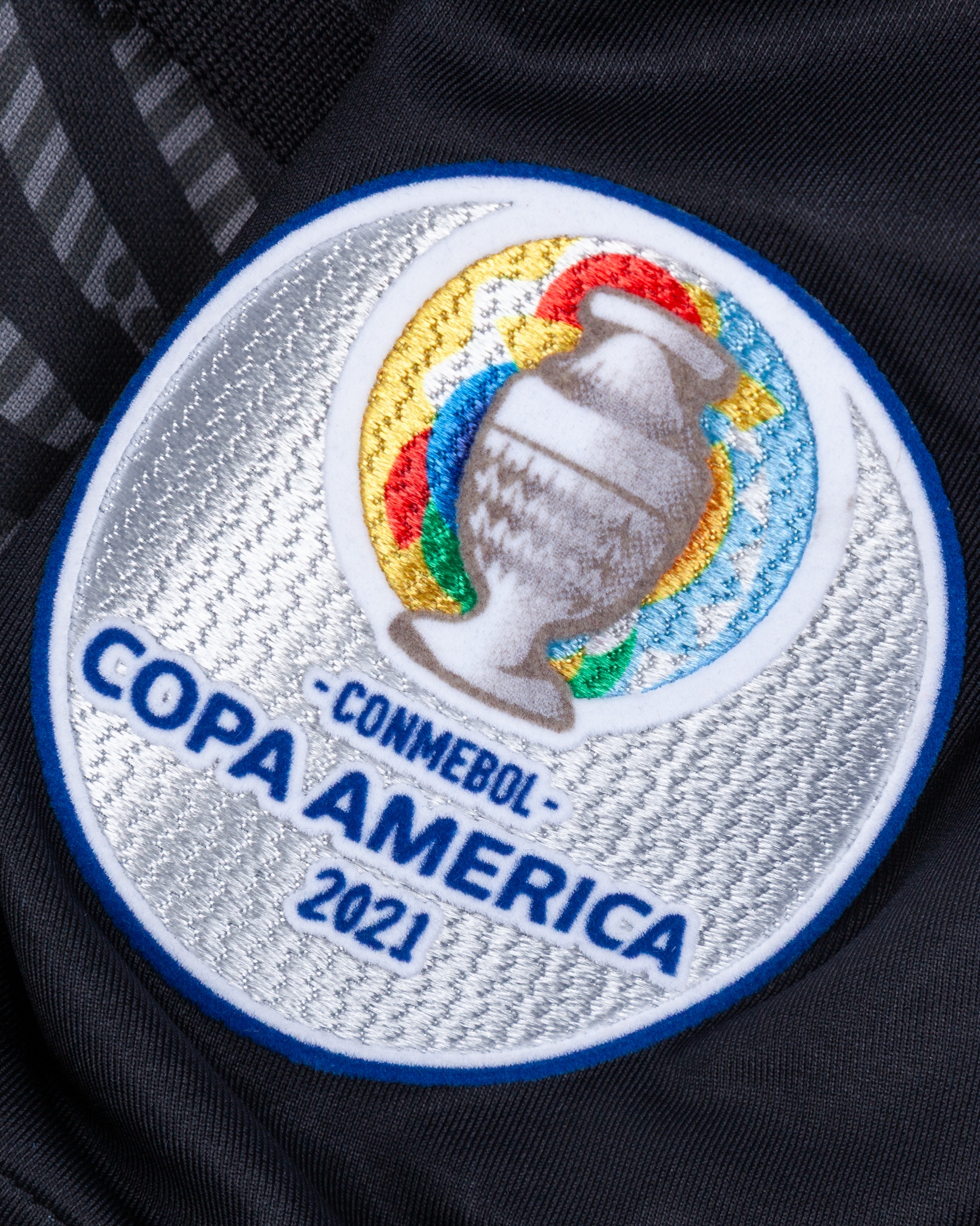 Ederson black No.23 Brazil v. Chile Copa America match issued short-sleeved shirt, 2021, Nike, L, with crew-neck collar and printed badge with CONMEBOL Copa America Campeon 2019 badge, with BRASIL vs CHILE 02 JULIO 2021 RIO DE JANEIRO CUARTOS FINAL decal, the reverse lettered EDERSON, the sleeves with COPA AMERICA 2021 flashes