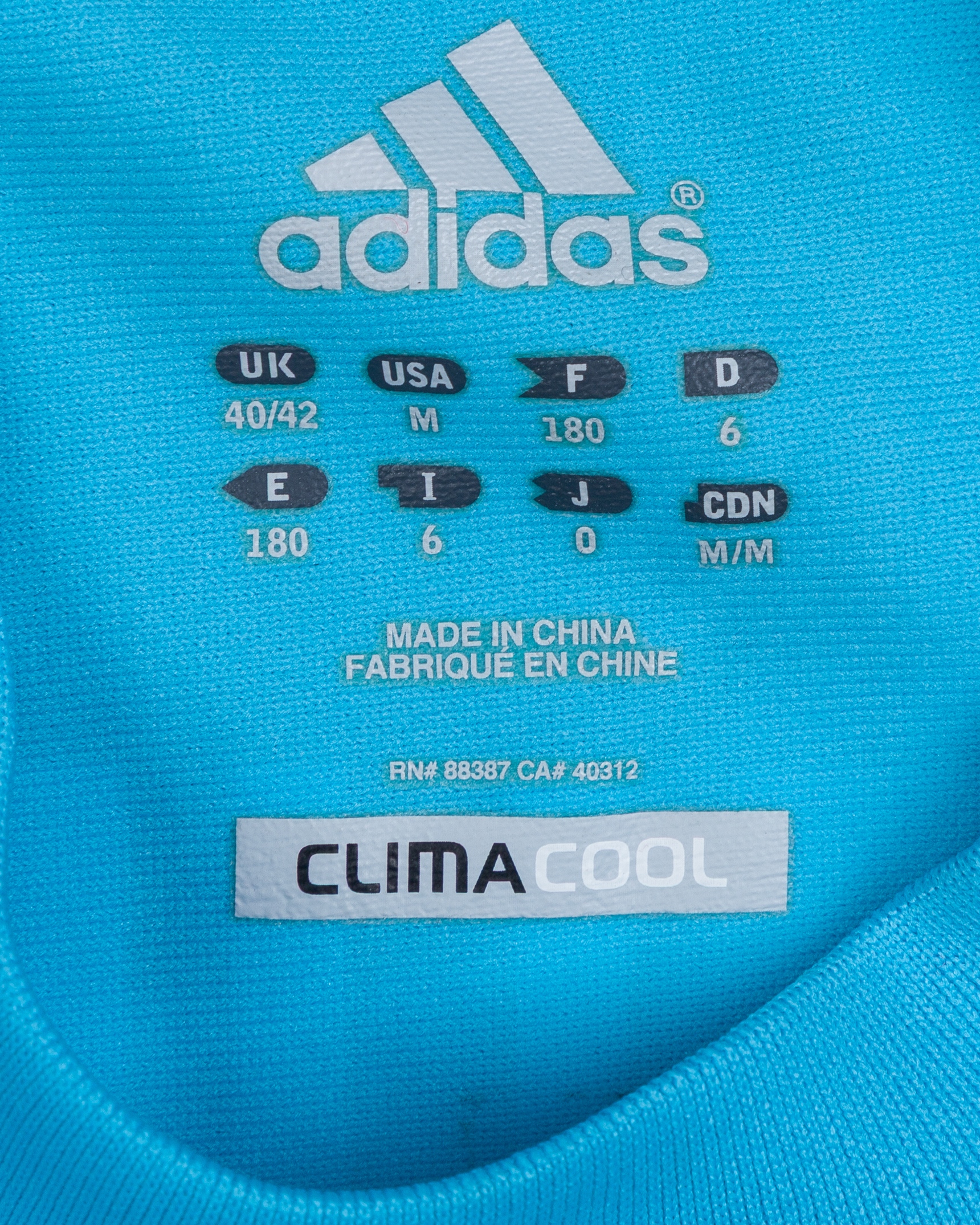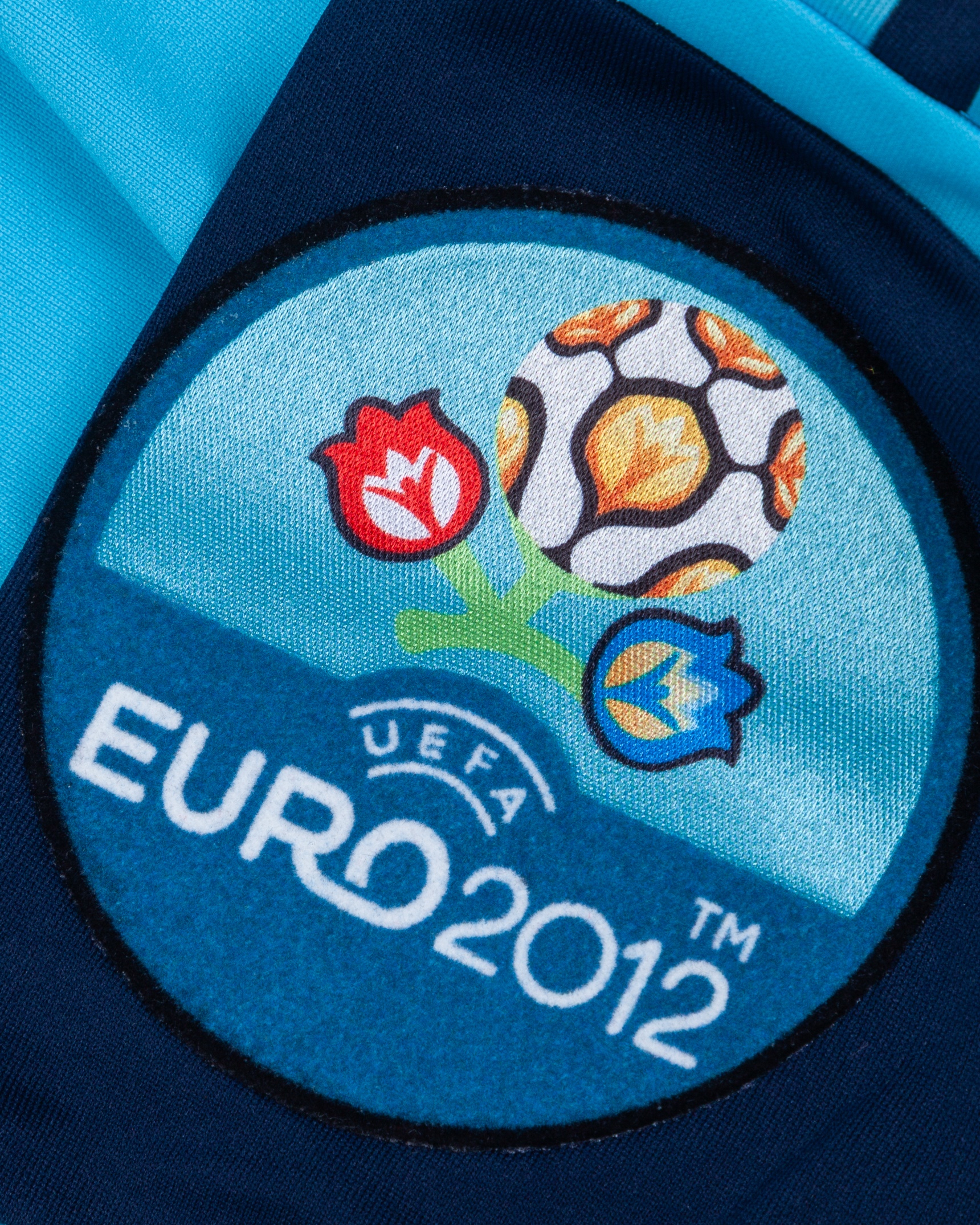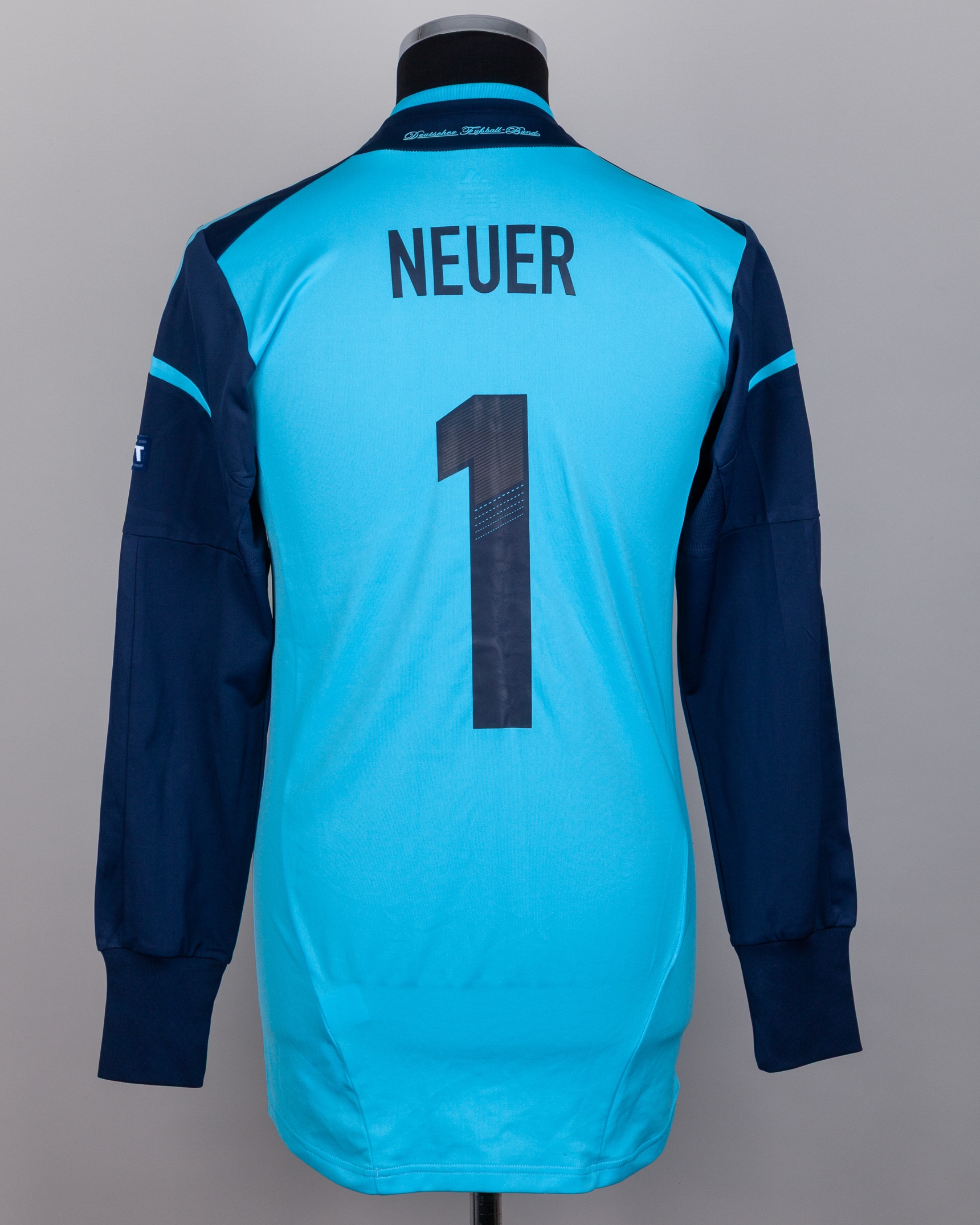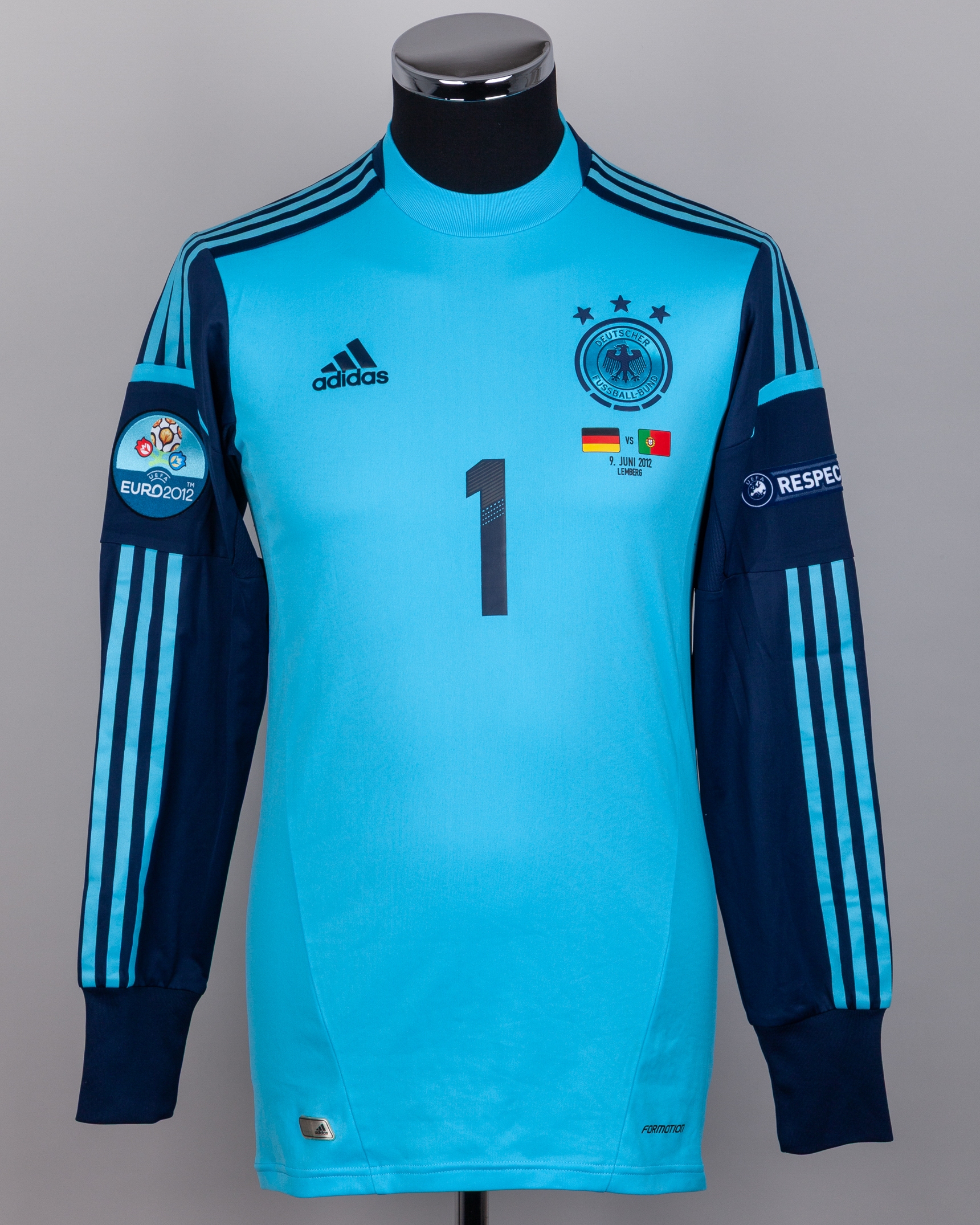 Manuel Neuer blue No.1 Germany v. Portugal goalkeepers shirt, 2012, Adidas, 40/42, with crew-neck collar and printed badge, with flags of nations 9 JUNI 2012 LEMBERG decal, the reverse lettered NEUER, the right sleeve with UEFA Euro 2012 flash, the other with UEFA Respect flash