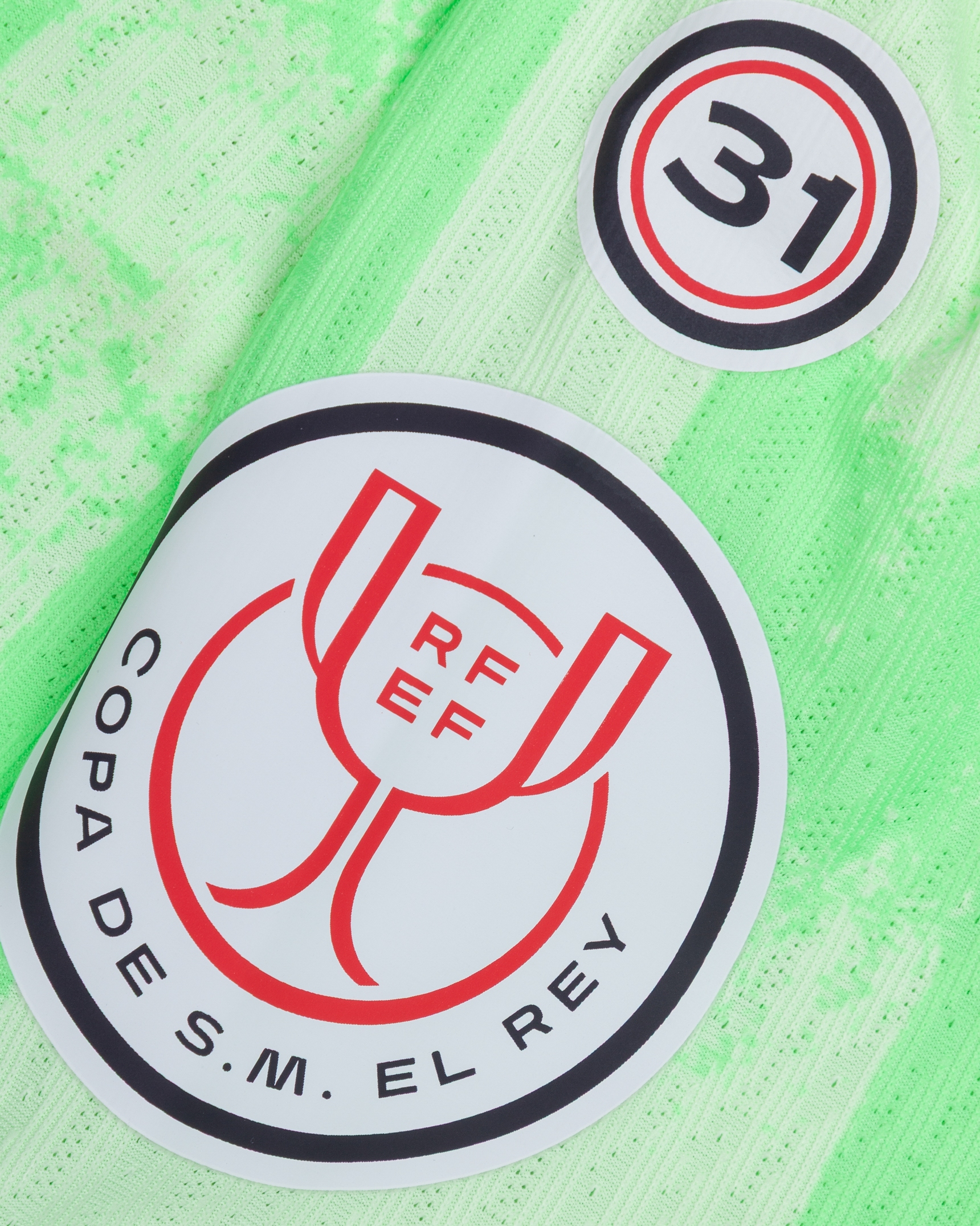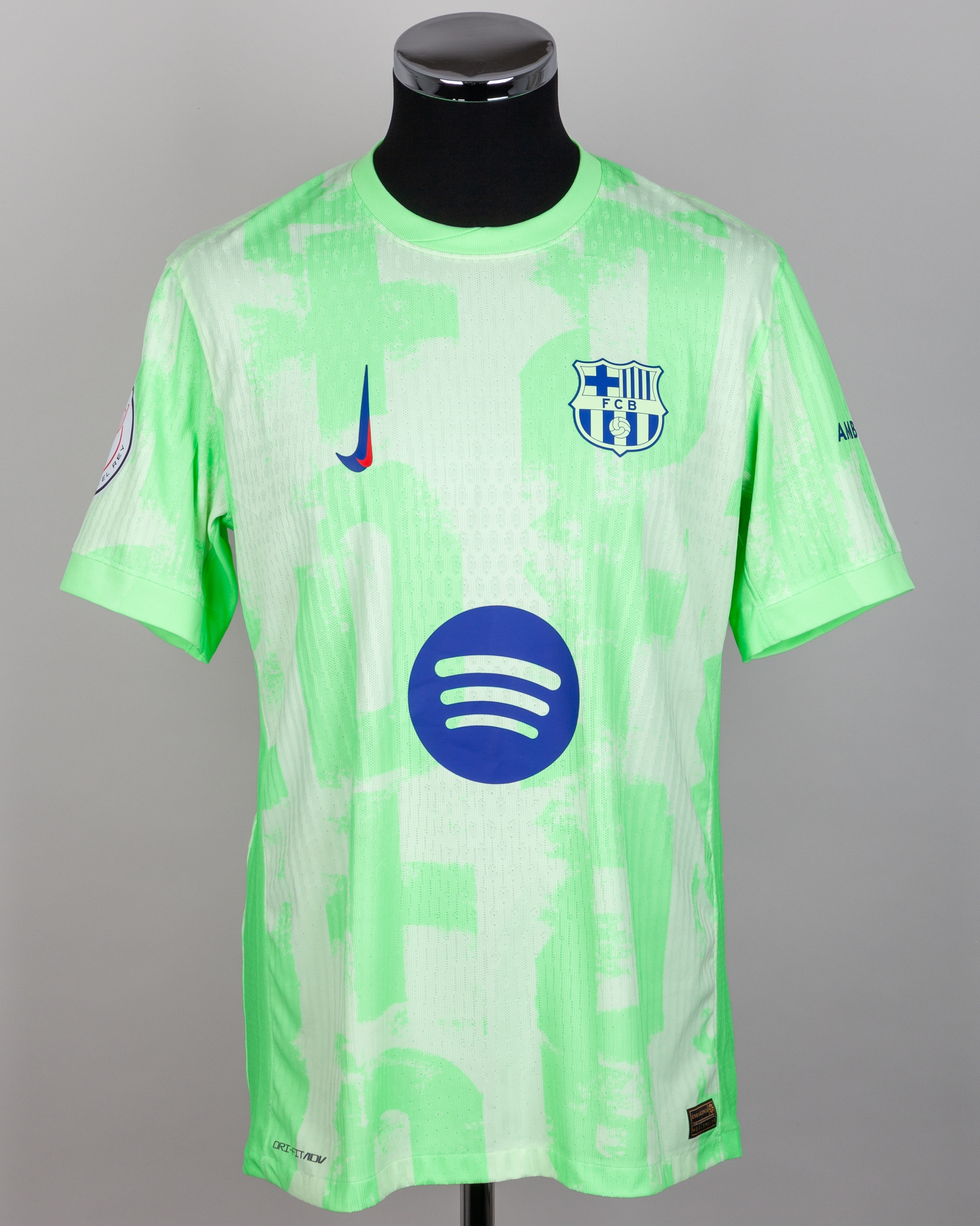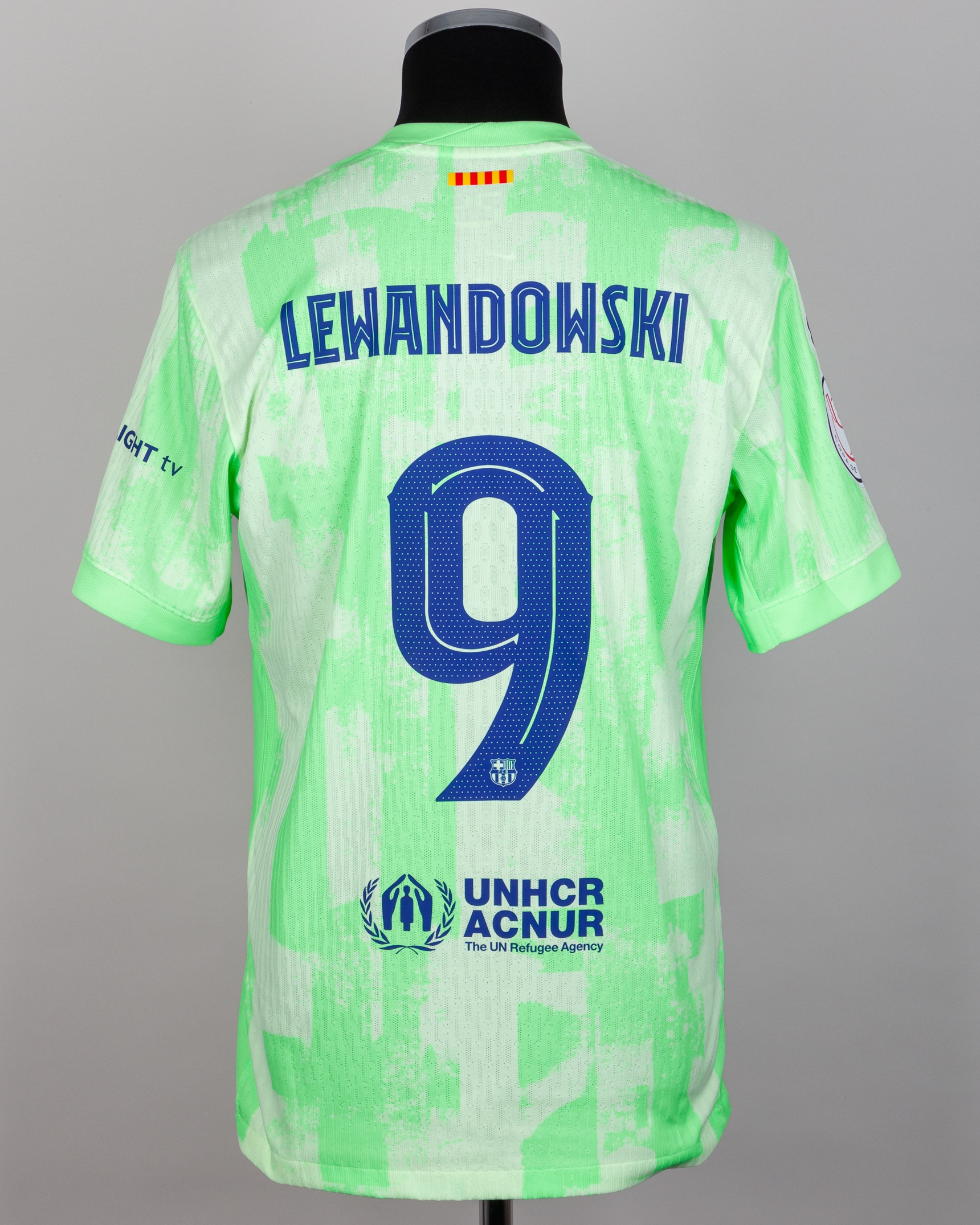 Robert Lewandowski lime green No.9 Barcelona short-sleeved shirt, Nike, L, with crew-neck collar and printed badge, the reverse lettered LEWANDOWSKI, the right sleeve with 31 RFEF Copa De S.M. El Rey flash