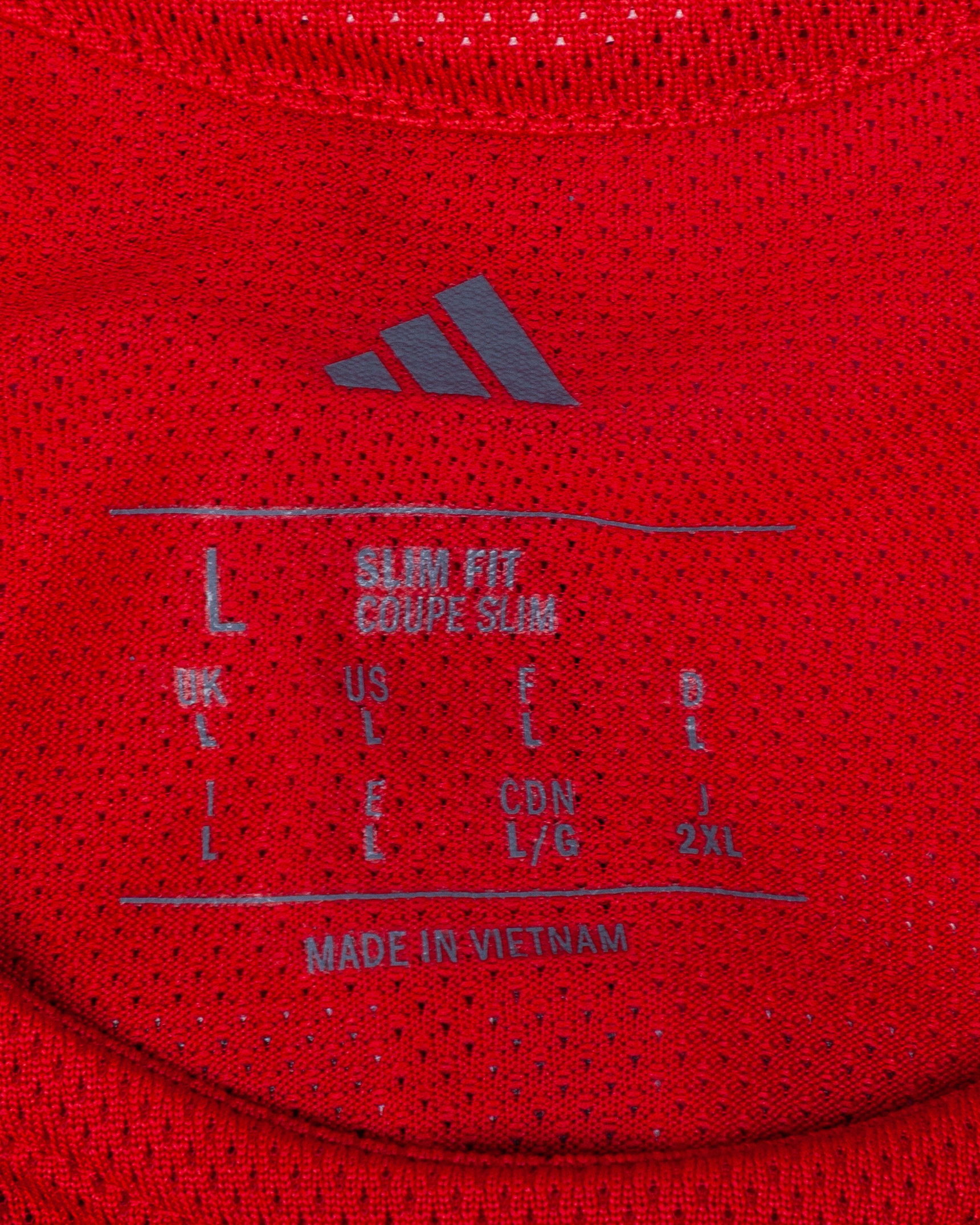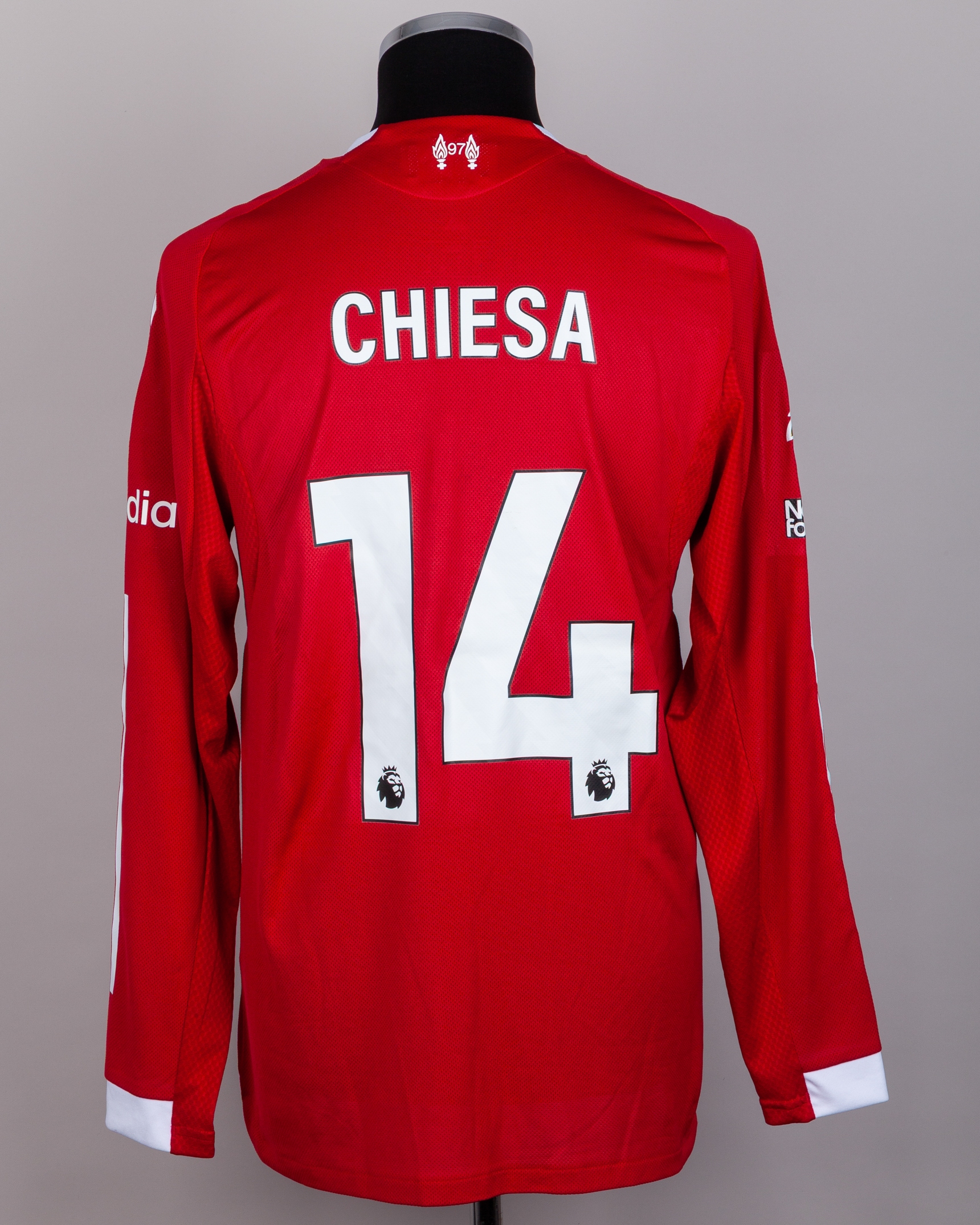 Federico Chiesa red and white No.14 Liverpool long-sleeved shirt, 2025-26, Adidas, size L, crew-neck collar with club crest, Premier League sleeve flashes, reverse lettered CHIESA