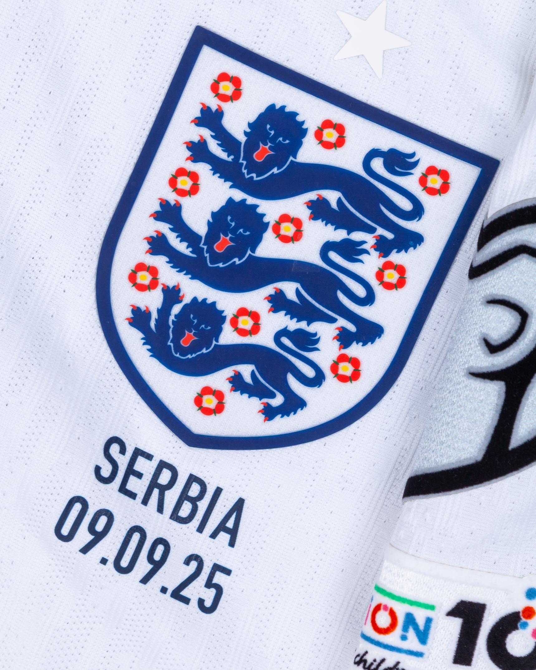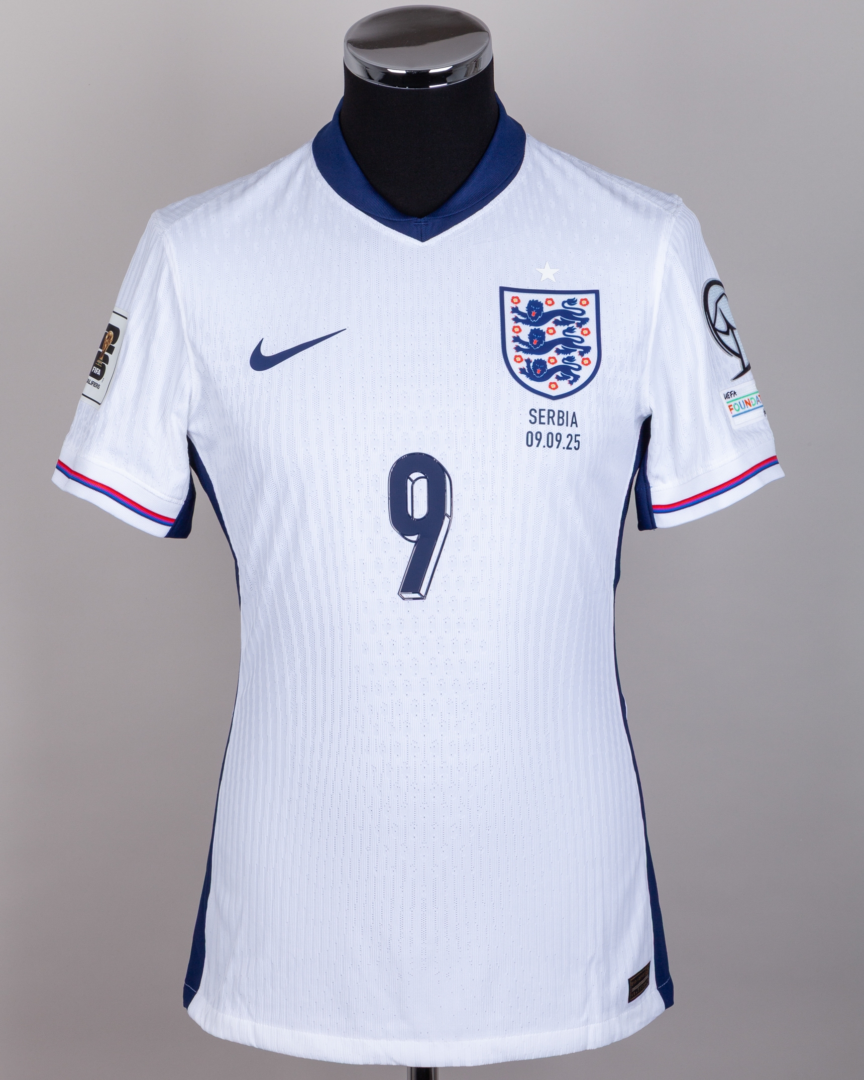 Harry Kane white and navy No.9 England short-sleeved shirt v. Serbia, 9th September 2025, Nike, size M, v-neck collar, with country emblem and SERBIA 09.09.25, FIFA 2026 sleeve flashes, reserve lettered KANE