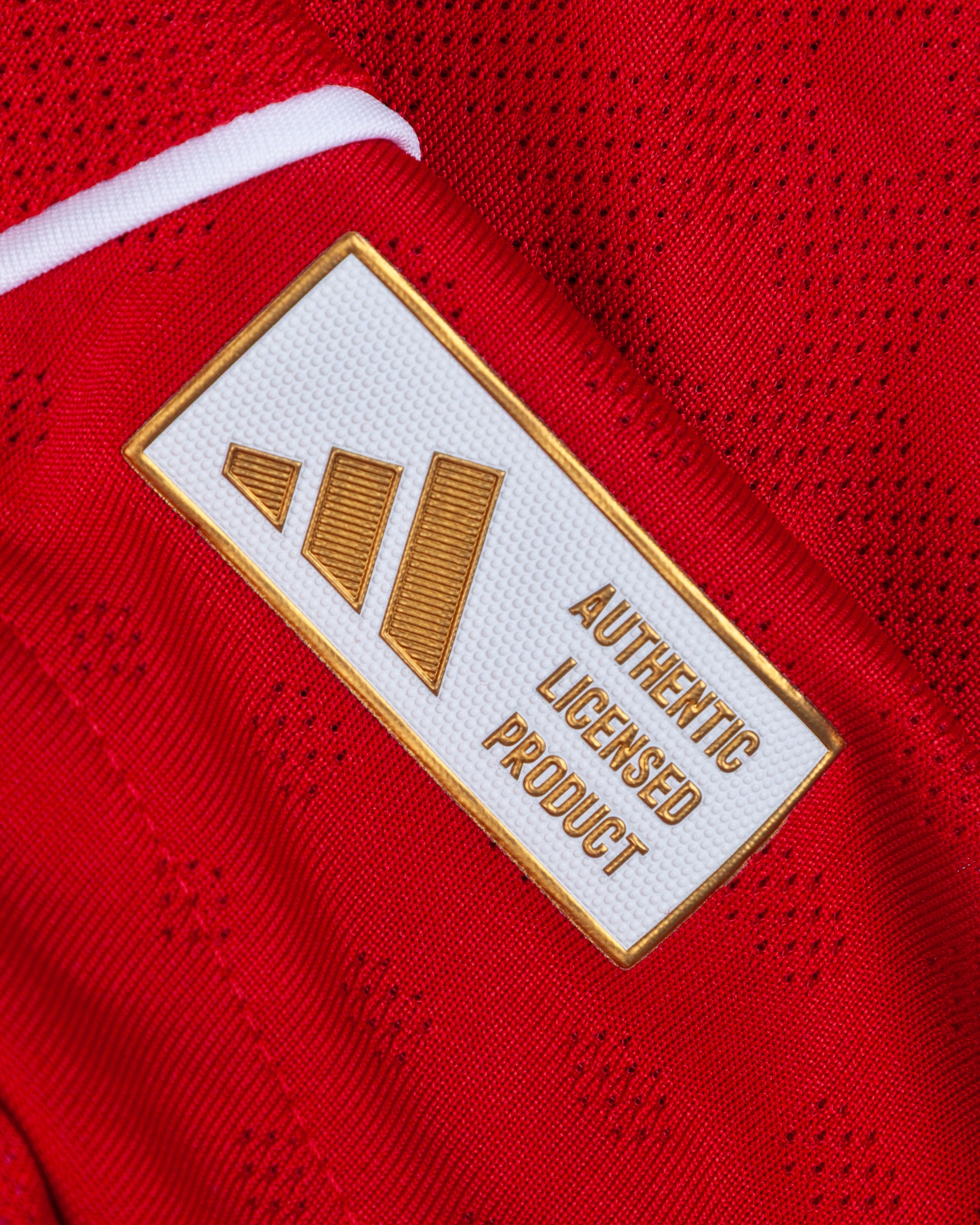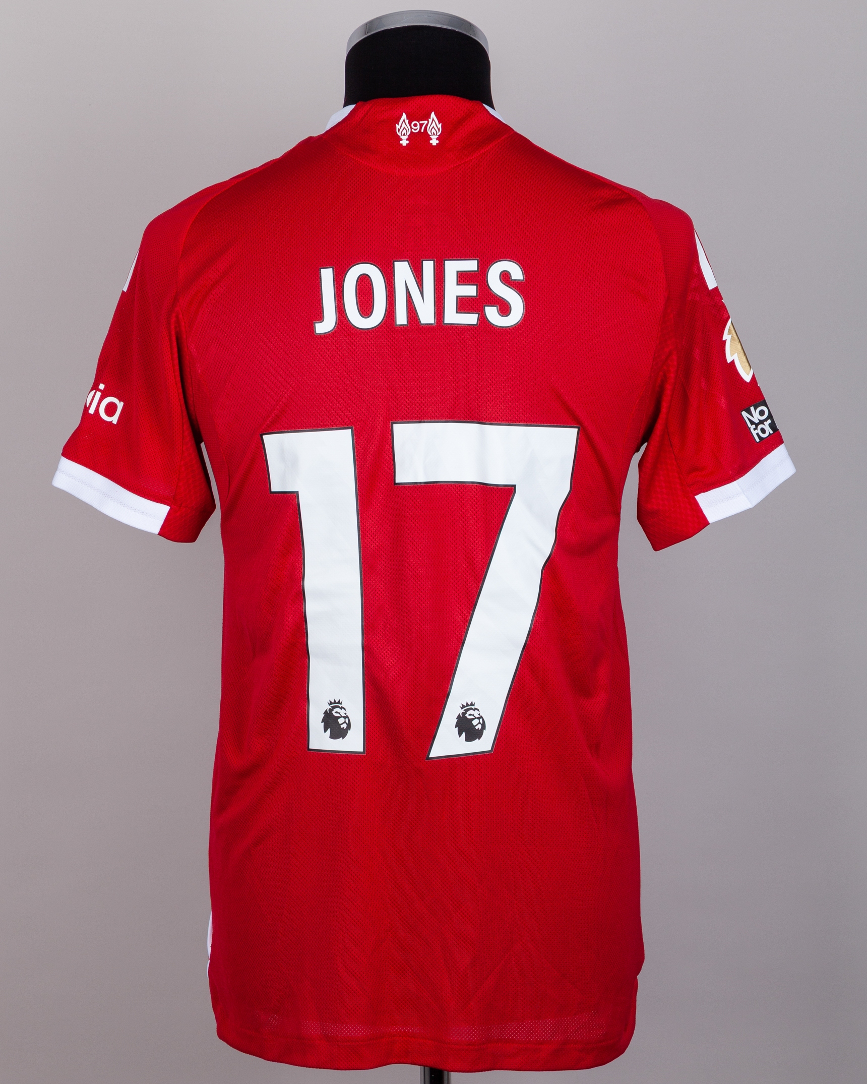 Curtis Jones red and white No.17 Liverpool short-sleeved shirt, 2025-26, Adidas, size M, crew neck collar, with club crest and Premier League sleeve flashes, reverse lettered JONES
