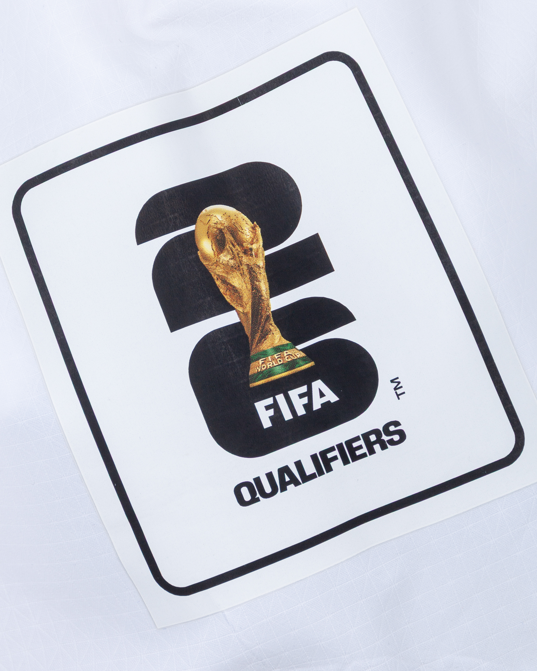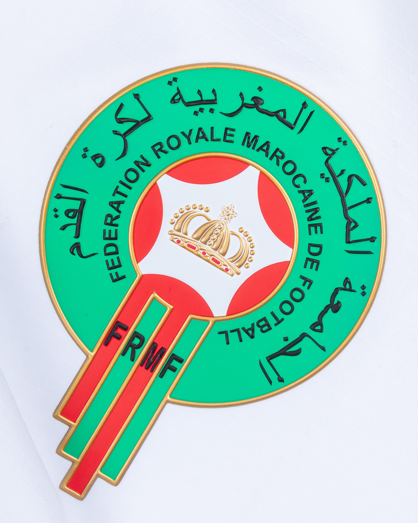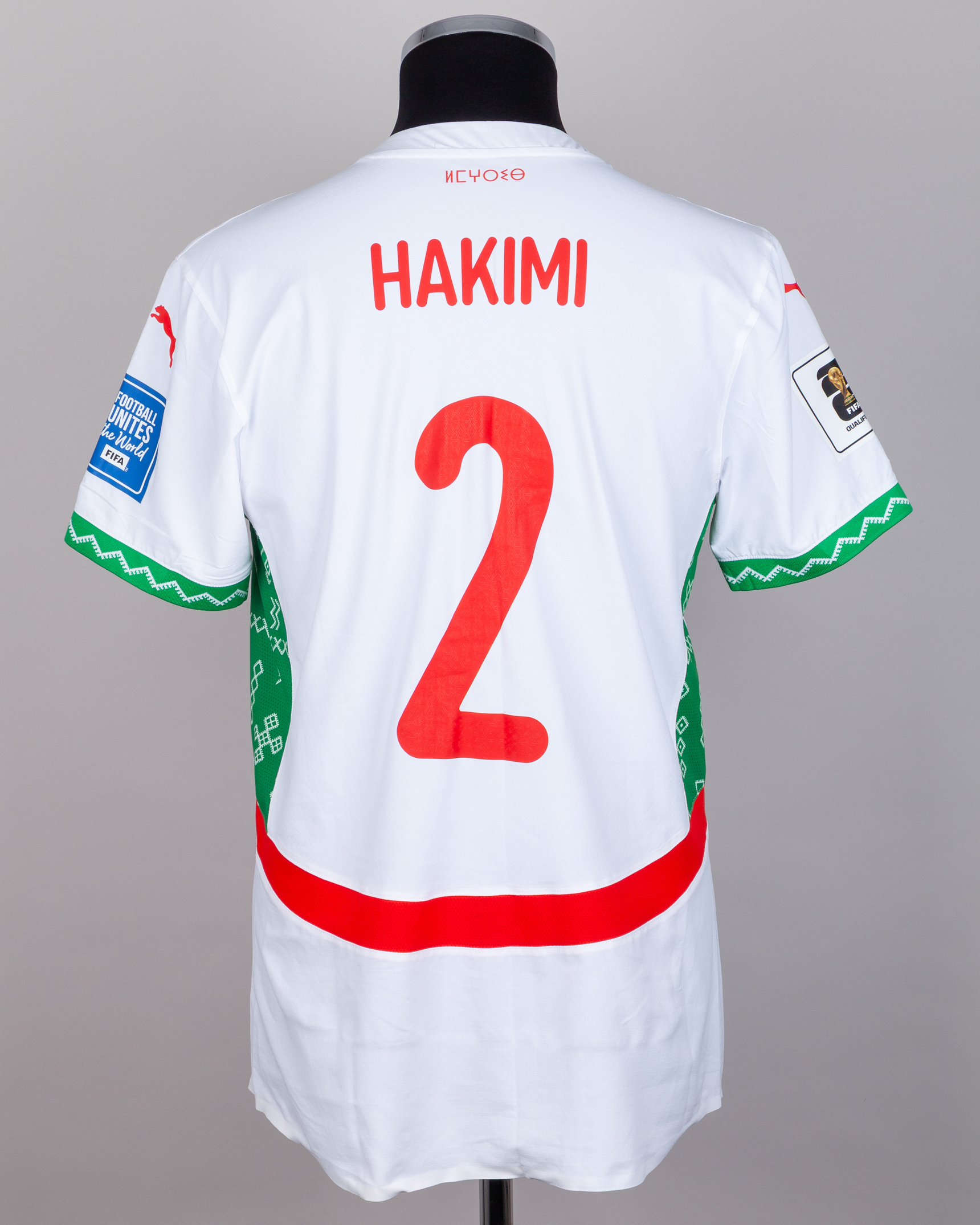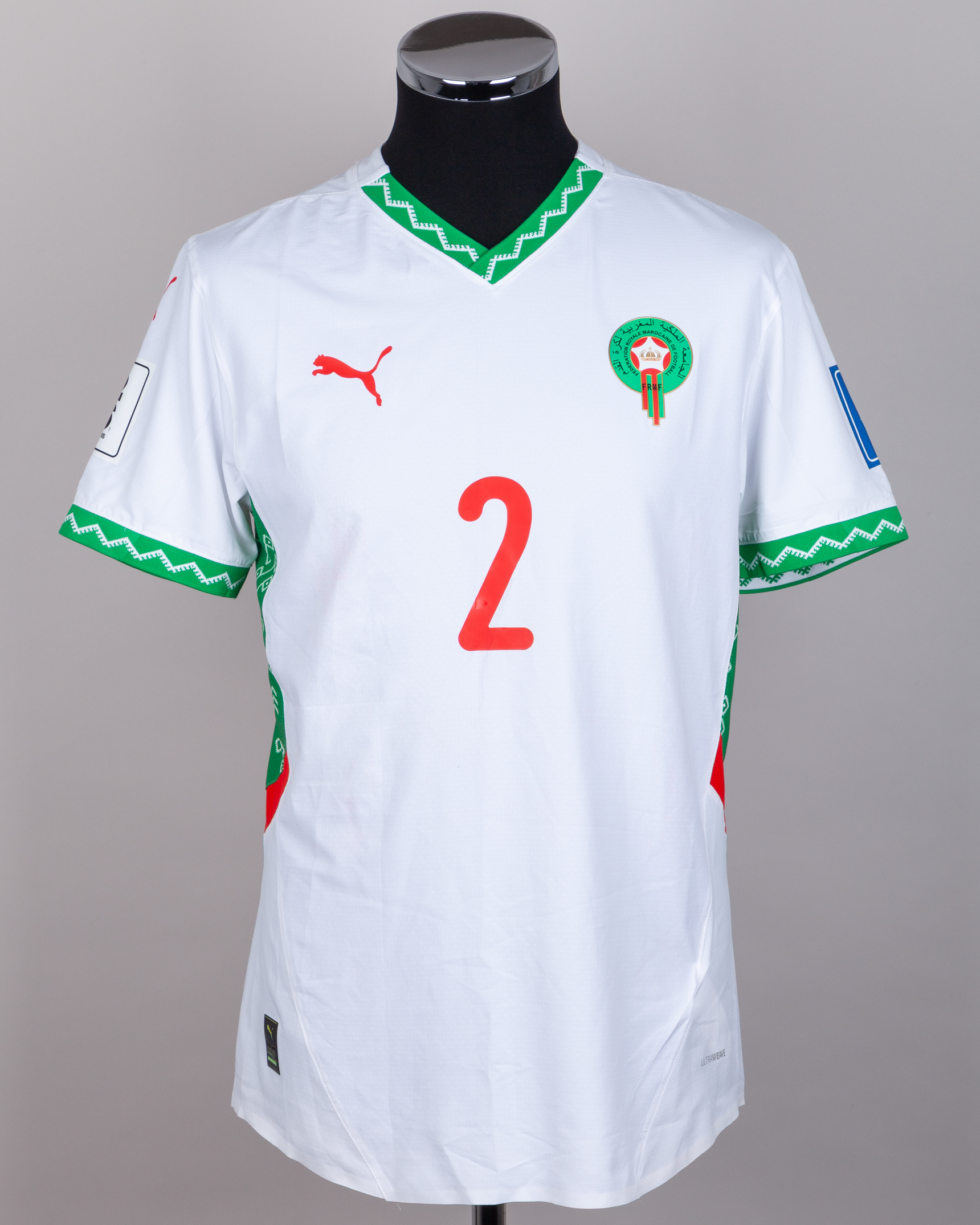 Achraf Hakimi white and red No.2 Morocco short-sleeved shirt, Puma, M, with v-neck collar and printed badge, the reverse lettered HAKIMI, the right sleeve with FIFA 26 qualifiers flash
