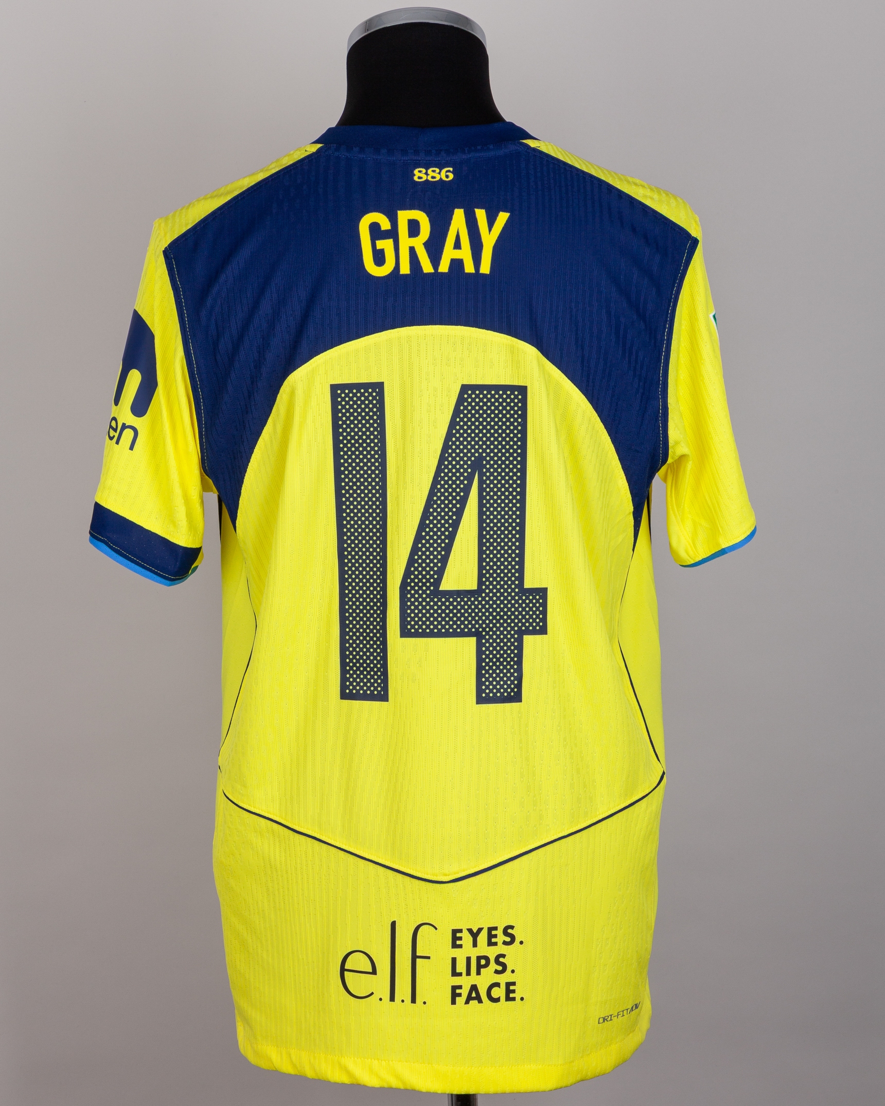 Archie Gray yellow, navy, sky blue No.14 Tottenham Hotspur ‘Poppy’ short-sleeved Third choice shirt, 2025-26, Nike, size M, v-neck collar, with club crest and Poppy emblem, CARABAO Cup sleeve flashes, reverse lettered GRAY