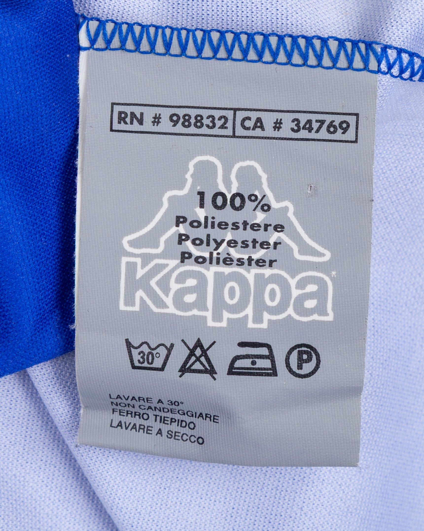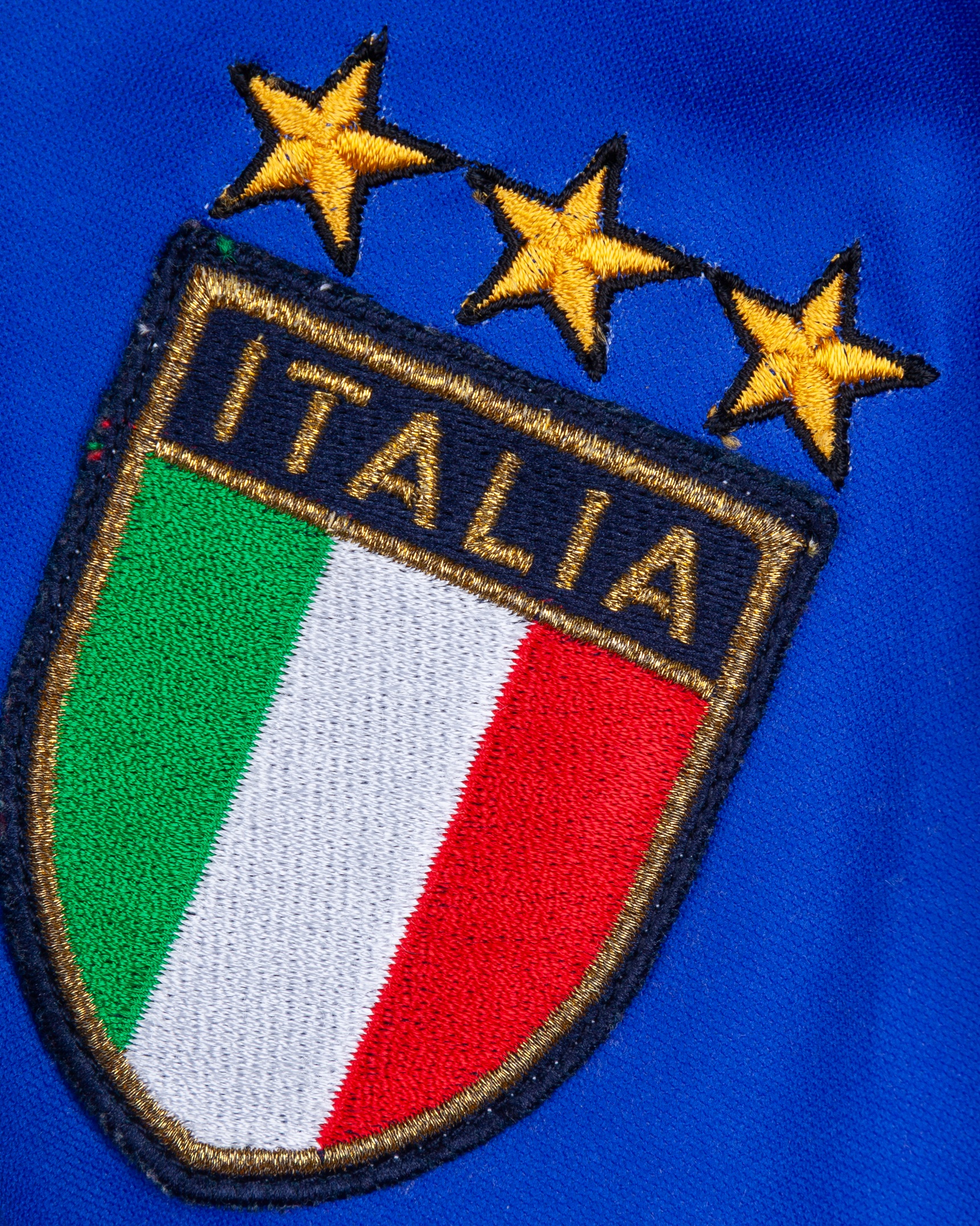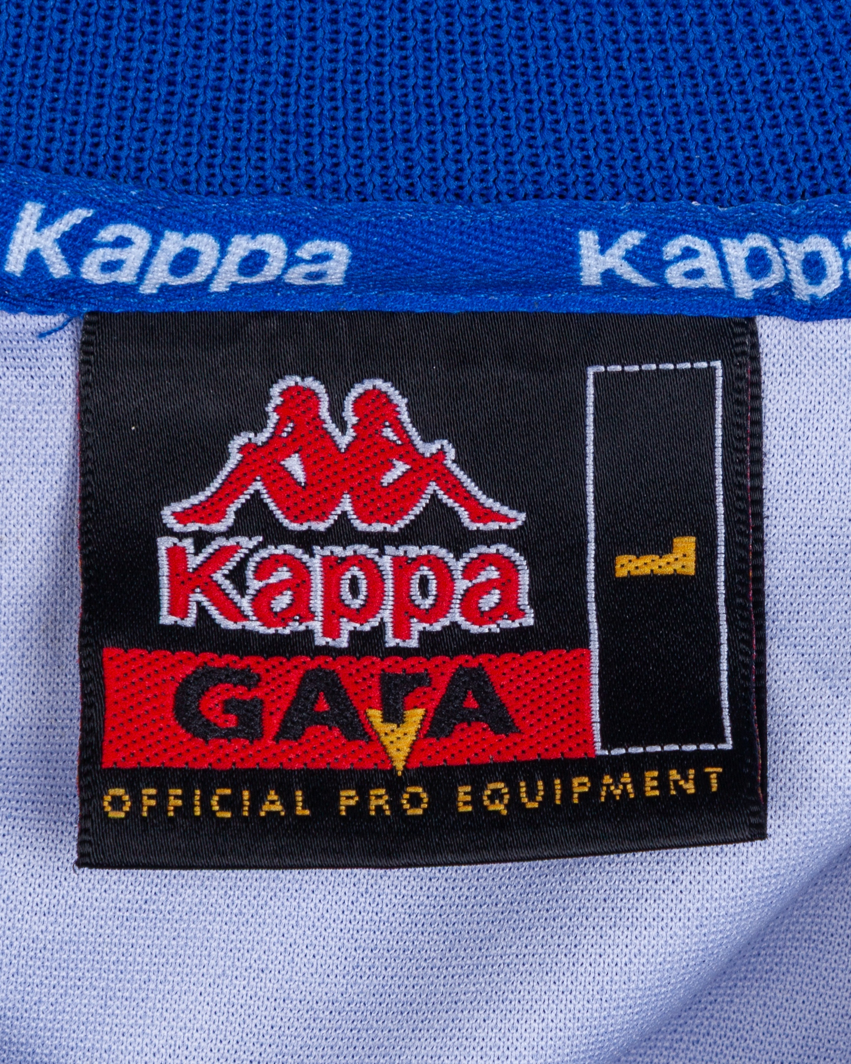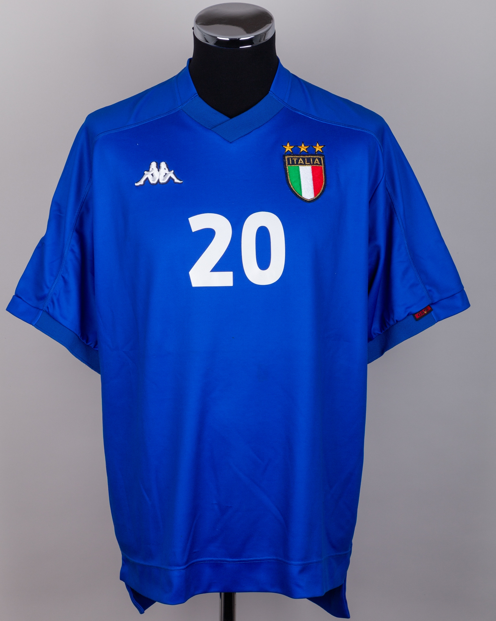 Francesco Totti blue No.20 Italy v. Portugal match worn short-sleeved shirt, 2000, Kappa, L, with v-neck collar and embroidered cloth badge inscribed ITALIA, the number with some wear and a pull on the back
