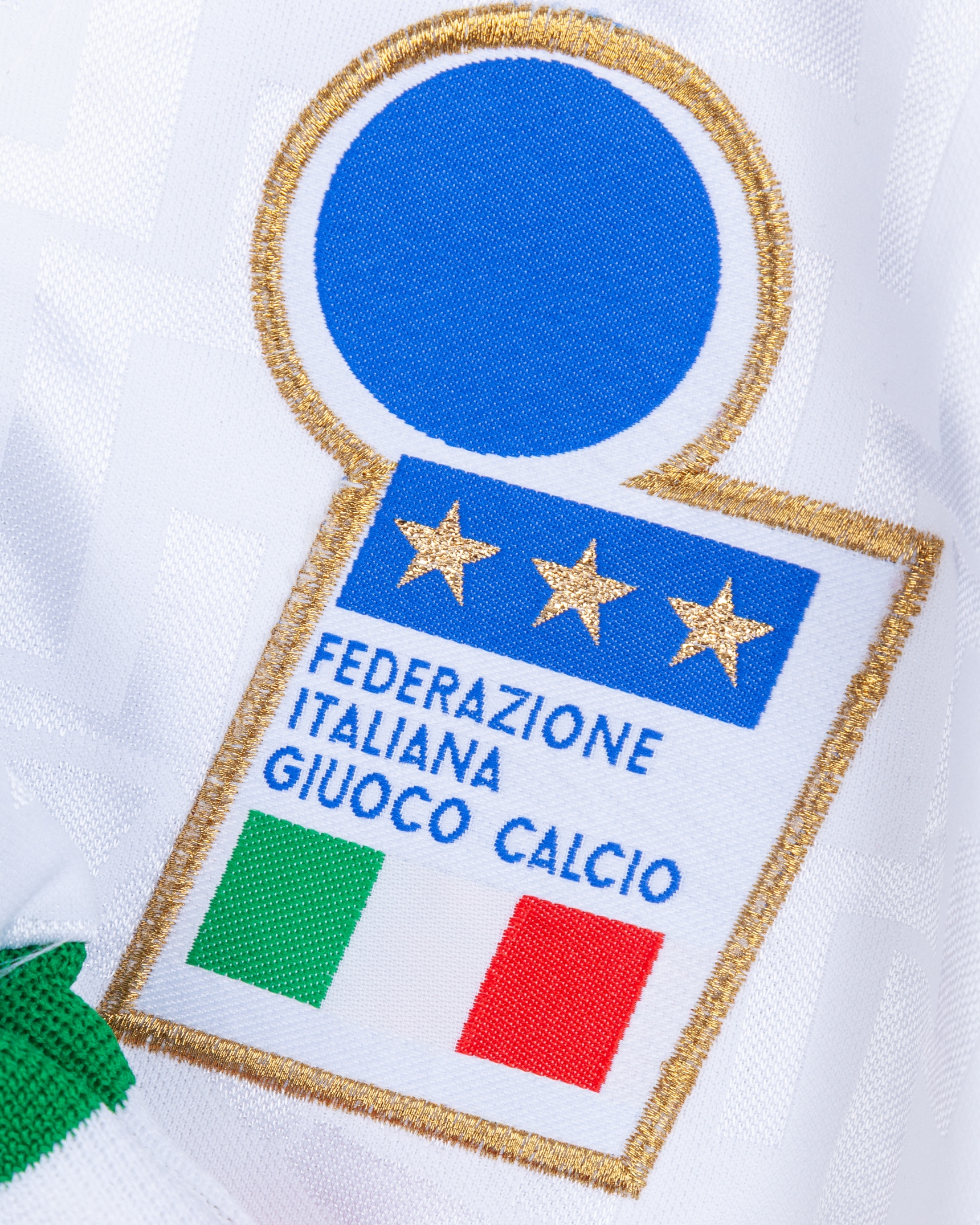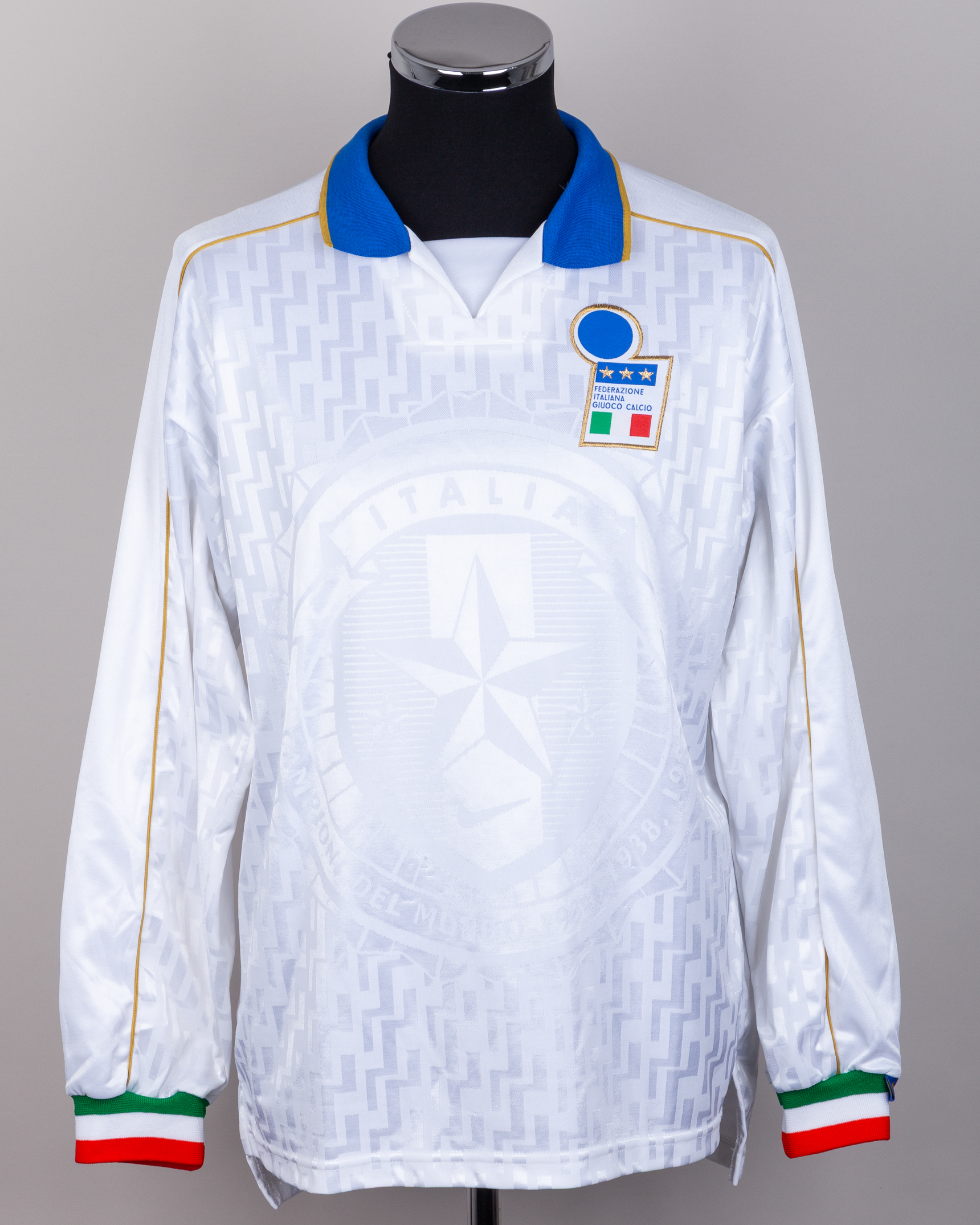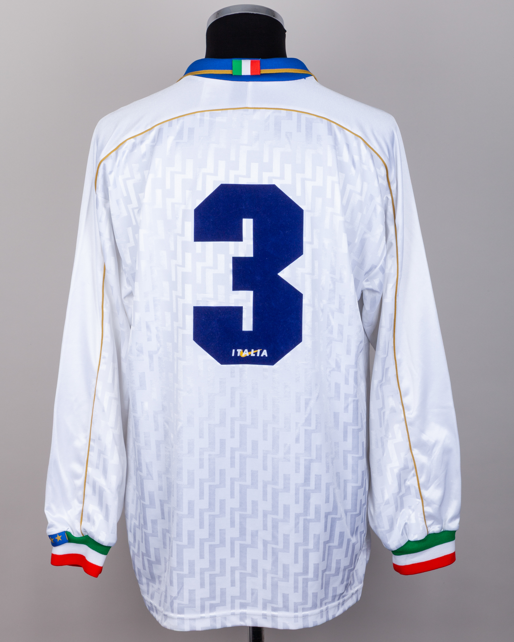 Paolo Maldini white No.3 Italy v. Ukraine long-sleeved shirt, 1995, Nike, L, with v-neck collar and embroidered cloth badge inscribed FEDERAZIONE ITALIANA GIUOCO CALCIO
