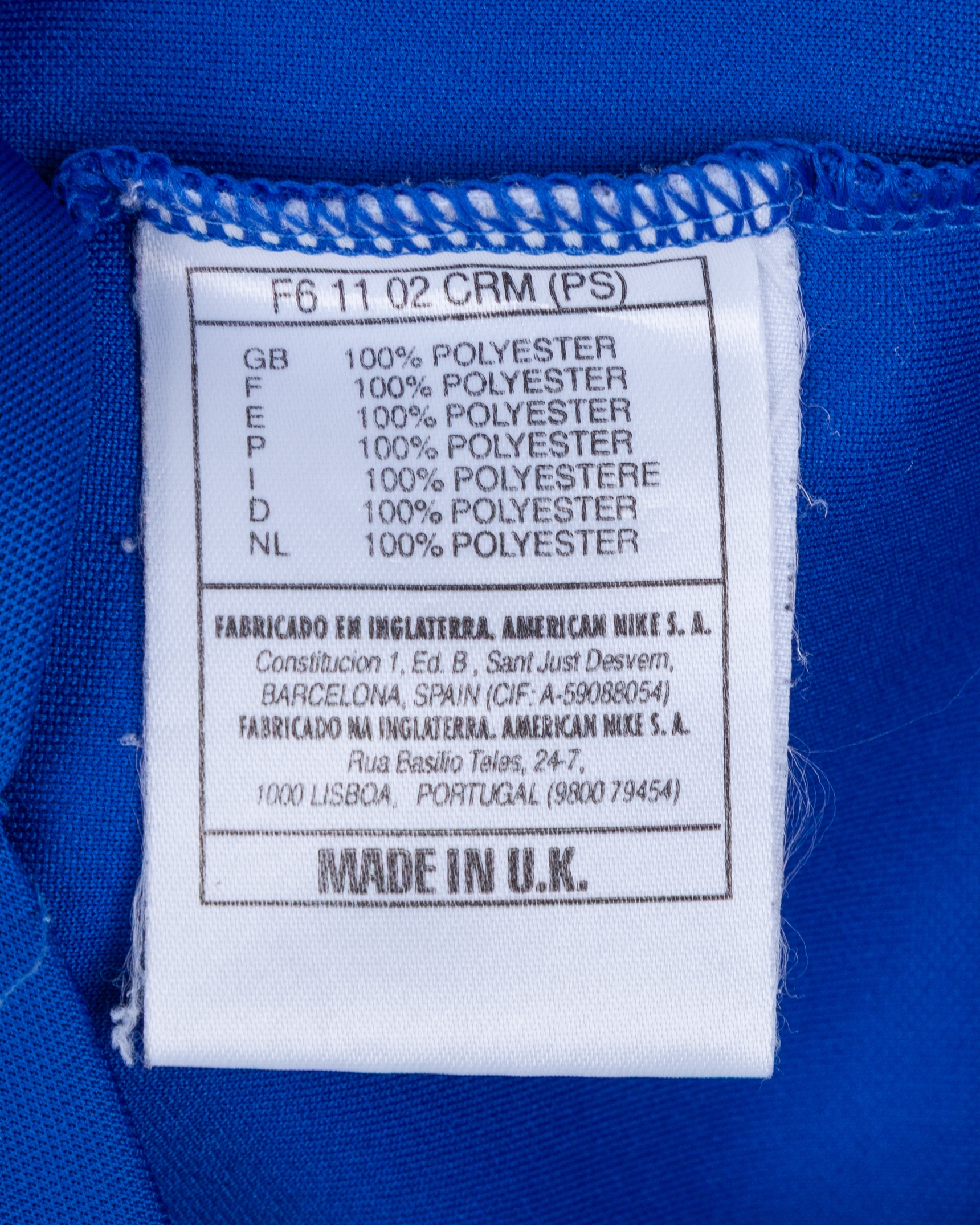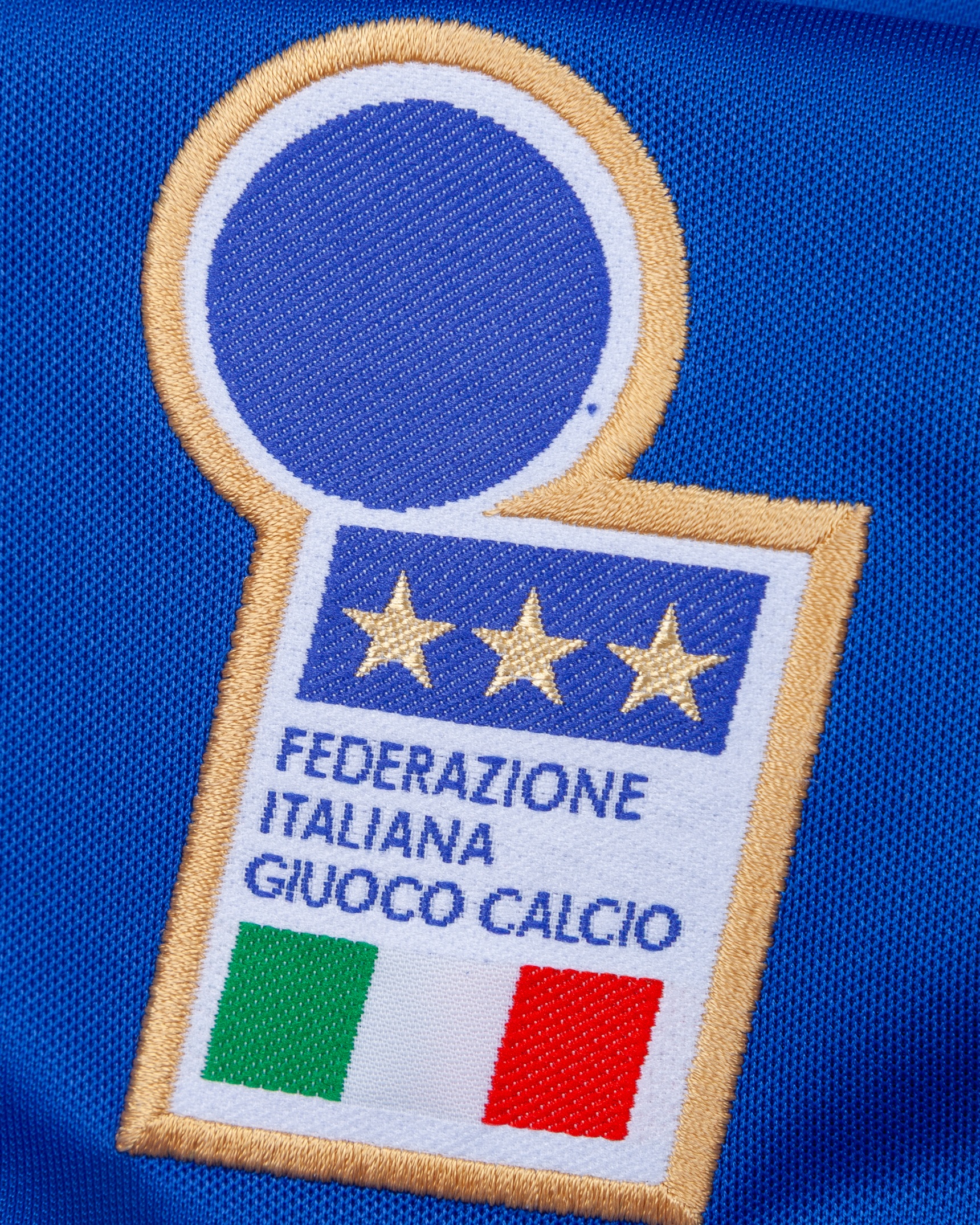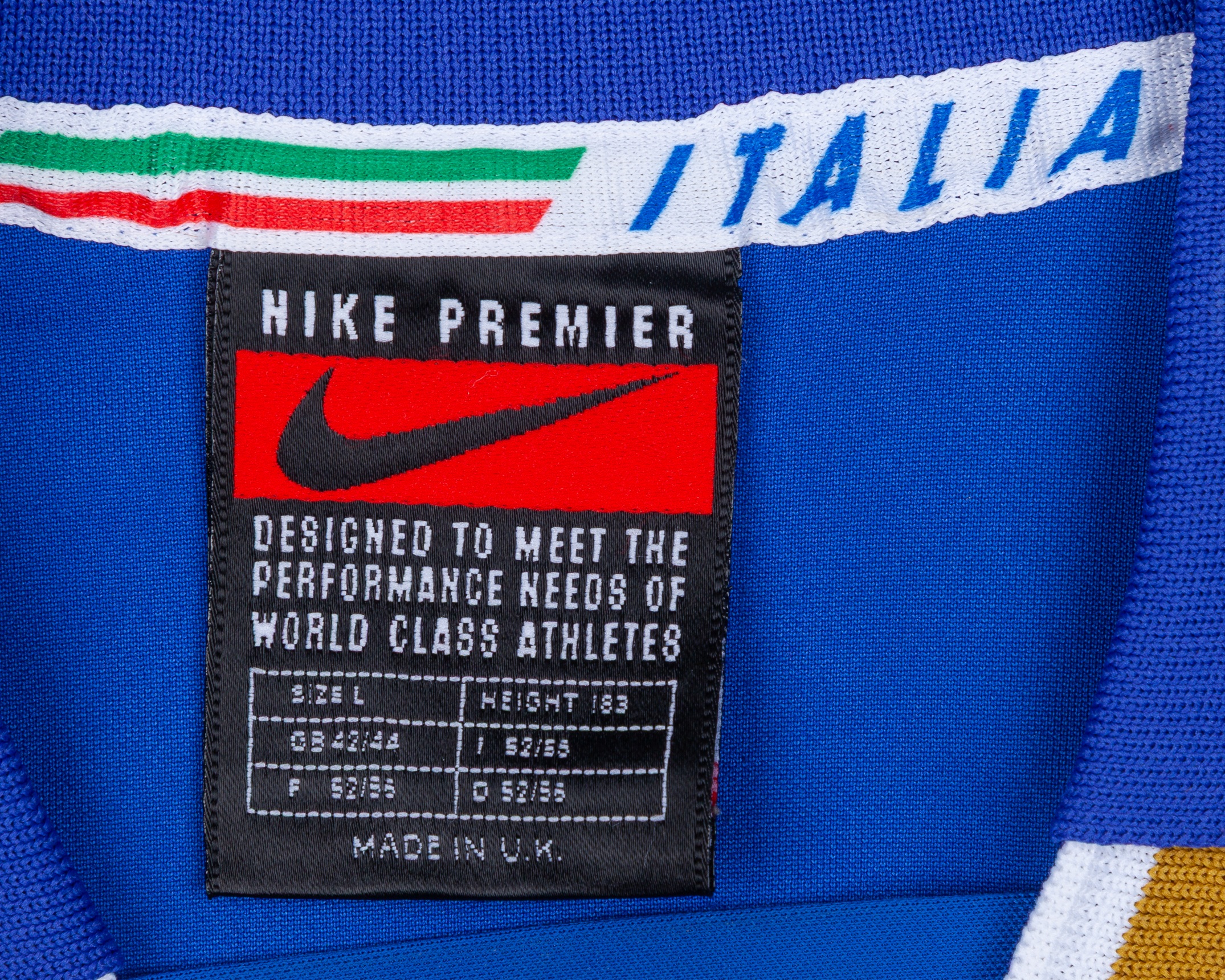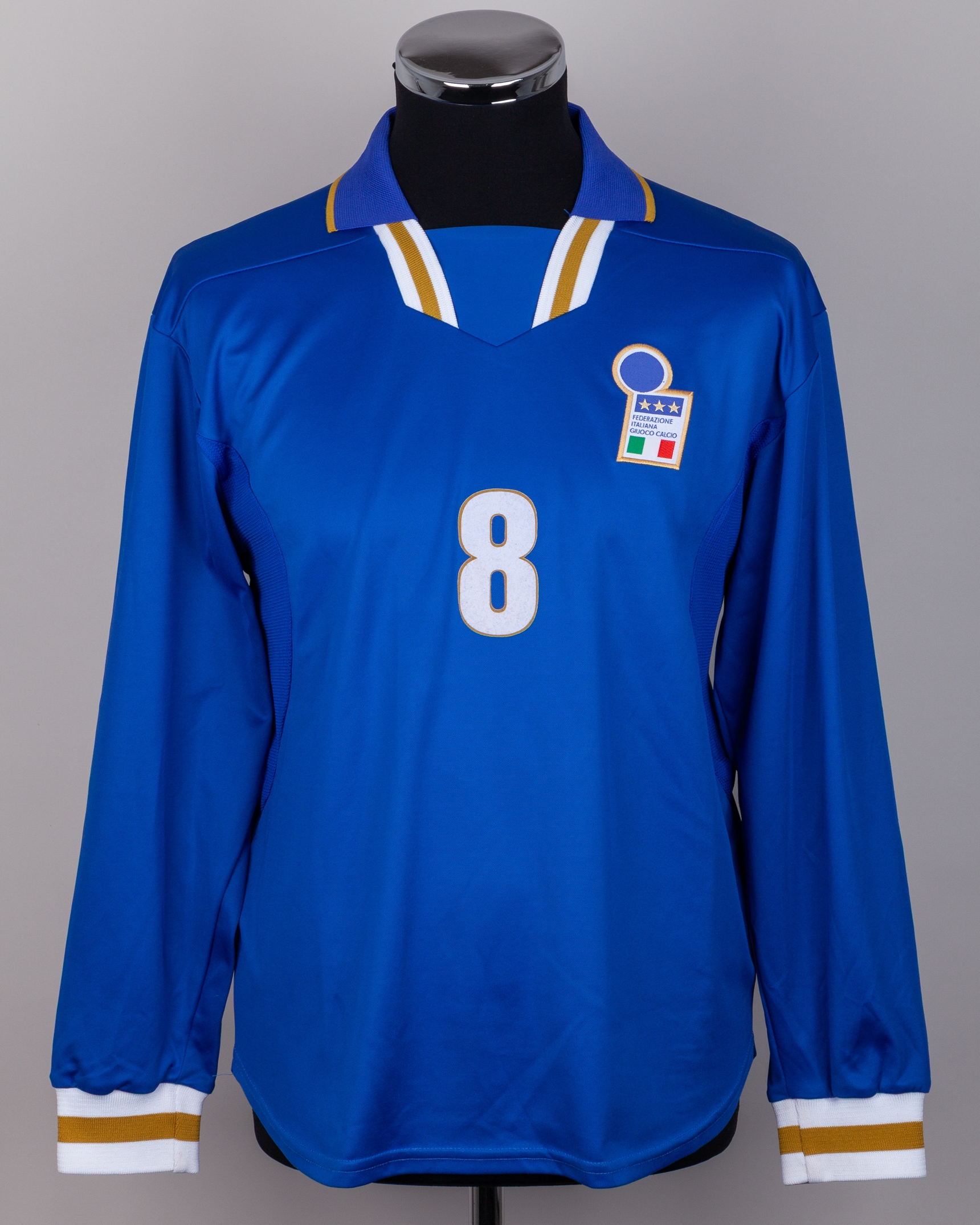 Antonio Conte blue No.8 Italy v. Georgia match worn long-sleeved shirt, 1996, Nike, L, with v-neck style collar and embroidered cloth badge inscribed FEDERAZIONE ITALIANA GIUOCO CALCIO