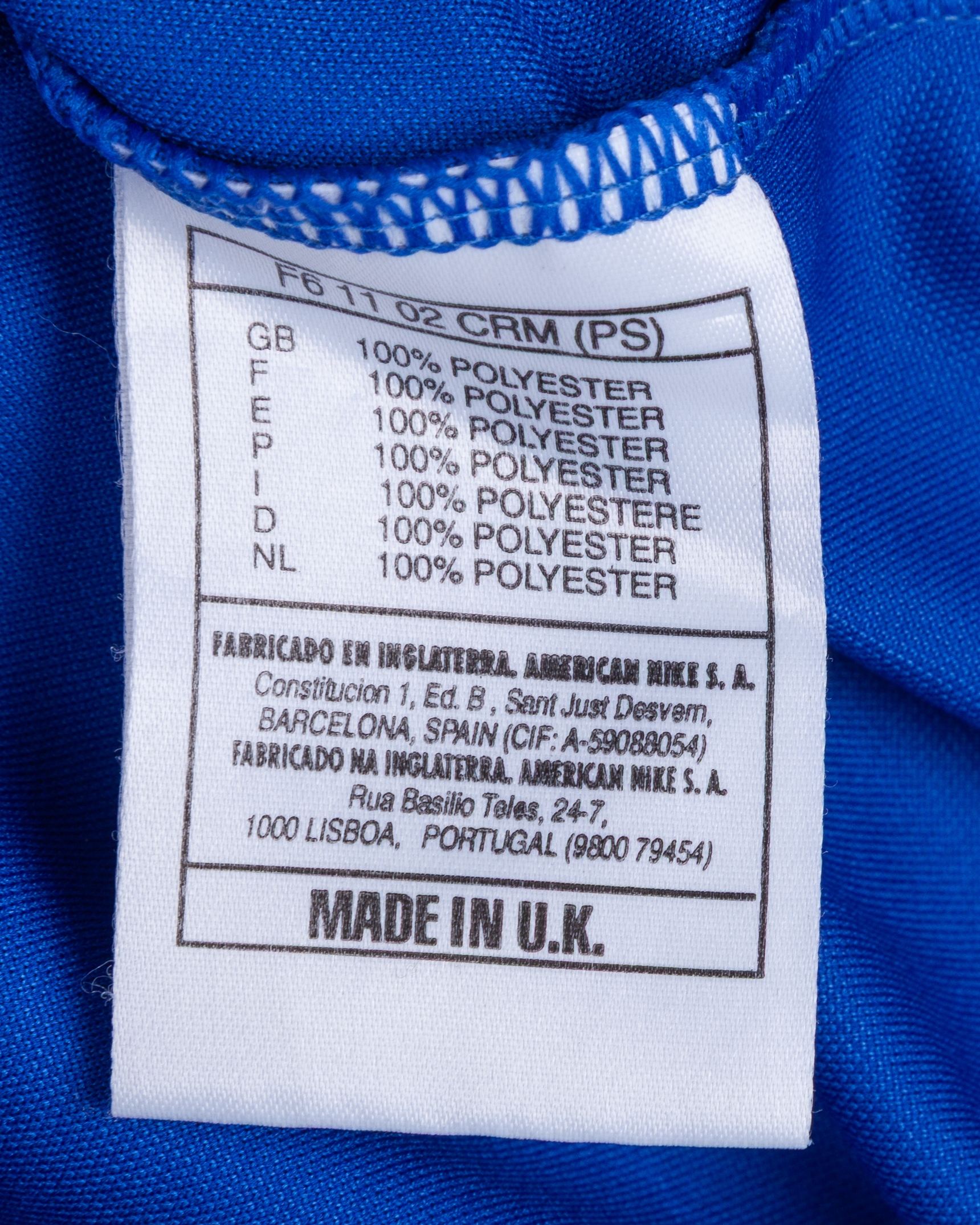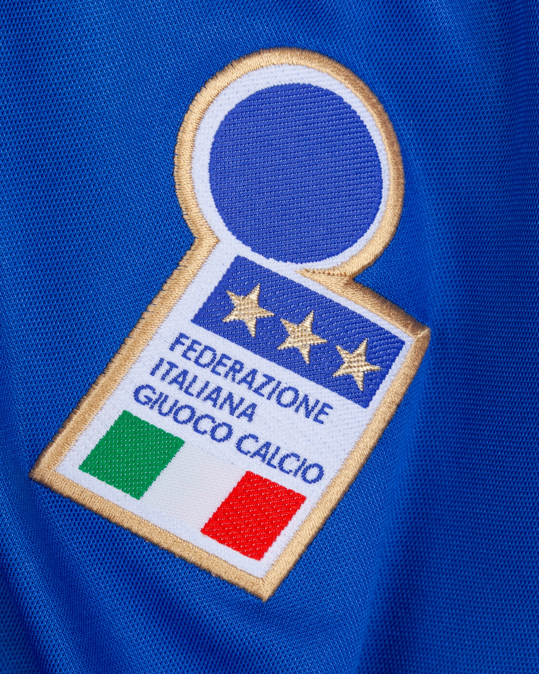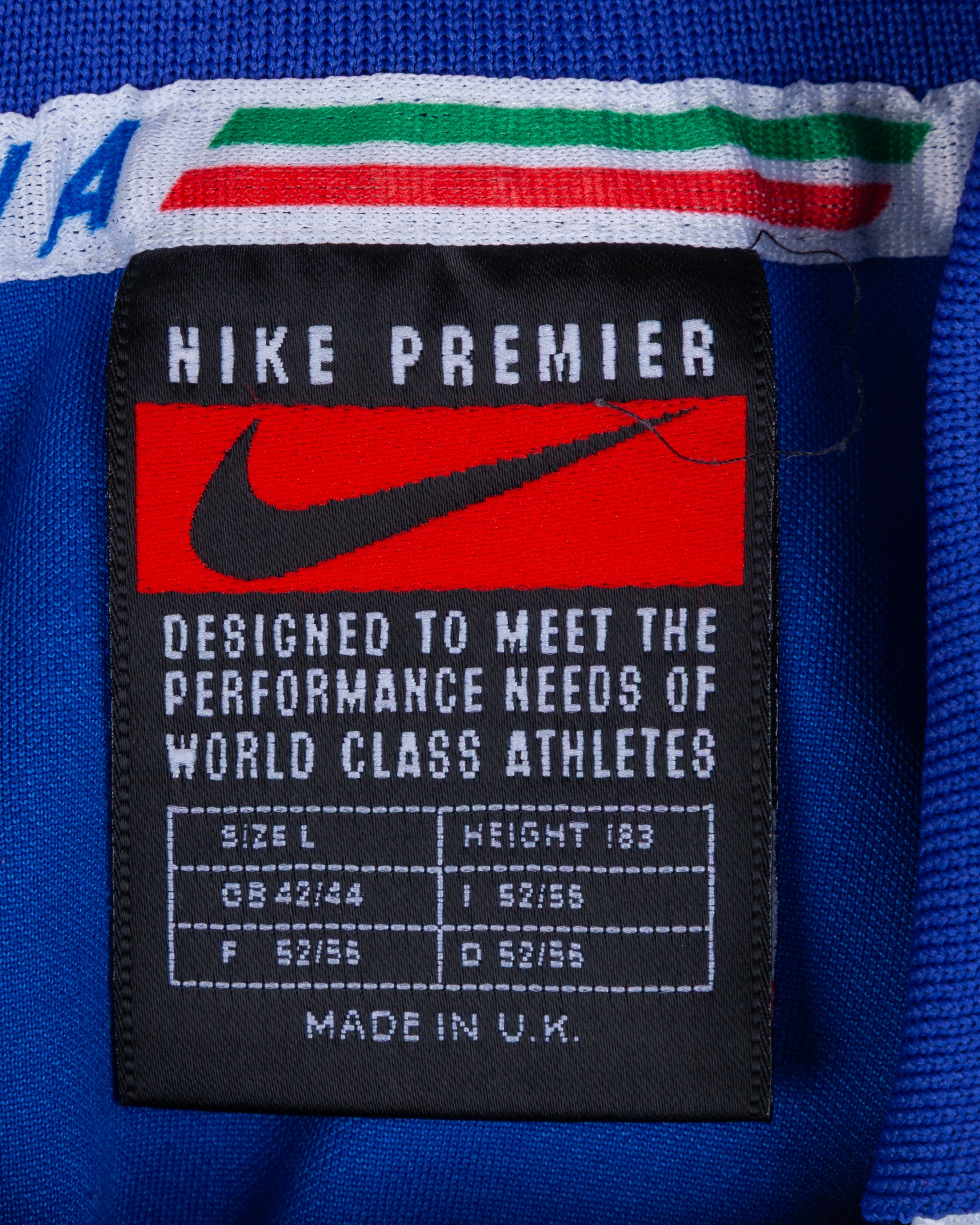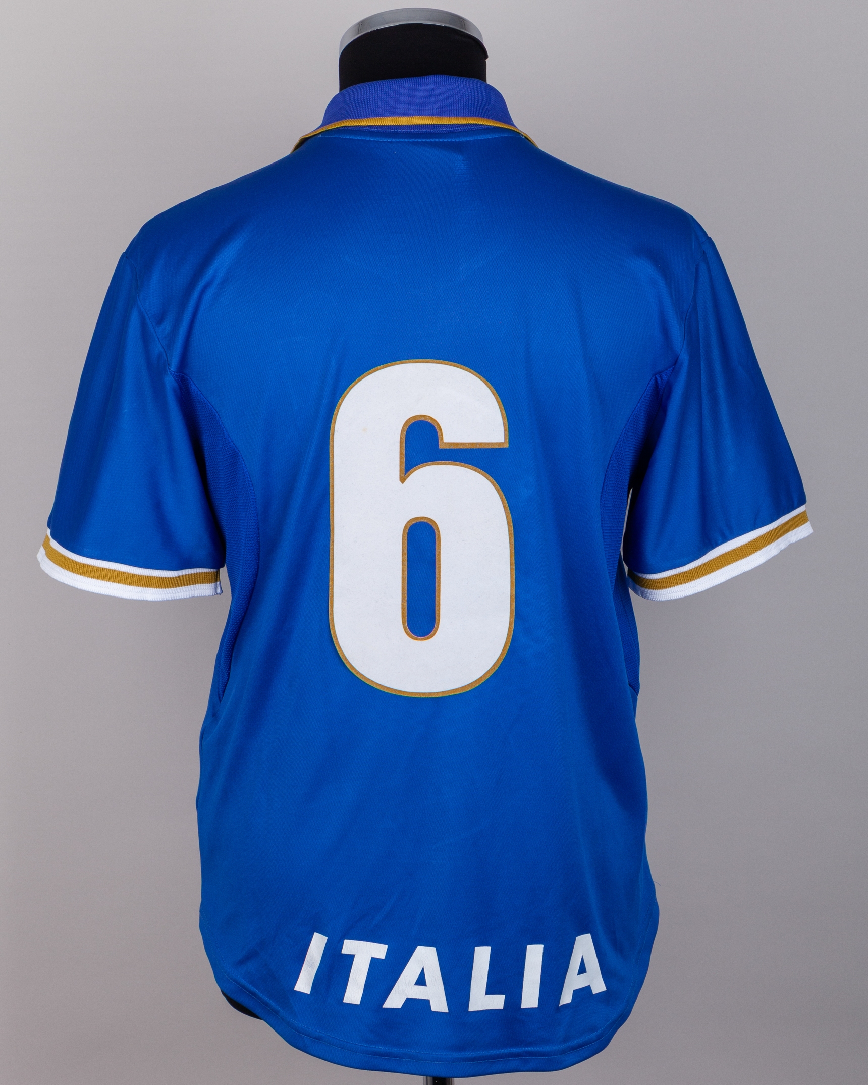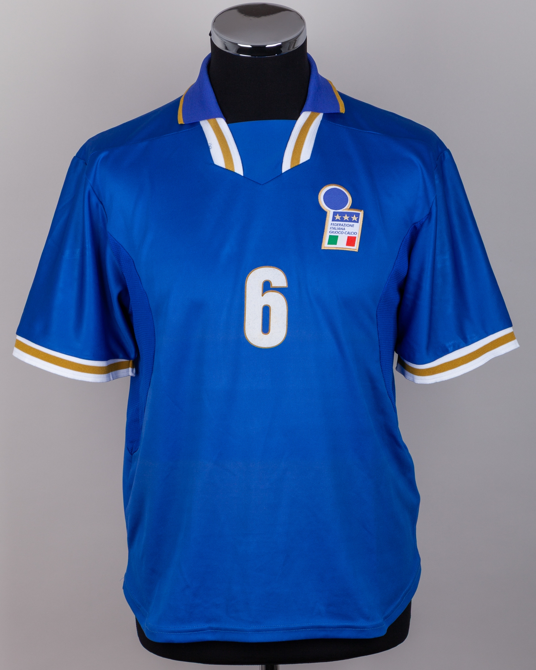 Alessandro Costacurta blue No.6 Italy v. England match worn short-sleeved shirt, 1997, Nike, L, with v-neck style collar and embroidered cloth badge inscribed FEDERAZIONE ITALIANA GIUOCO CALCIO, with discolouration on the lower section of the shirt