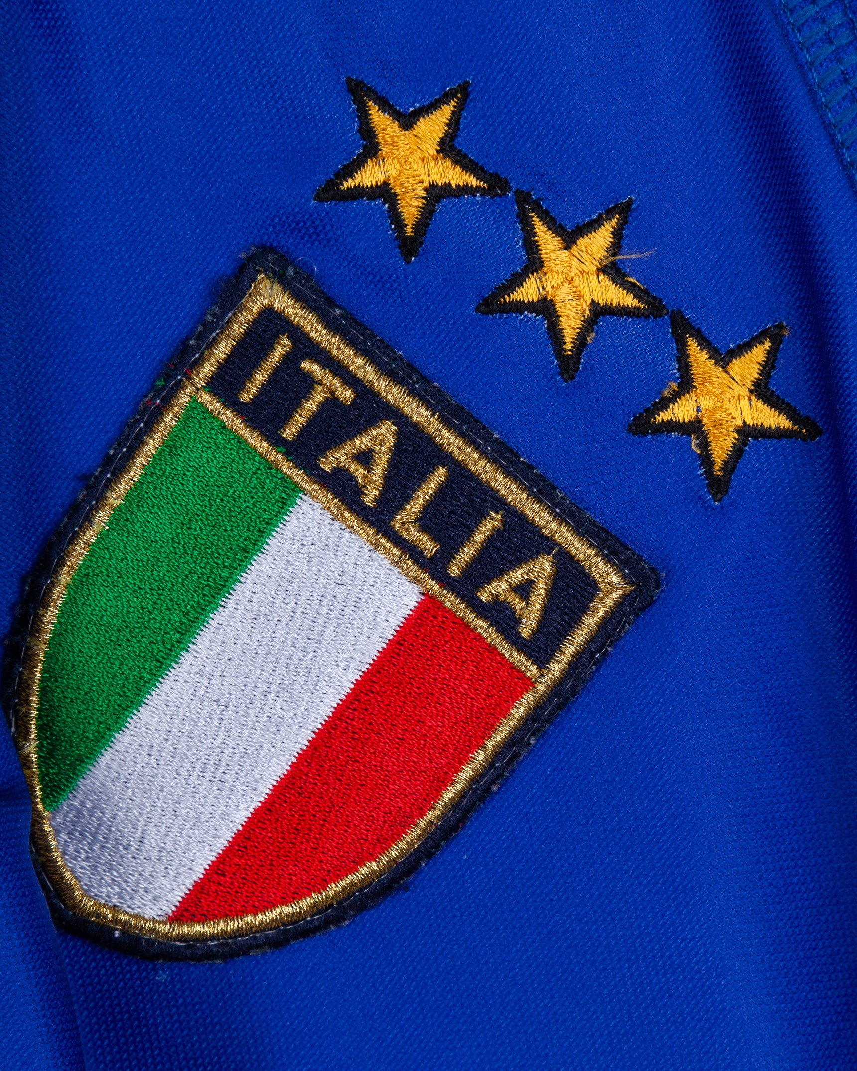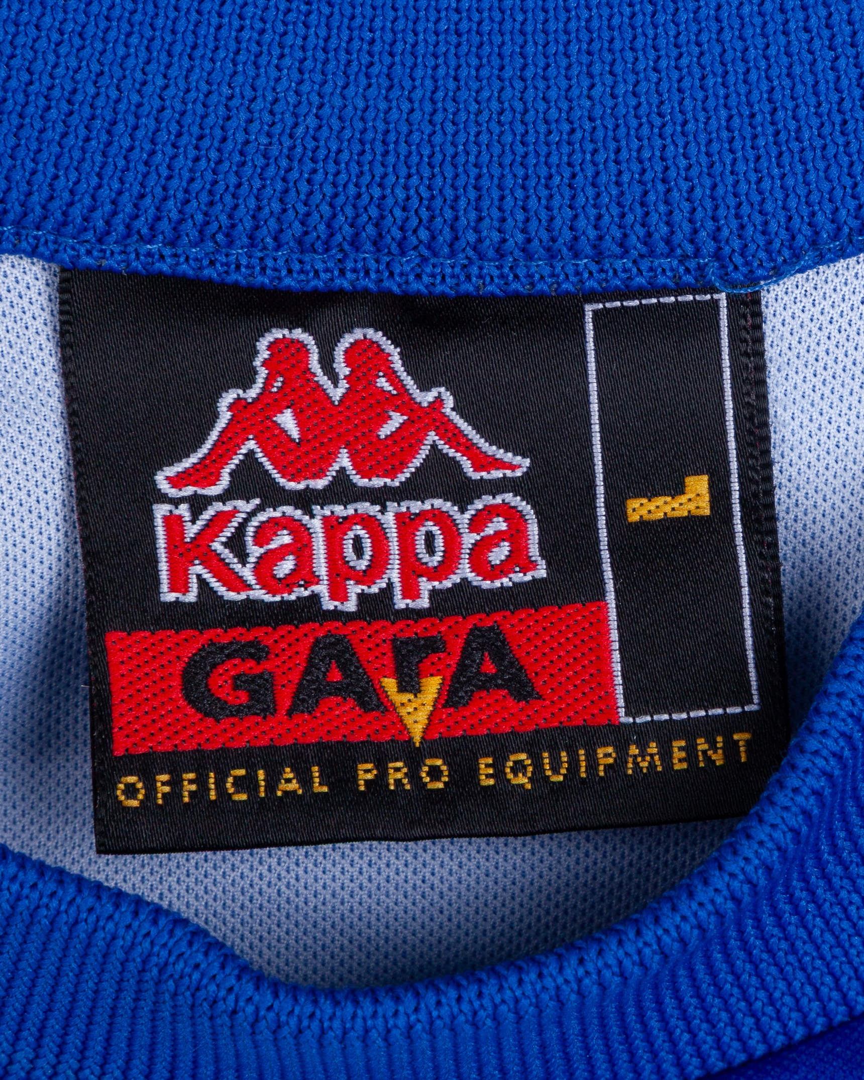 Demetrio Albertini blue No.4 Italy v. Belgium match worn long-sleeved shirt, 1999, Kappa, L, with crew-neck collar and embroidered cloth badge inscribed ITALIA