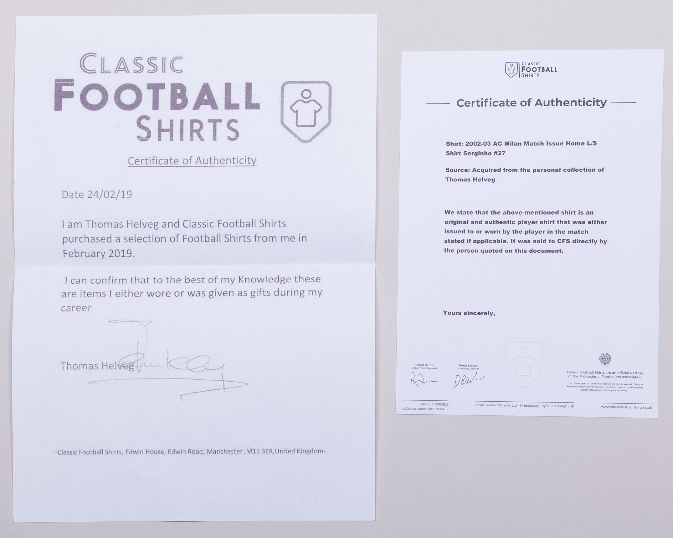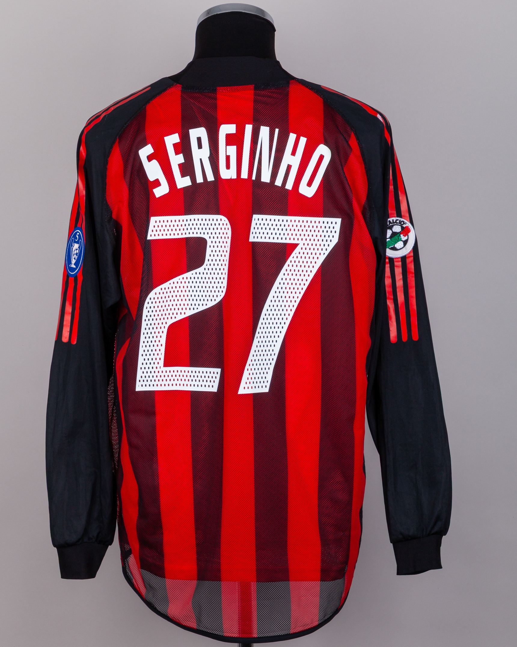 Serginho red and black No.27 AC Milan long-sleeved shirt, 2002-03, Adidas, XL, with v-neck collar and printed badge, the reverse lettered SERGINHO, the right sleeve with Lega Calcio flash and the left sleeve with 5 Champions League flash, with COA