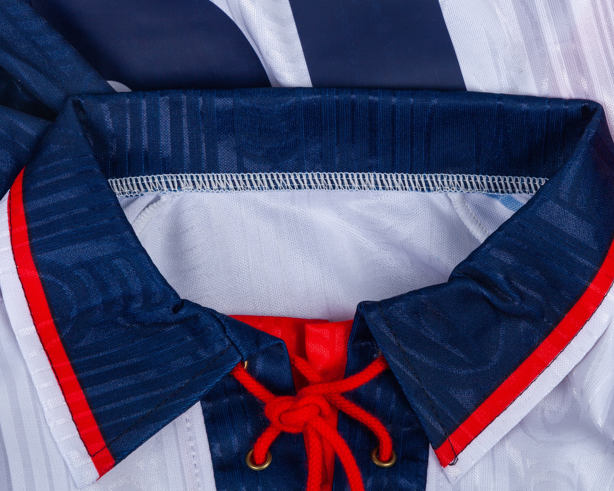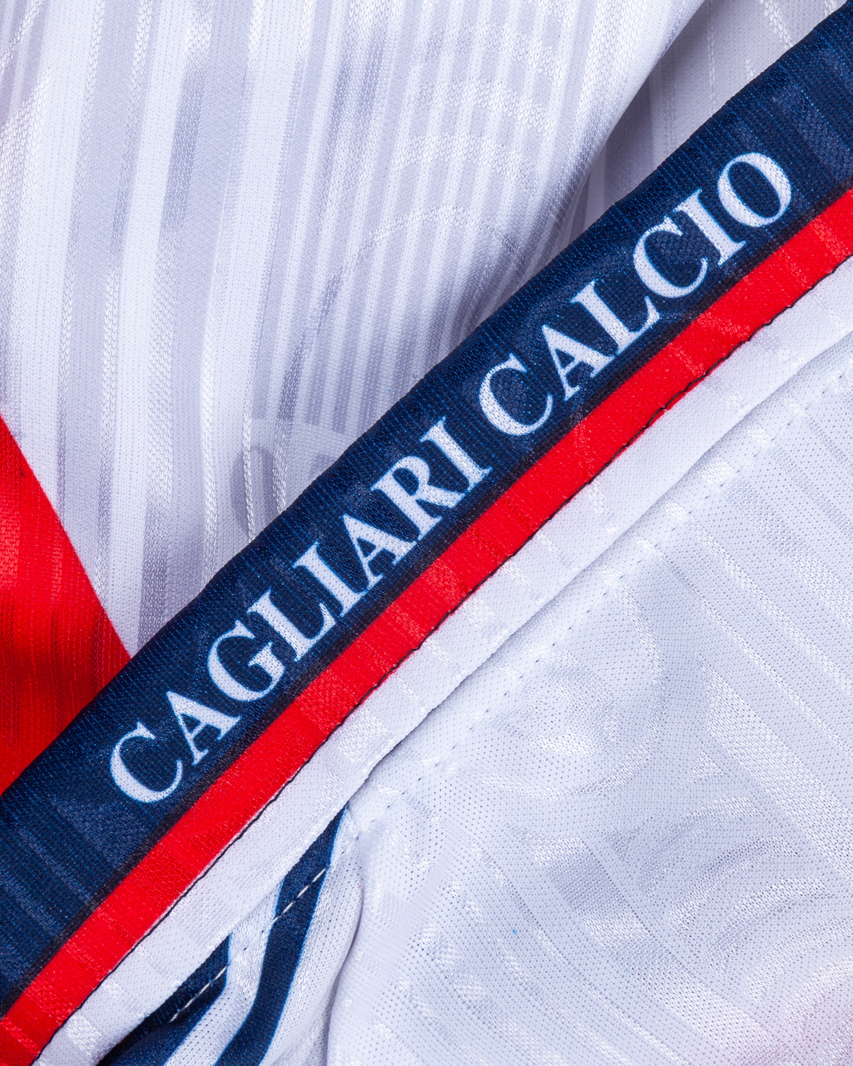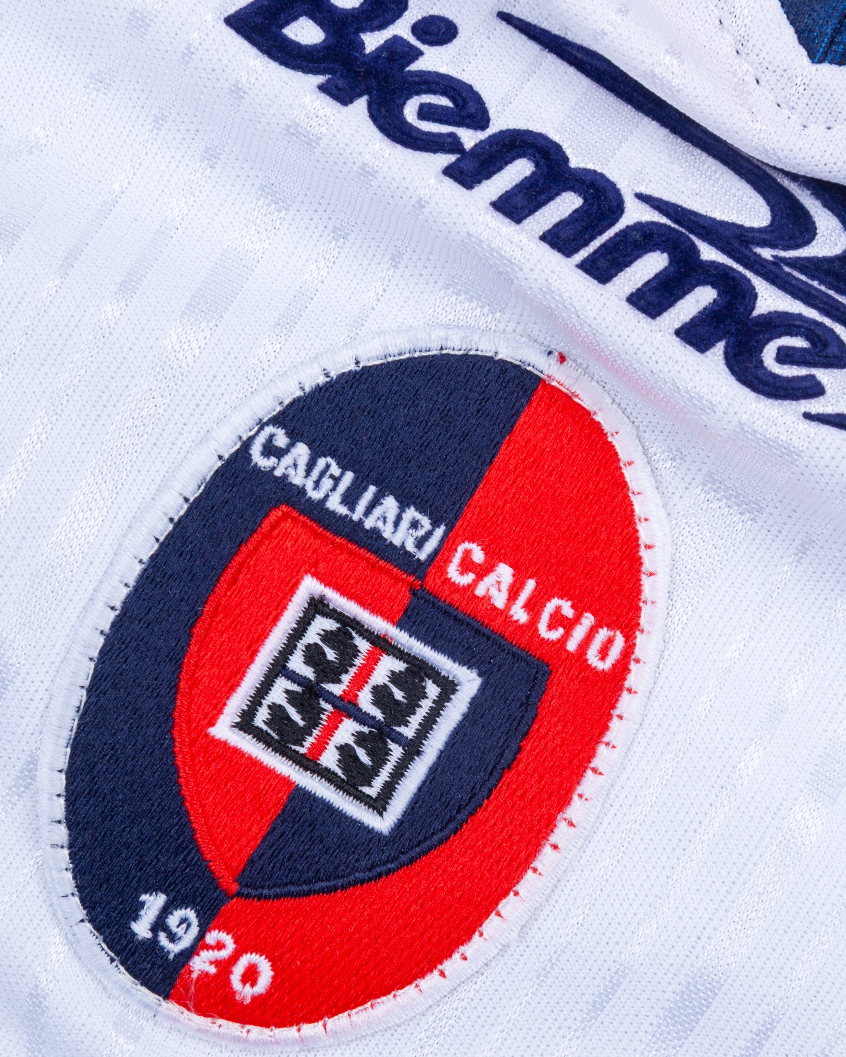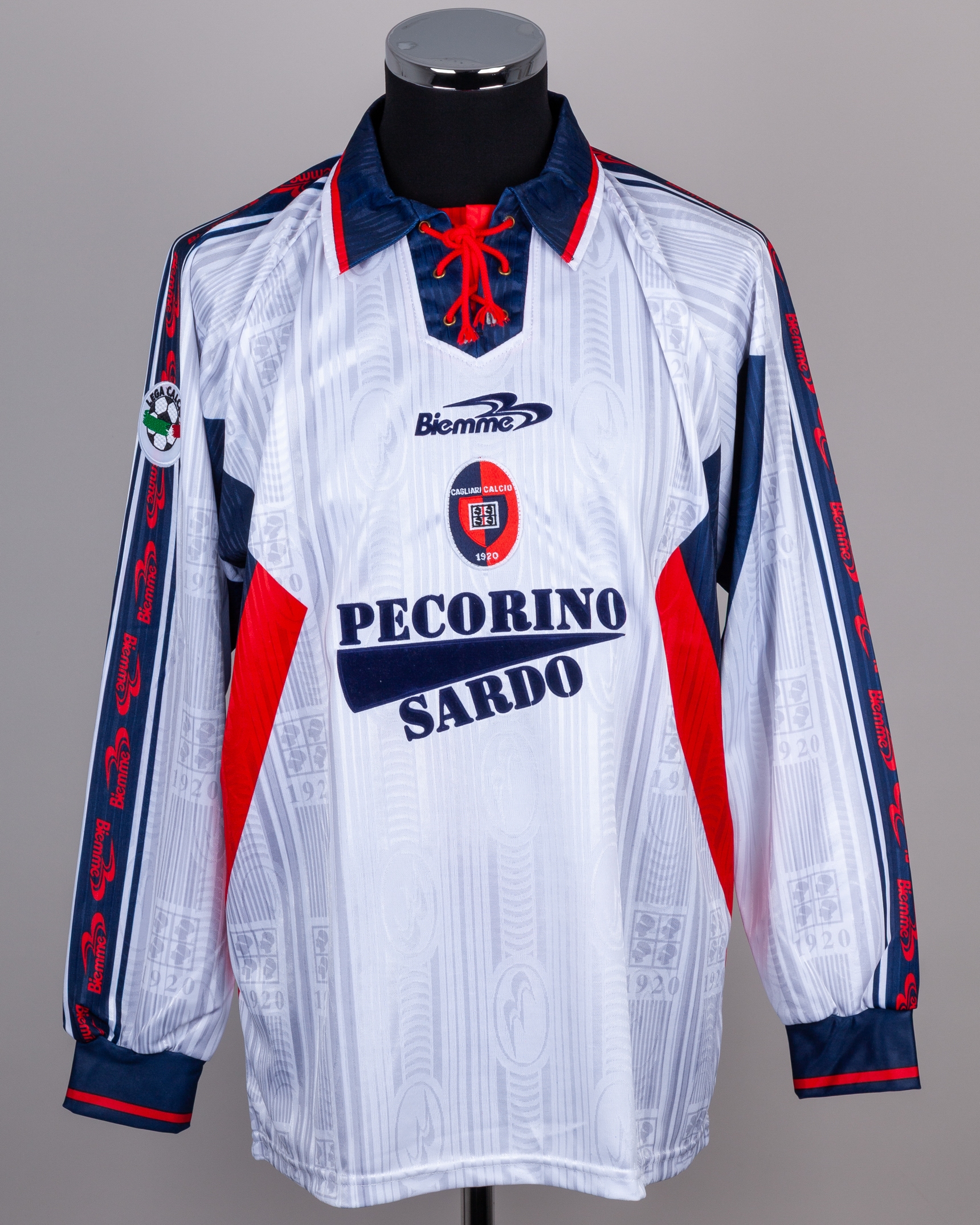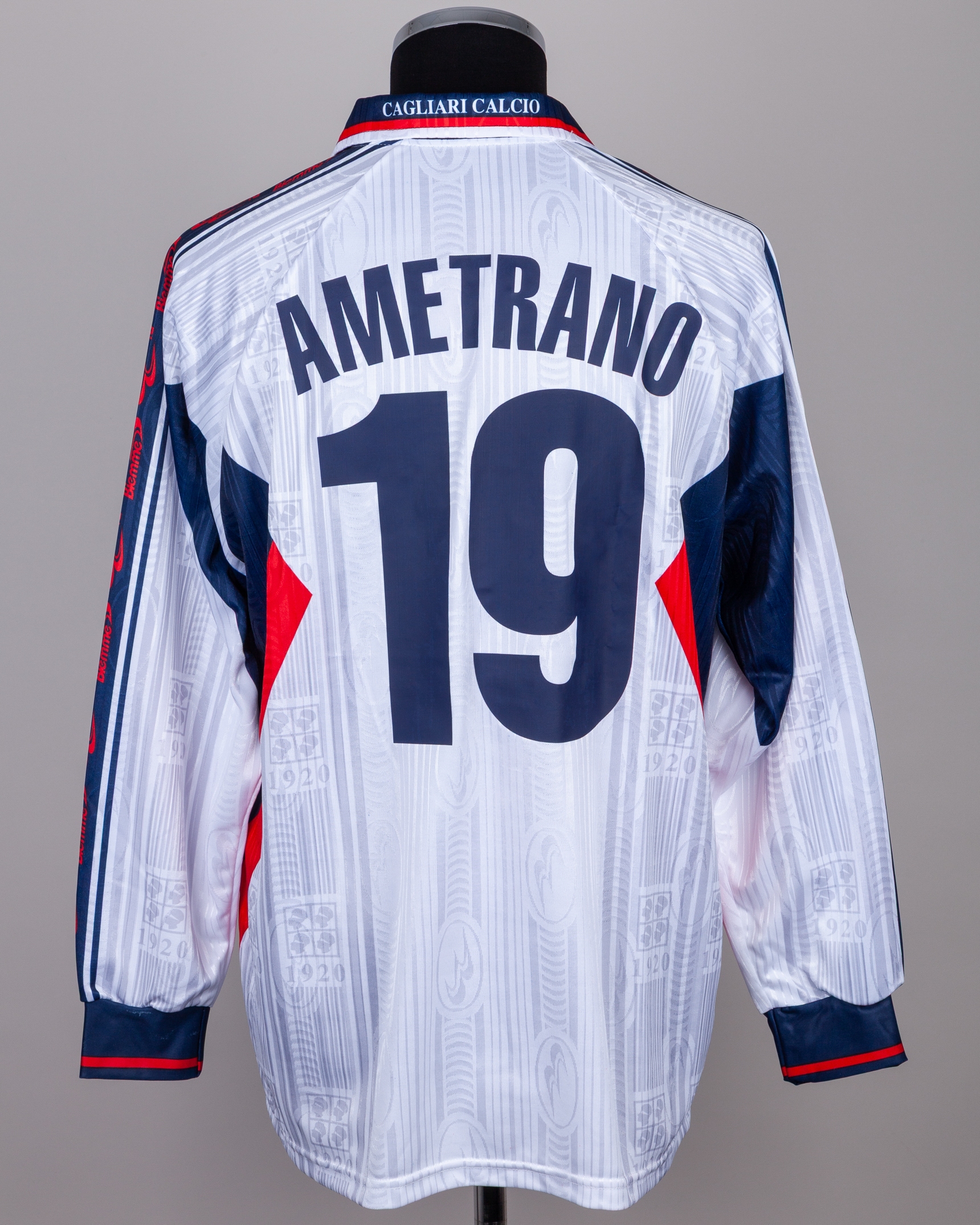 Raffaele Ametrano white and blue No.19 Cagliari long-sleeved shirt, 1999-2000, Biemme, with lace-up collar and embroidered cloth badge inscribed CAGLIARI CALCIO 1920, the right sleeve with LEGA CALCIO flash