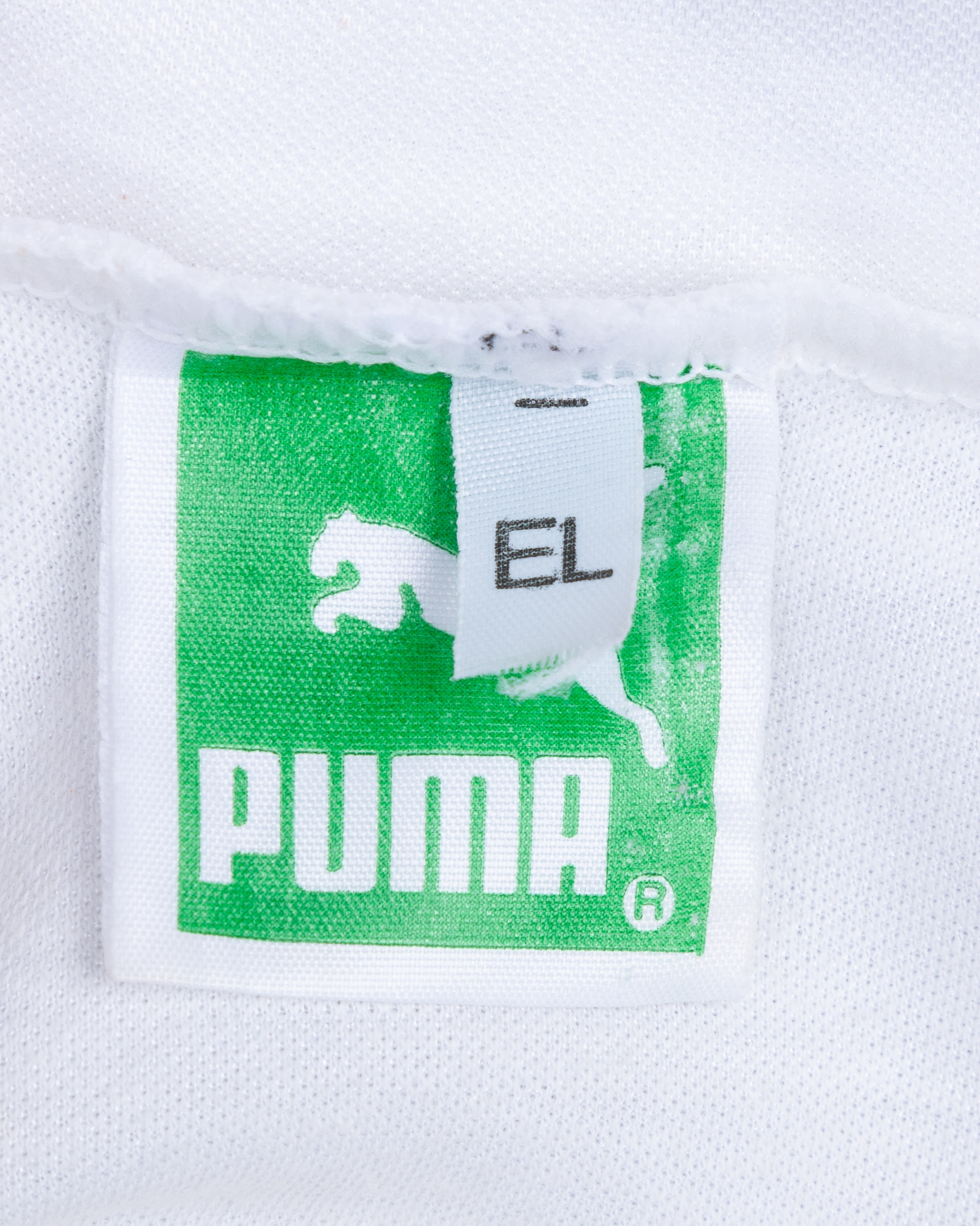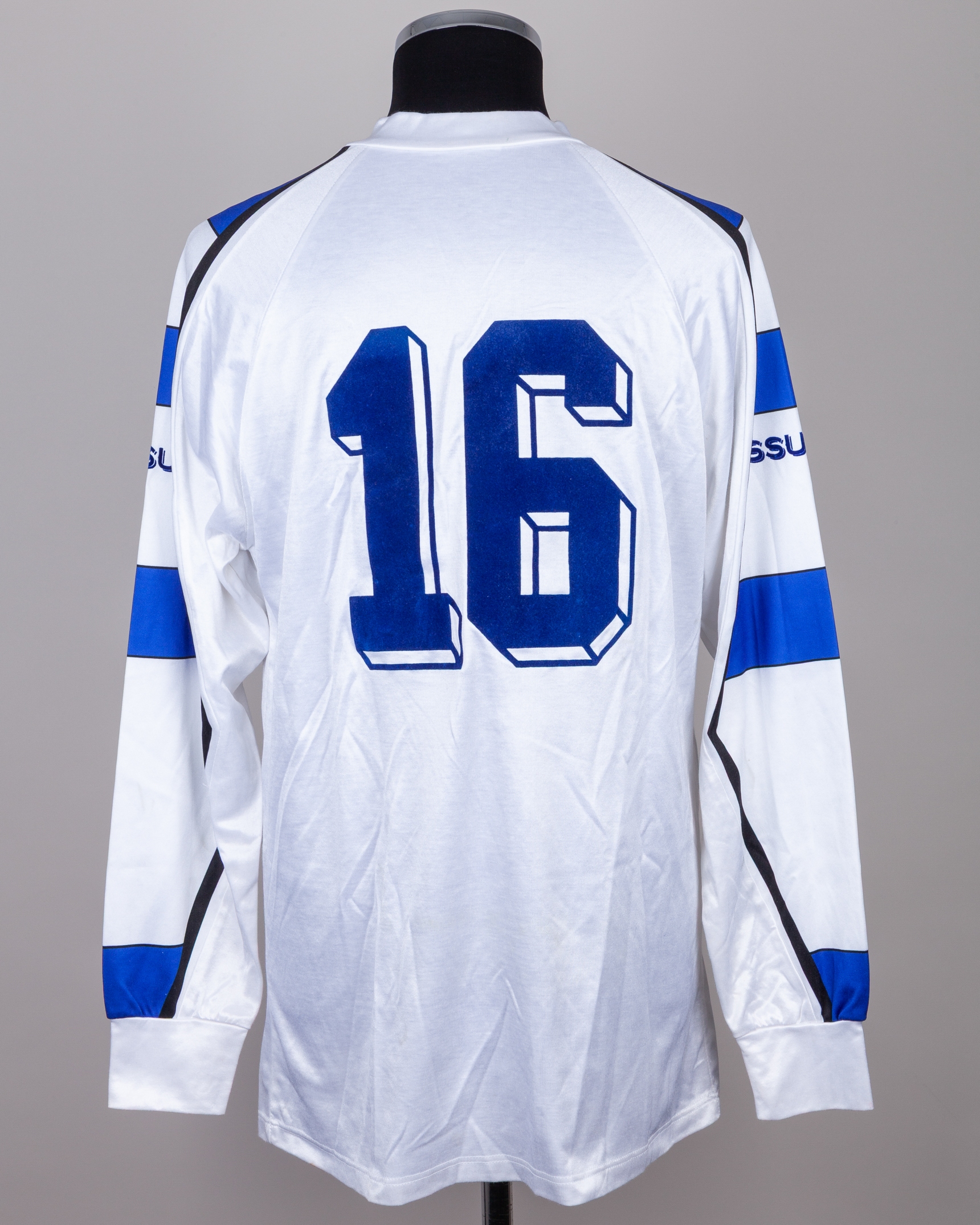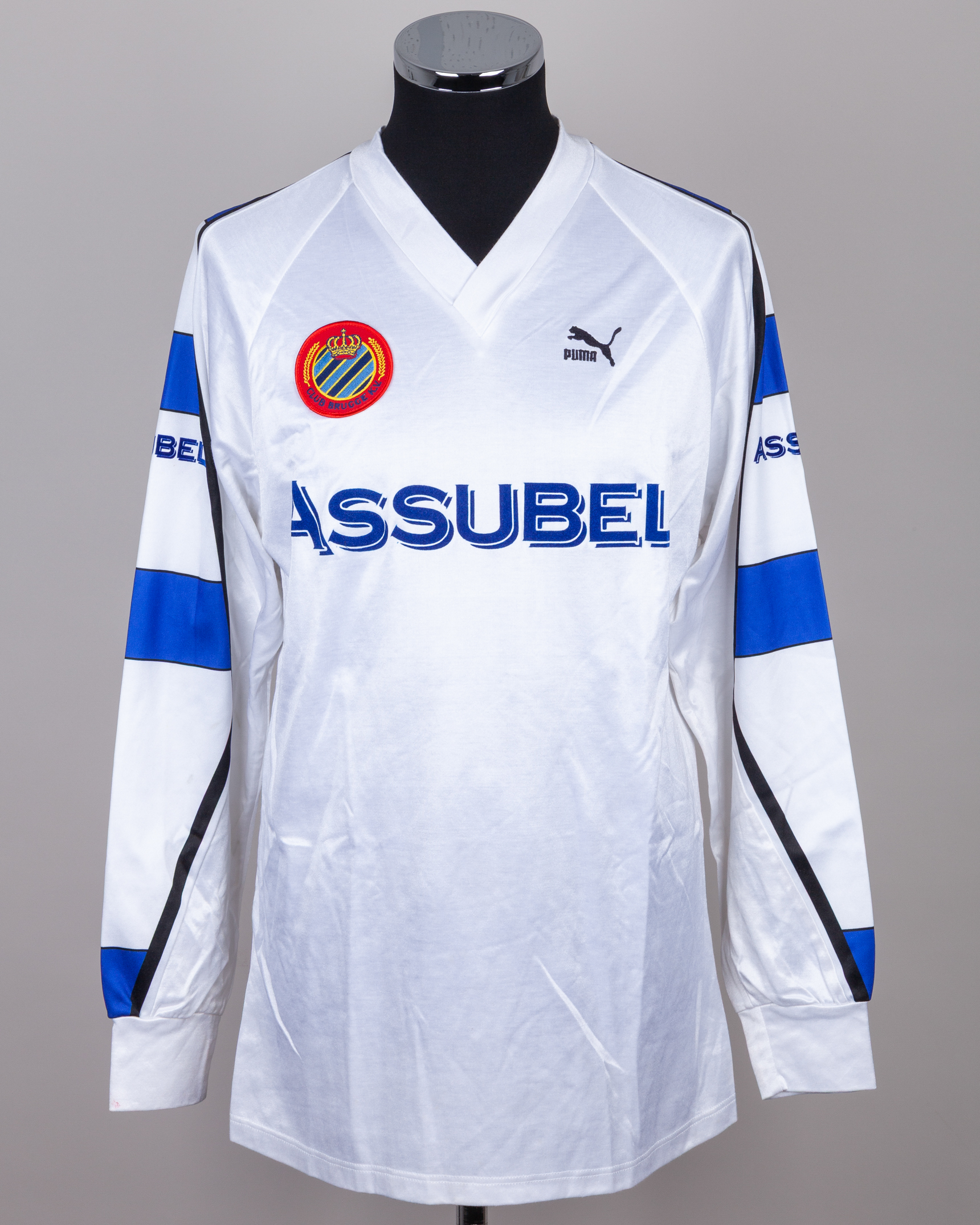 Pascal Plovie white No.16 Club Brugge long-sleeved shirt, 1991-92, Puma, EL, with v-neck collar and embroidered cloth badge inscribed CLUB BRUGGE K.V., some staining front and back