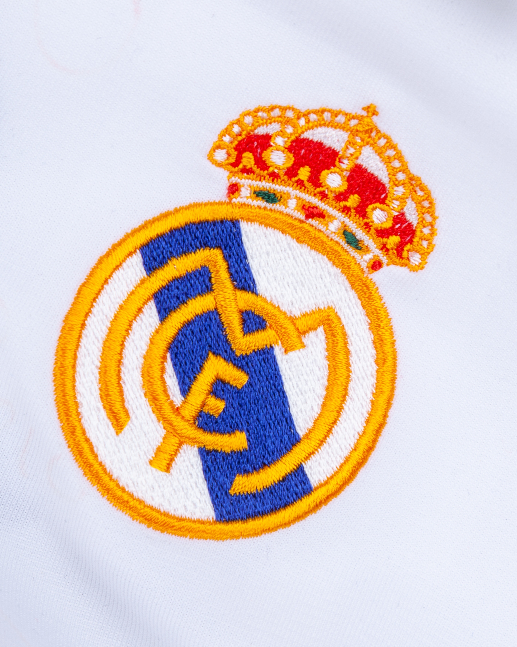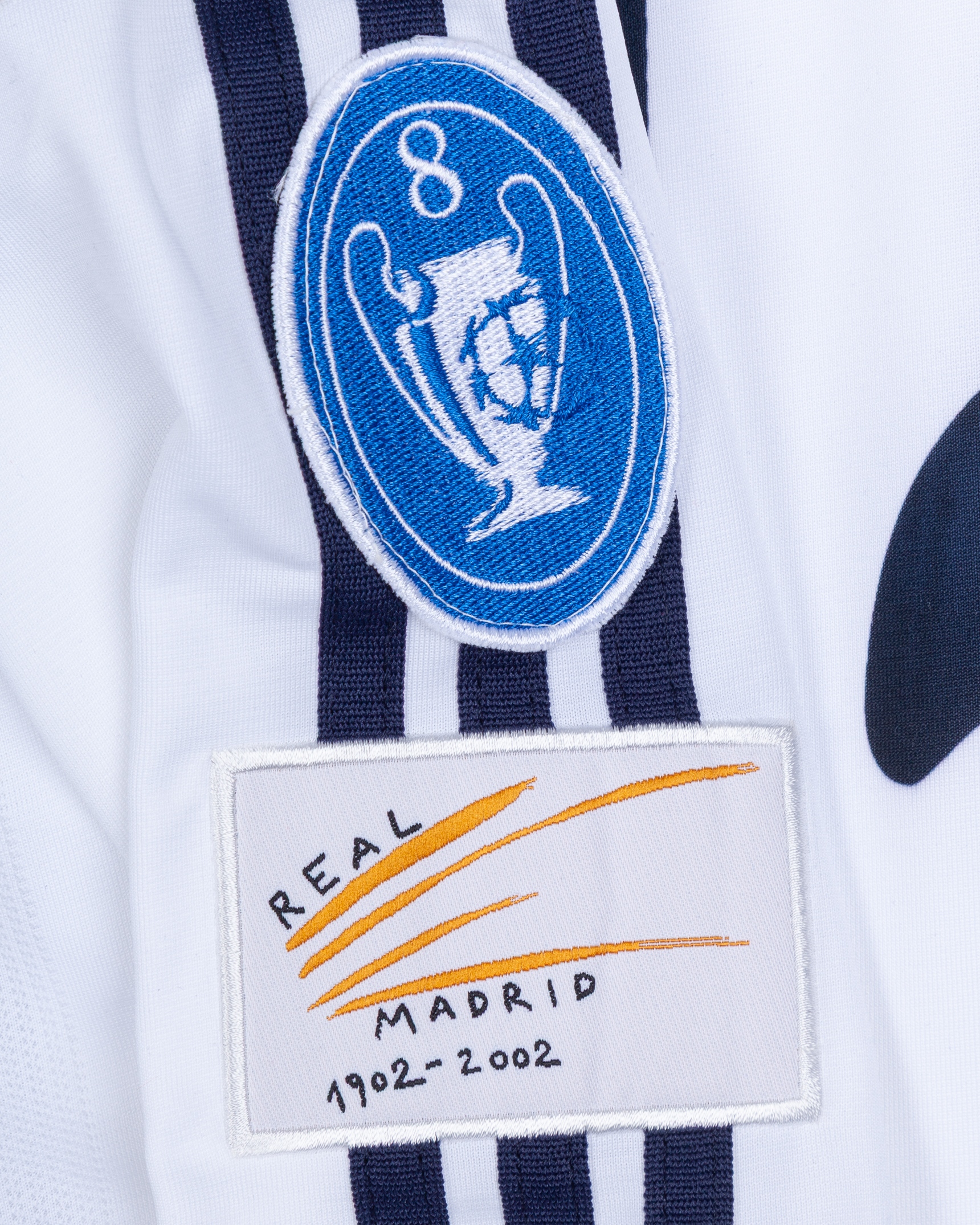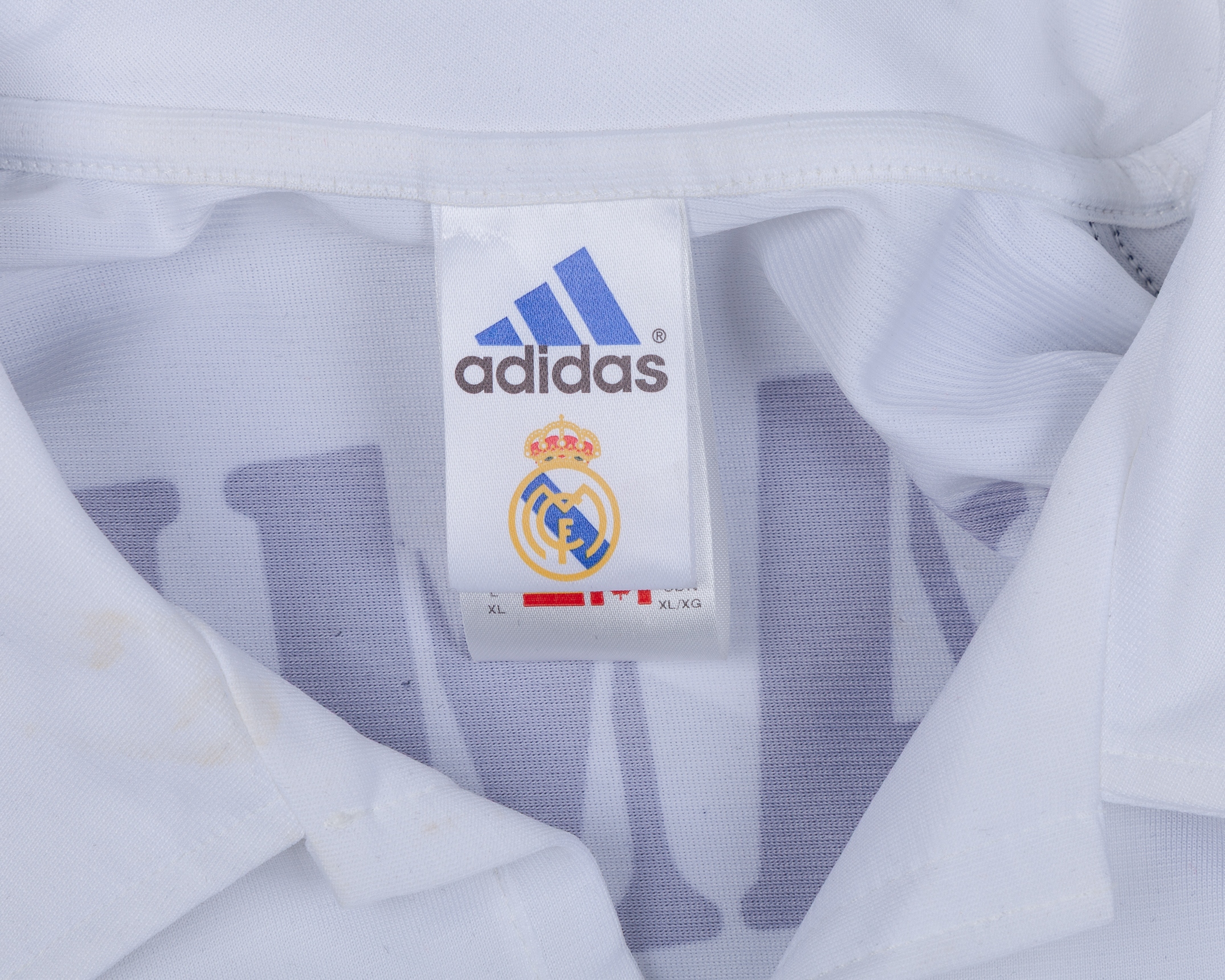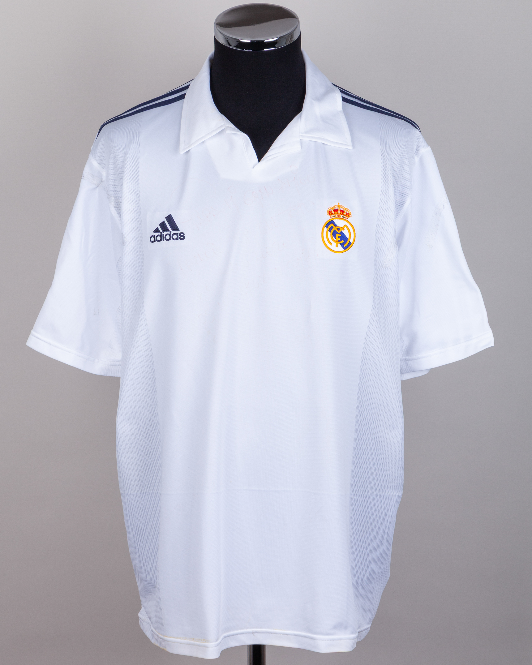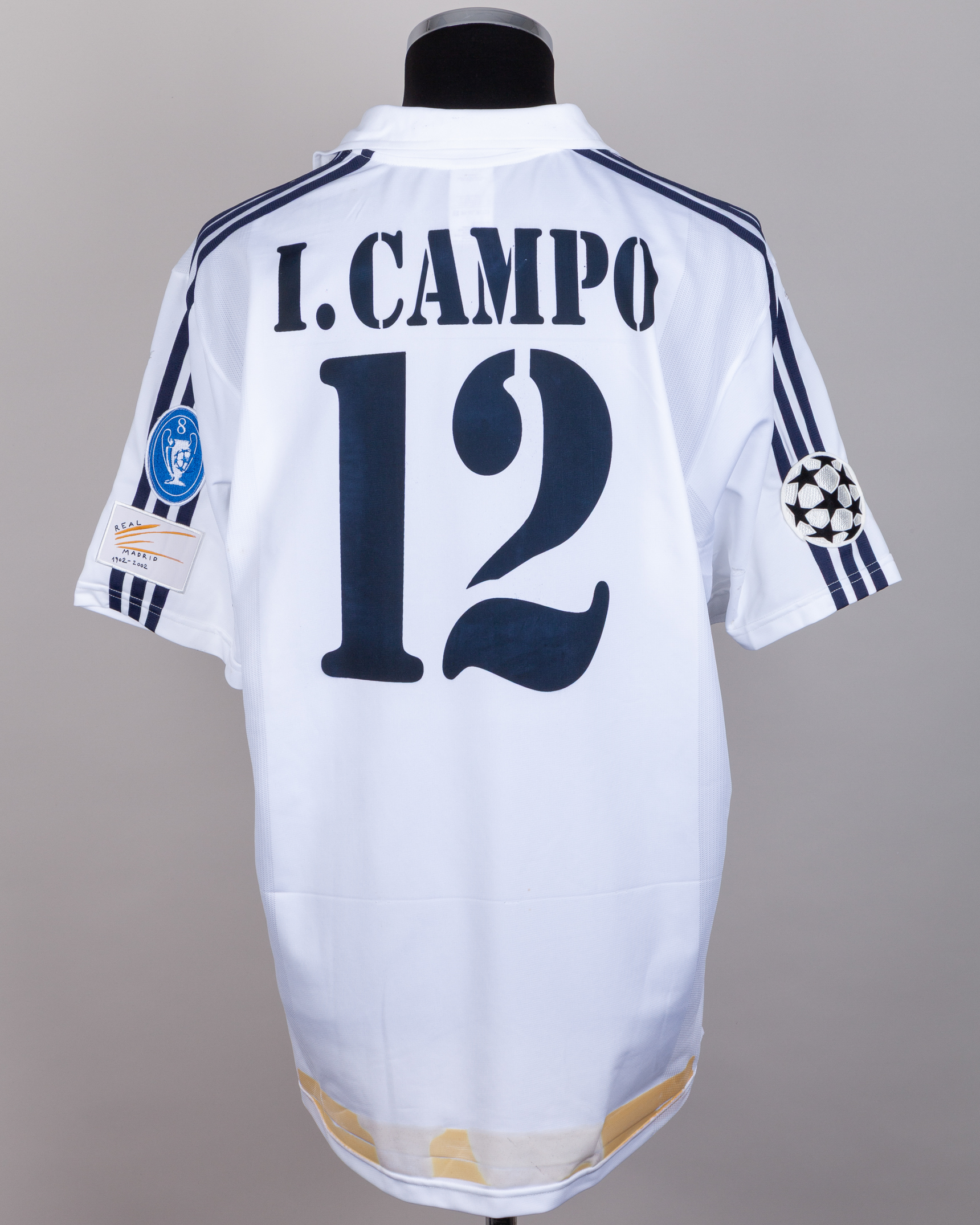 Ivan Campo white No.12 Real Madrid short-sleeved shirt, 2001-02, Adidas, XL, with v-neck collar and embroidered badge, the reverse lettered I. CAMPO, the right sleeve with Champions League flash, the left sleeve with 8 Champions League and Real Madrid 1902-2002 flashes, with a dedication on the front in red ink, very faded, with residue tape marks from framing, discolouration, staining and flash peeling