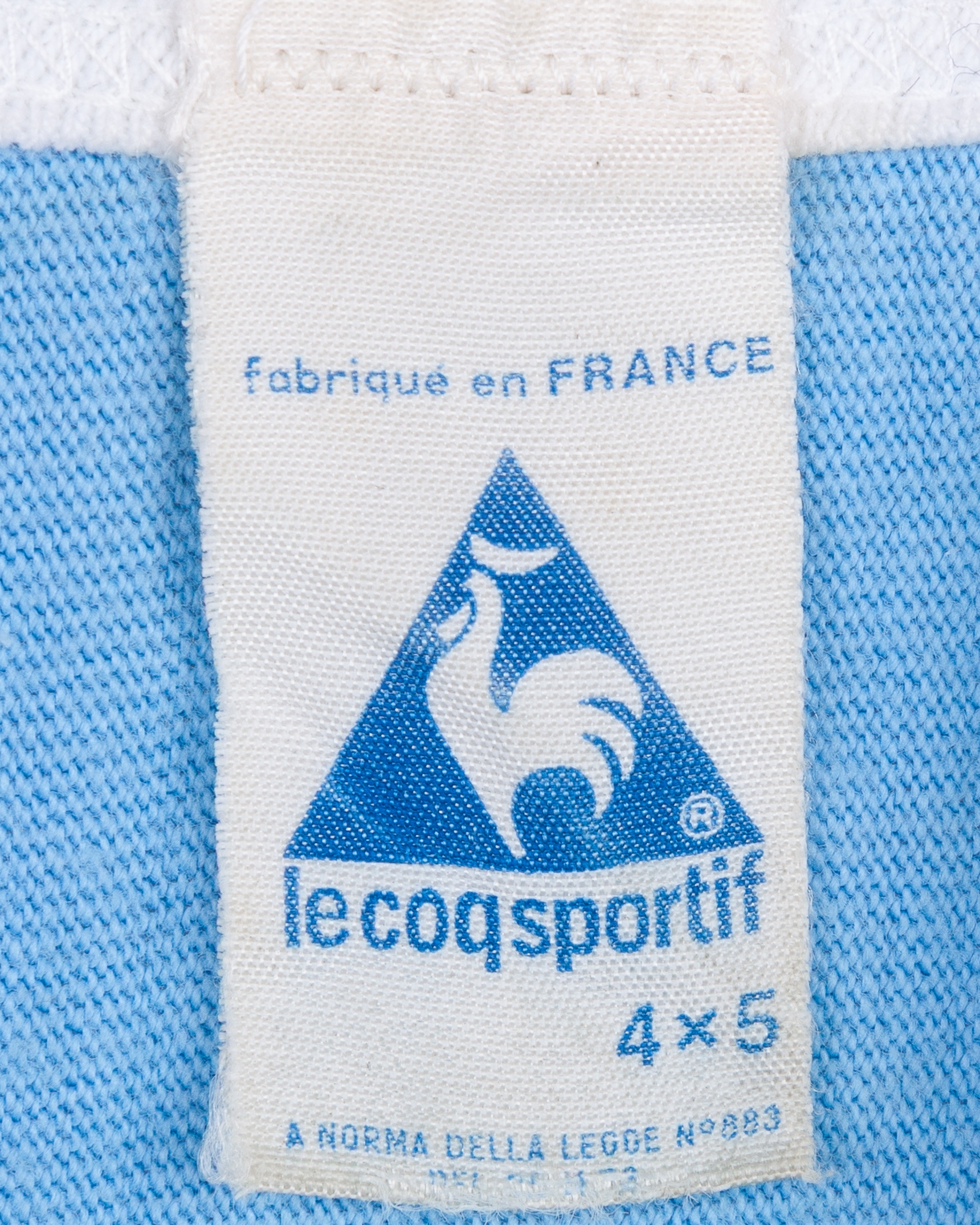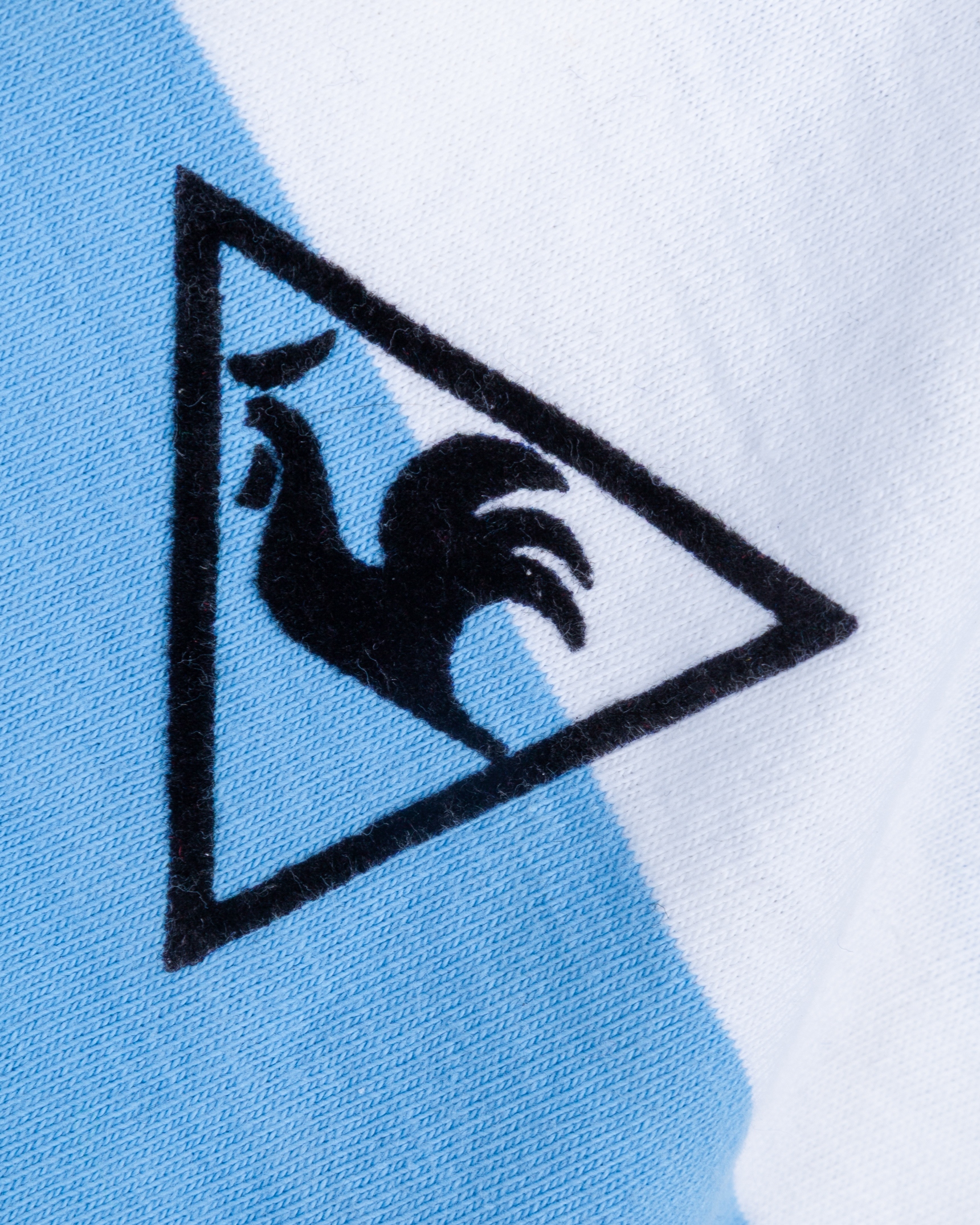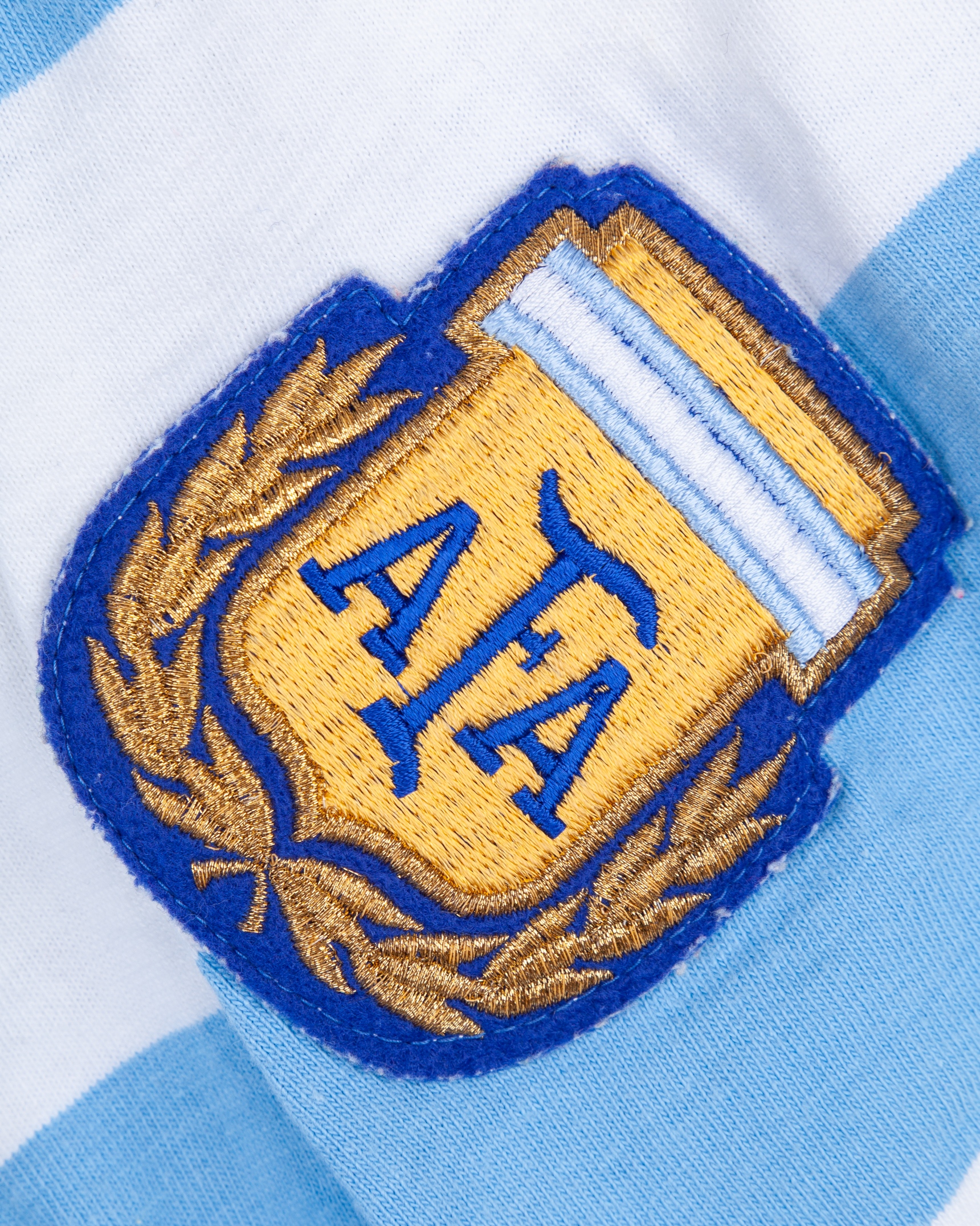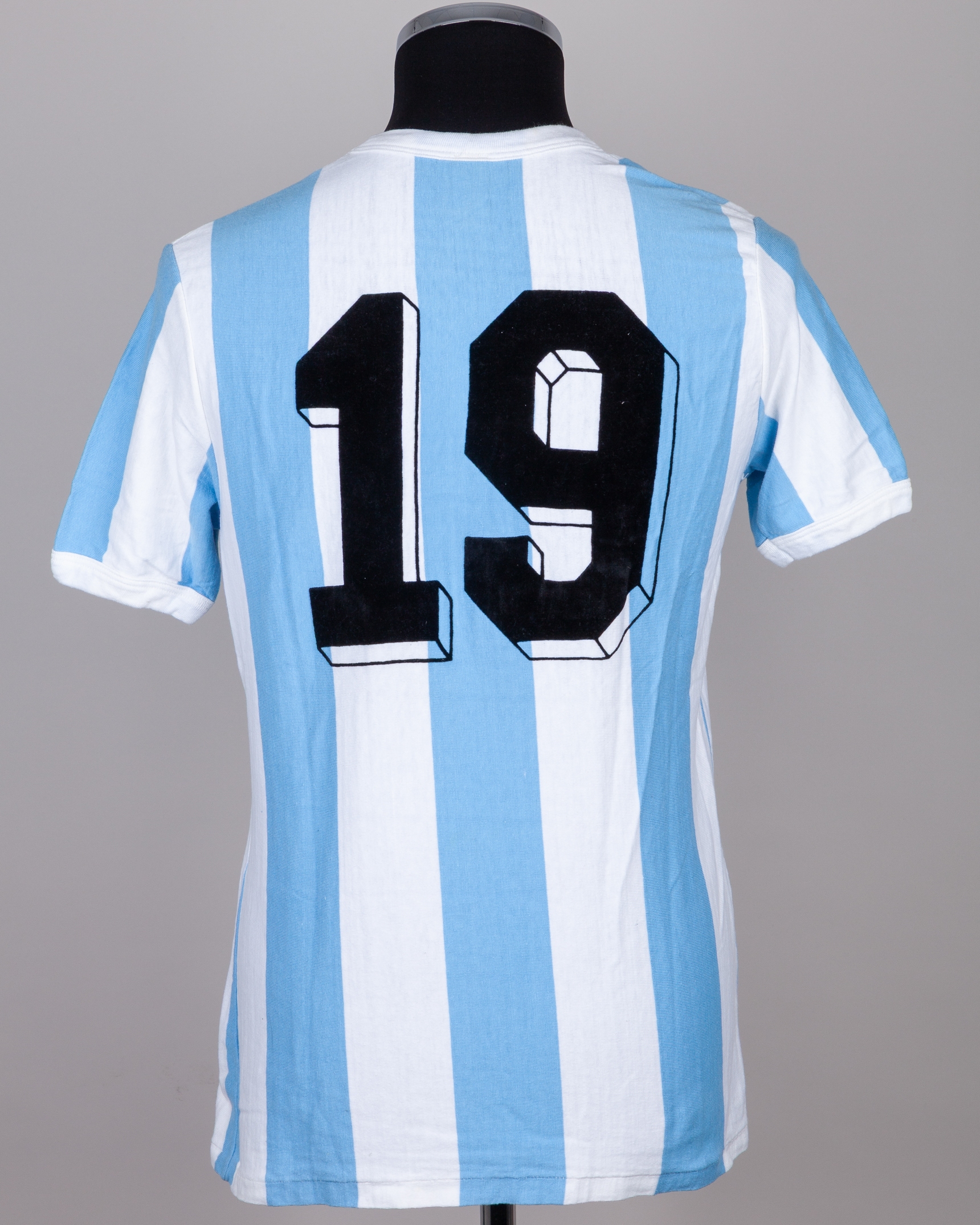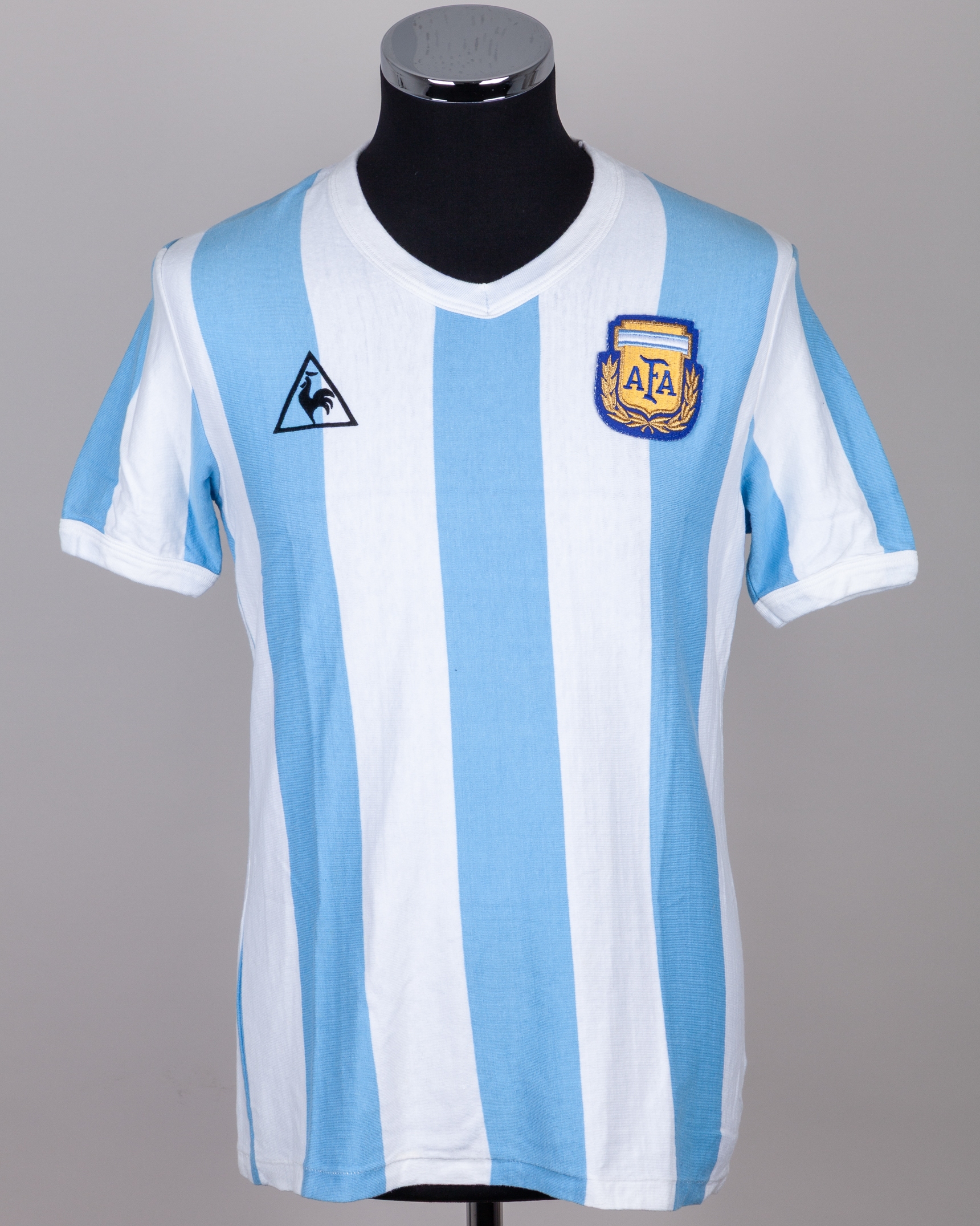 Enzo Trossero blue and white No.19 Argentina short-sleeved shirt, 1982, Le Coq Sportif, with v-neck collar and embroidered cloth badge inscribed AFA, some slight staining