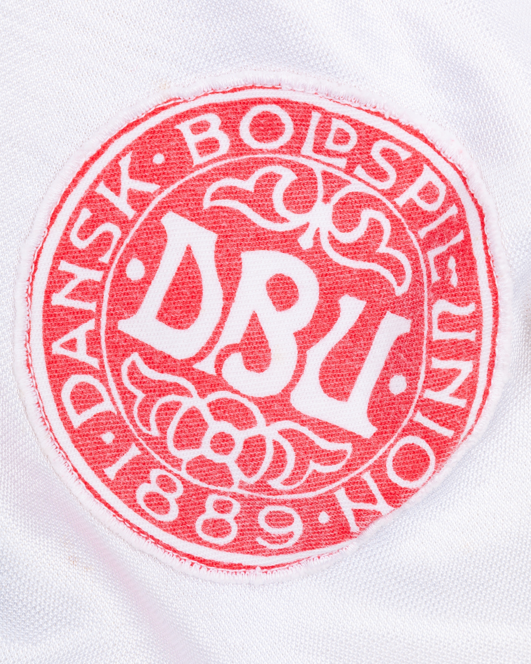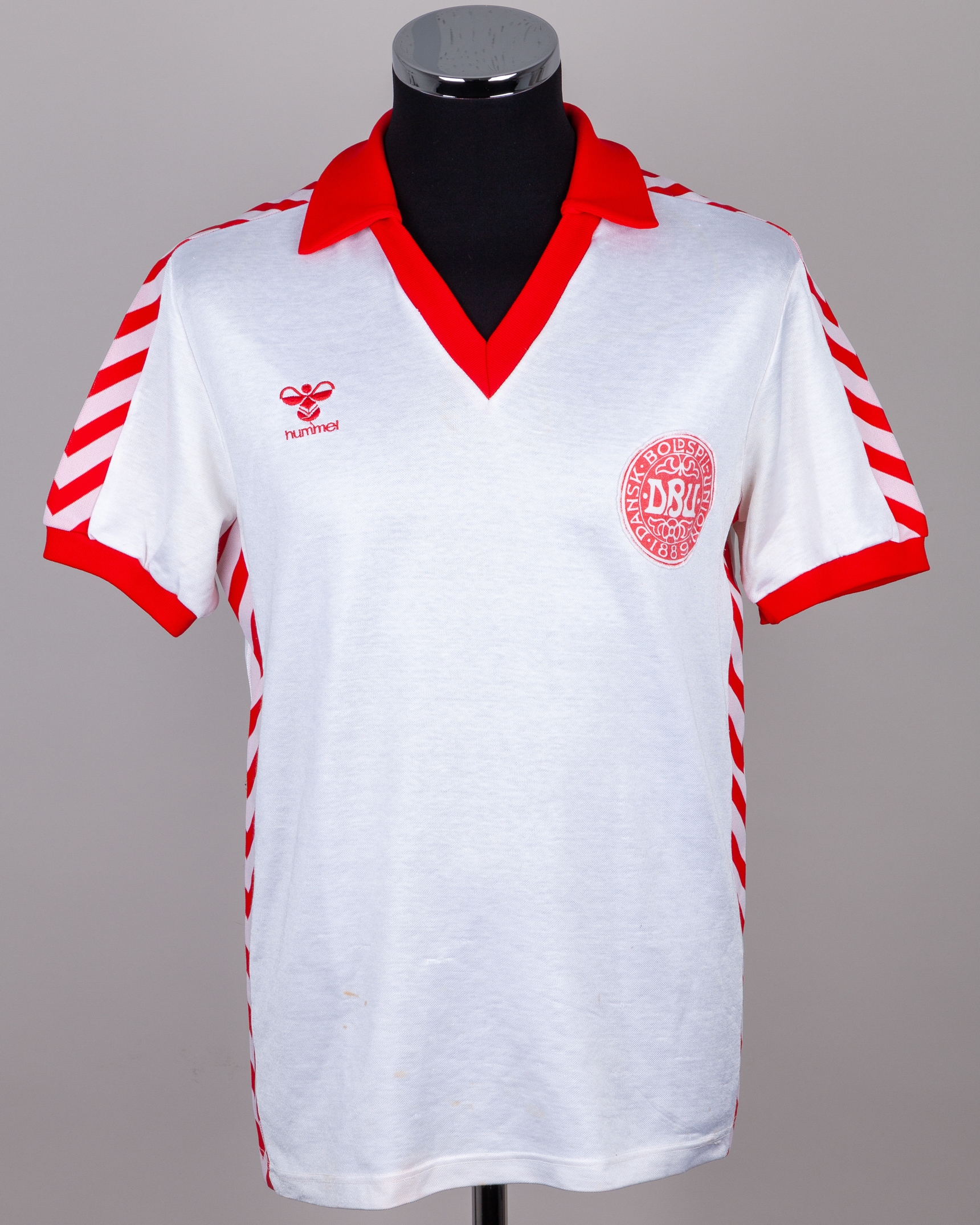 Morten Olsen white and red No.5 Denmark v Republic of Ireland short-sleeved shirt, 1979, Hummel, with v-neck collar and embroidered cloth badge