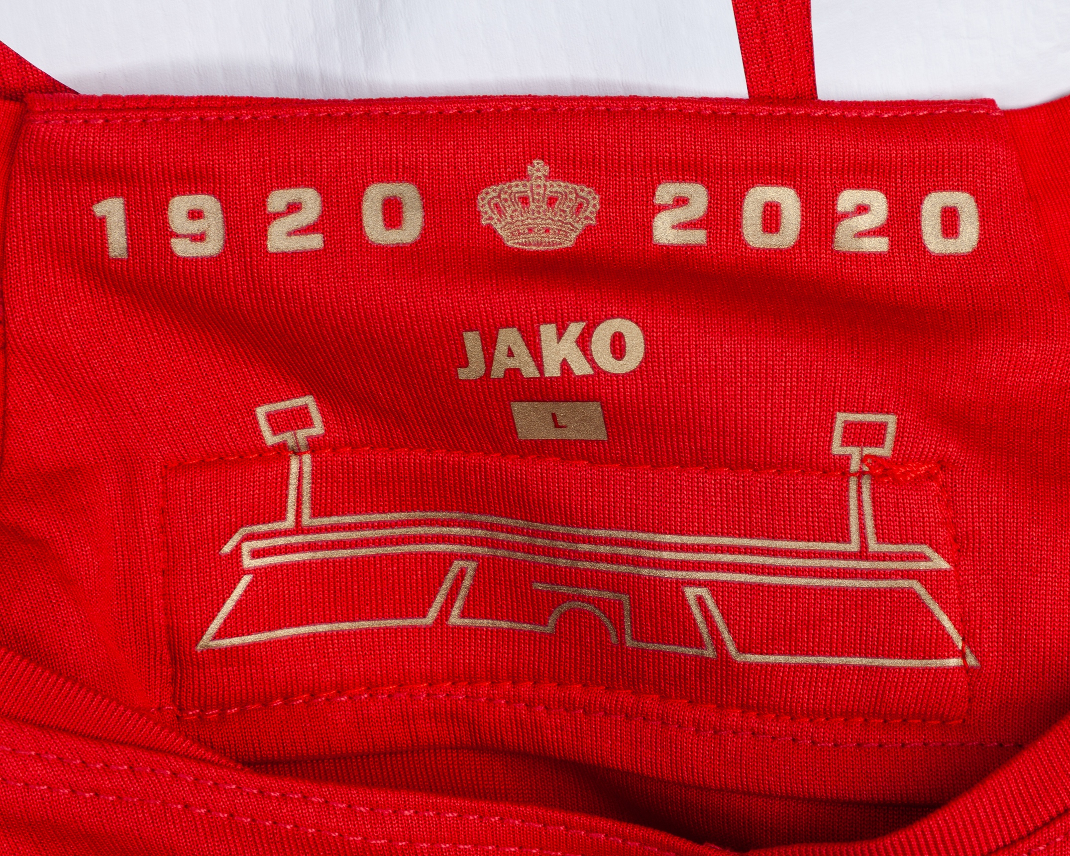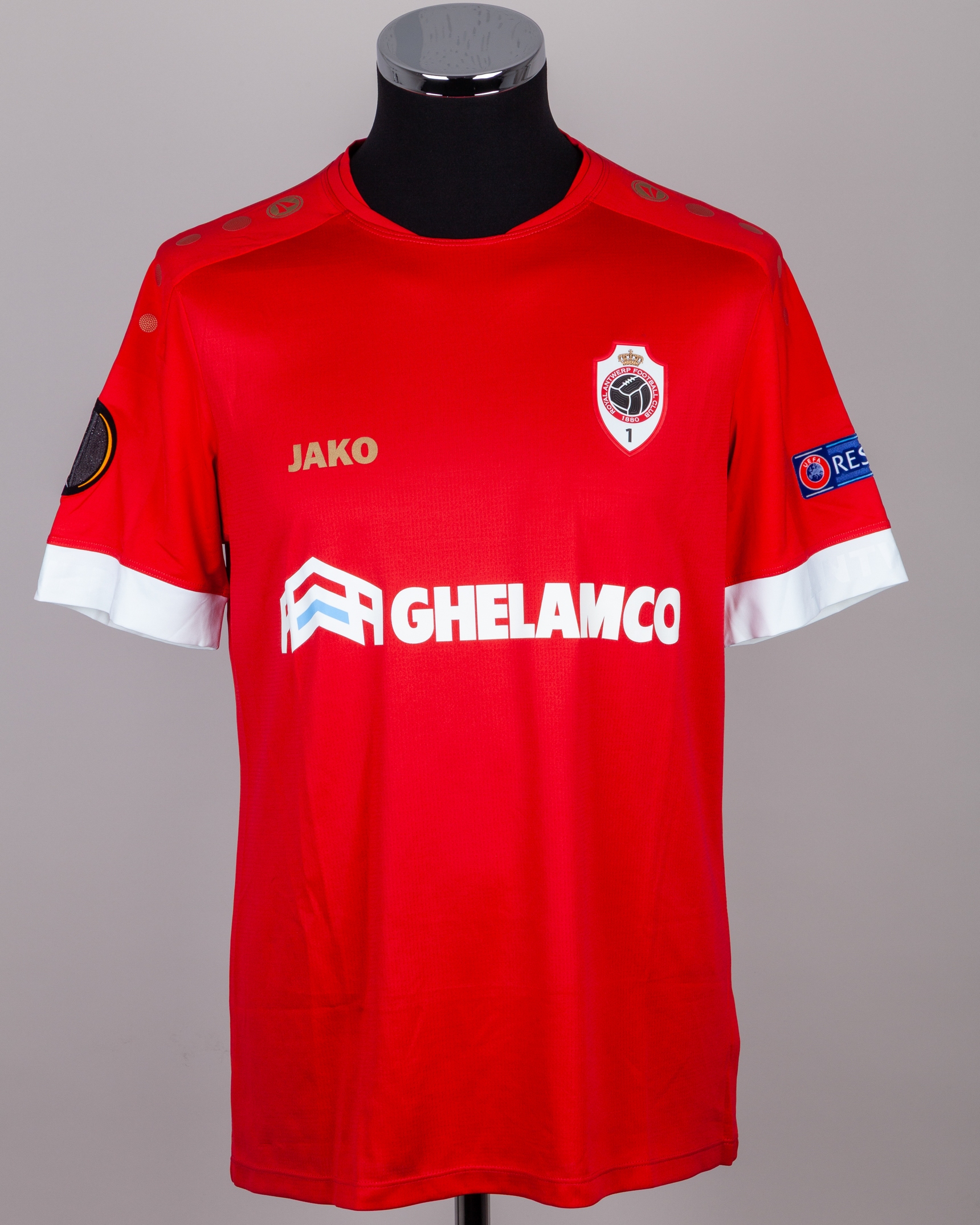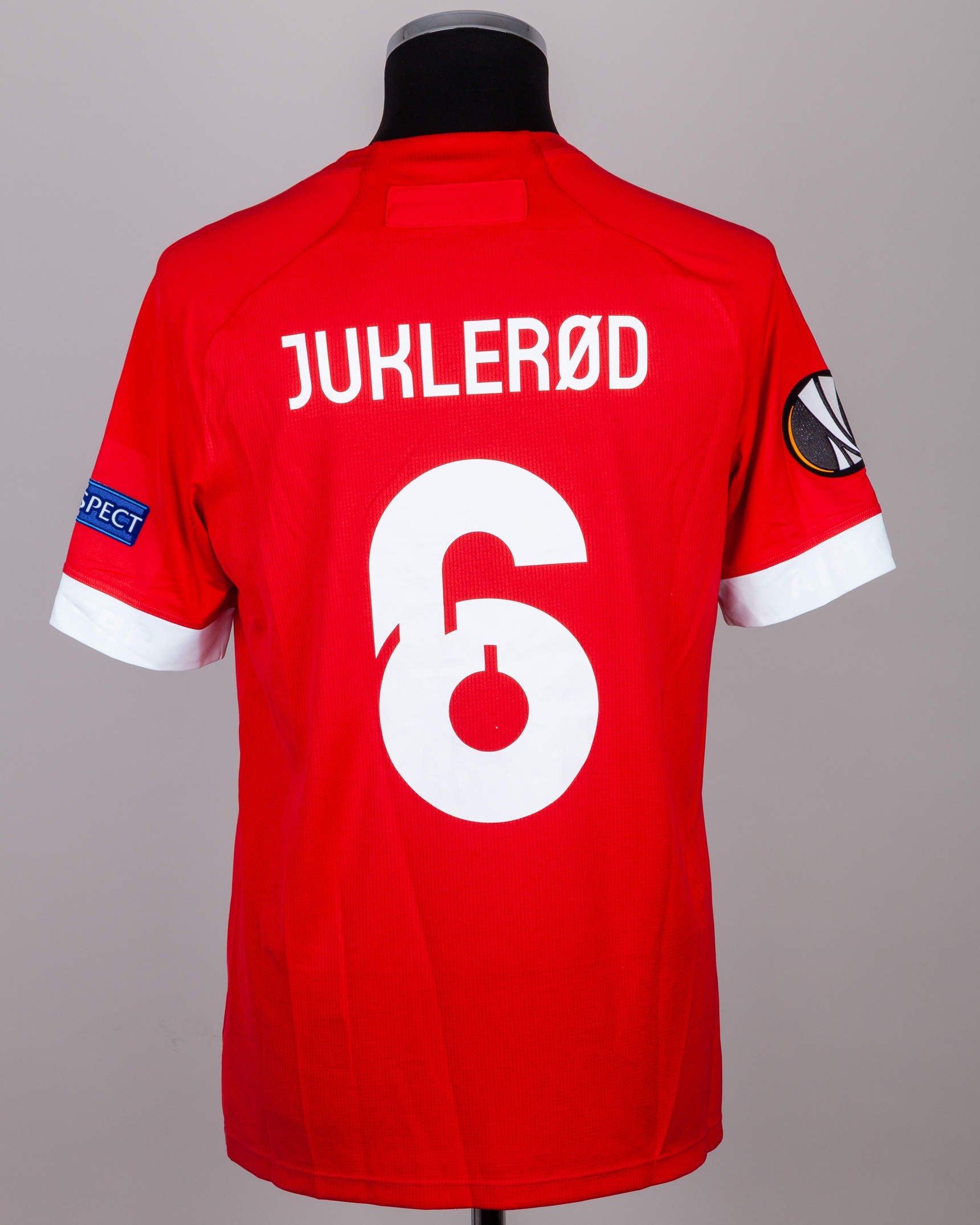 Simen Juklerod red No.5 Royal Antwerp v. Tottenham Hotspur short-sleeved shirt, 2020, Jako, L, with crew-neck collar and printed badge, the reverse lettered JUKLEROD, the right sleeve with Europa League flash, the other with UEFA Respect flash