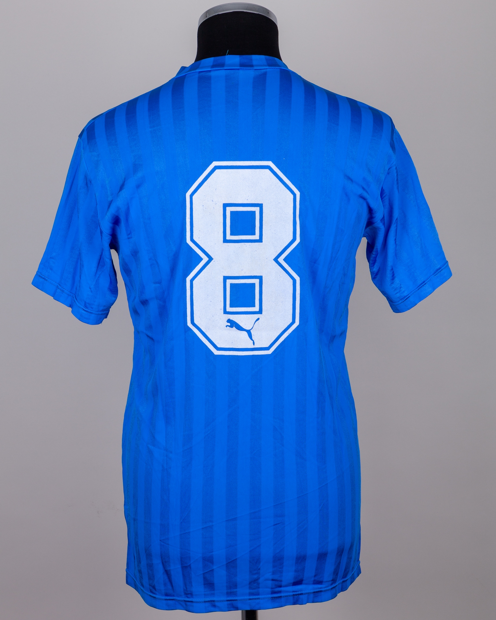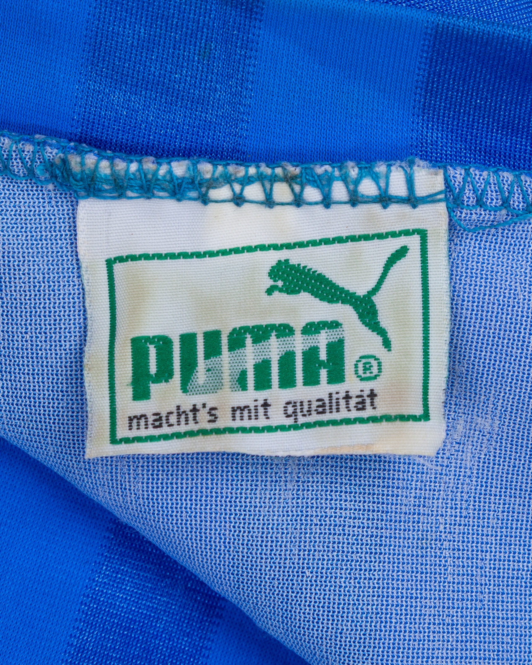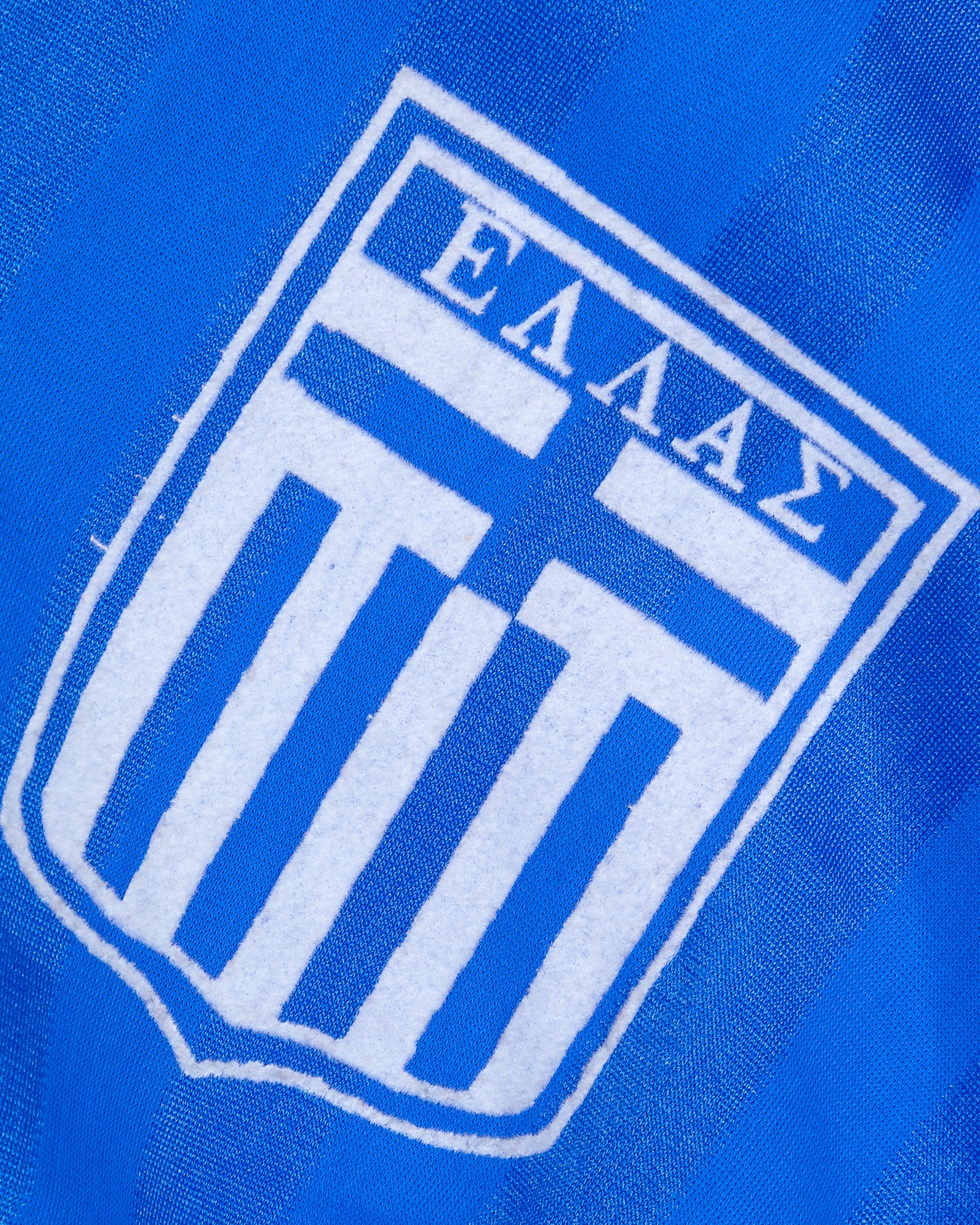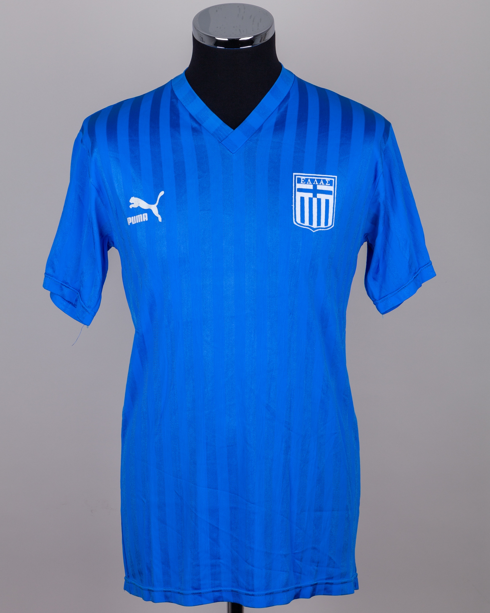 Blue No.8 Greece short-sleeved shirt, 1988, Puma, L, with v-neck collar and felt badge, some staining