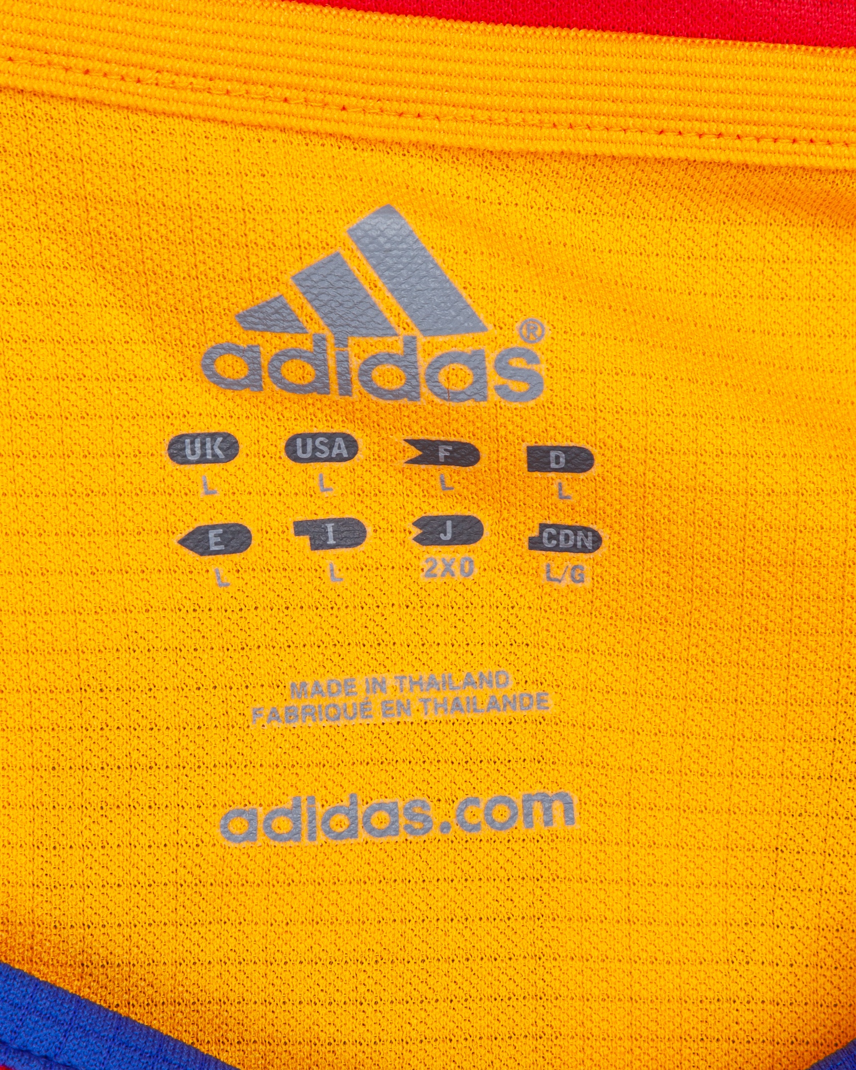 George Ogararu orange and red No.2 Romania v. Luxembourg short-sleeved shirt, 2007, Adidas, L, with crew-neck collar and printed badge, with flags of nations Luxembourg. 17 10 2007 decal, the reverse lettered OGARARU, staining, the right sleeve with UEFA Euro 2008 flash, staining front and back