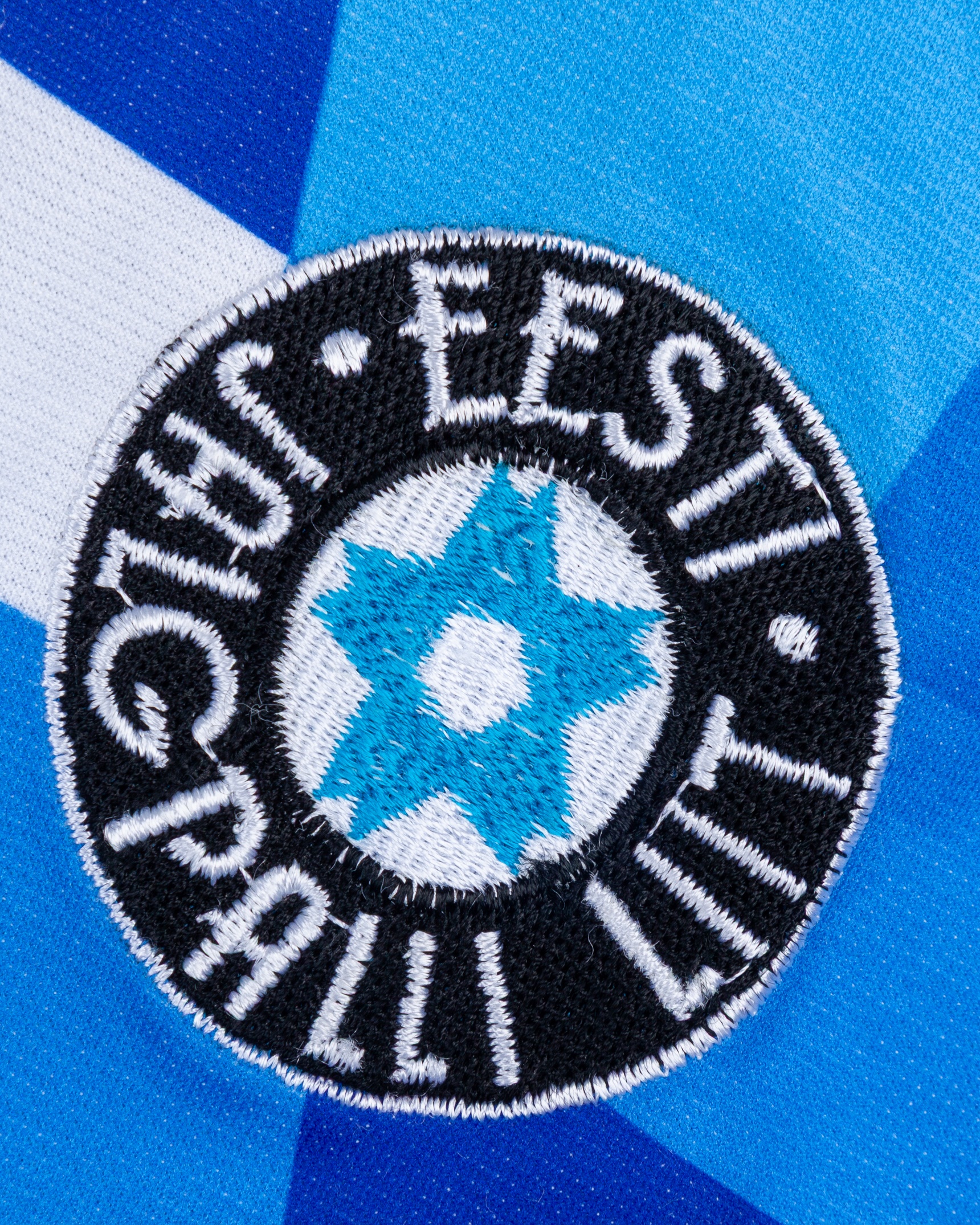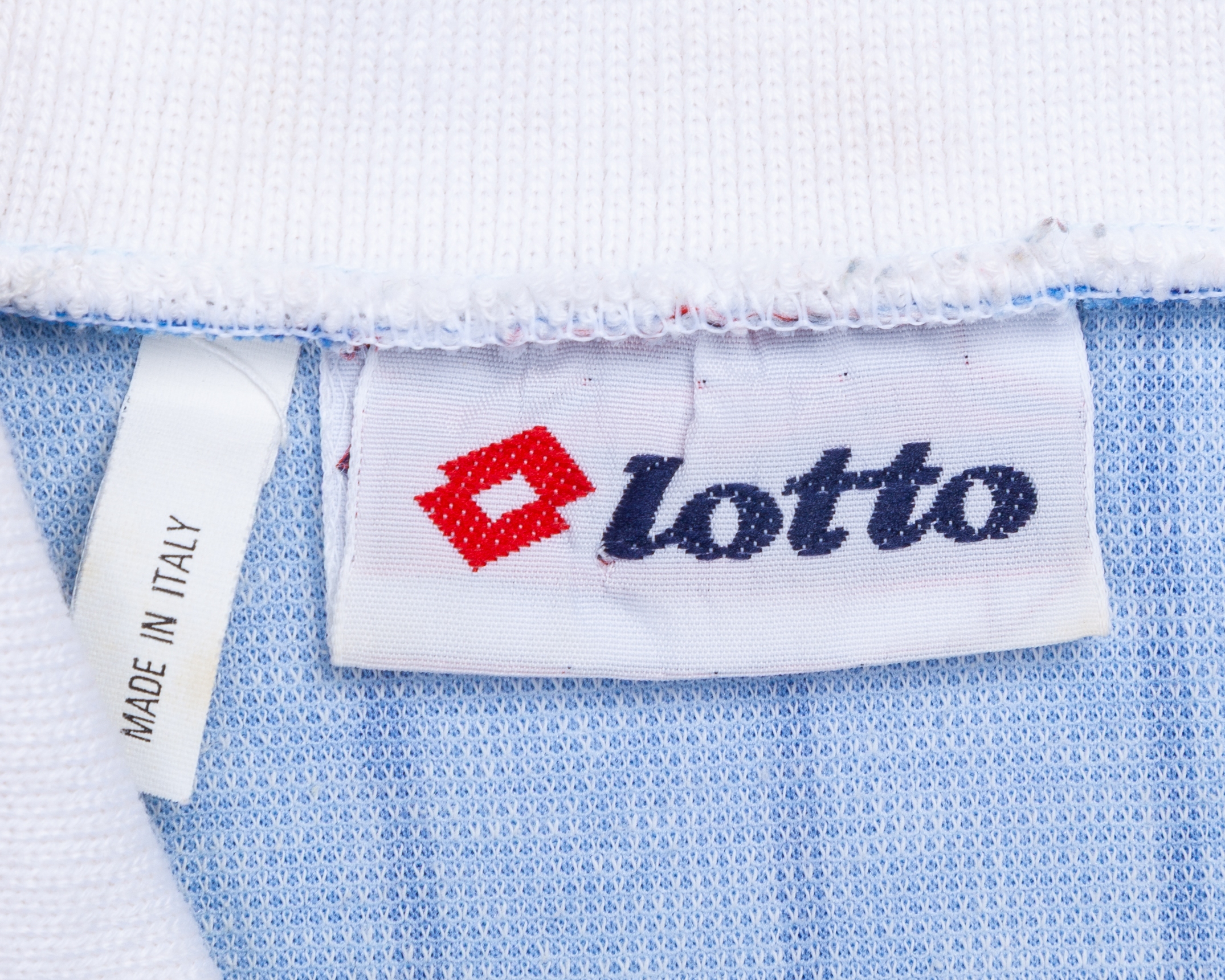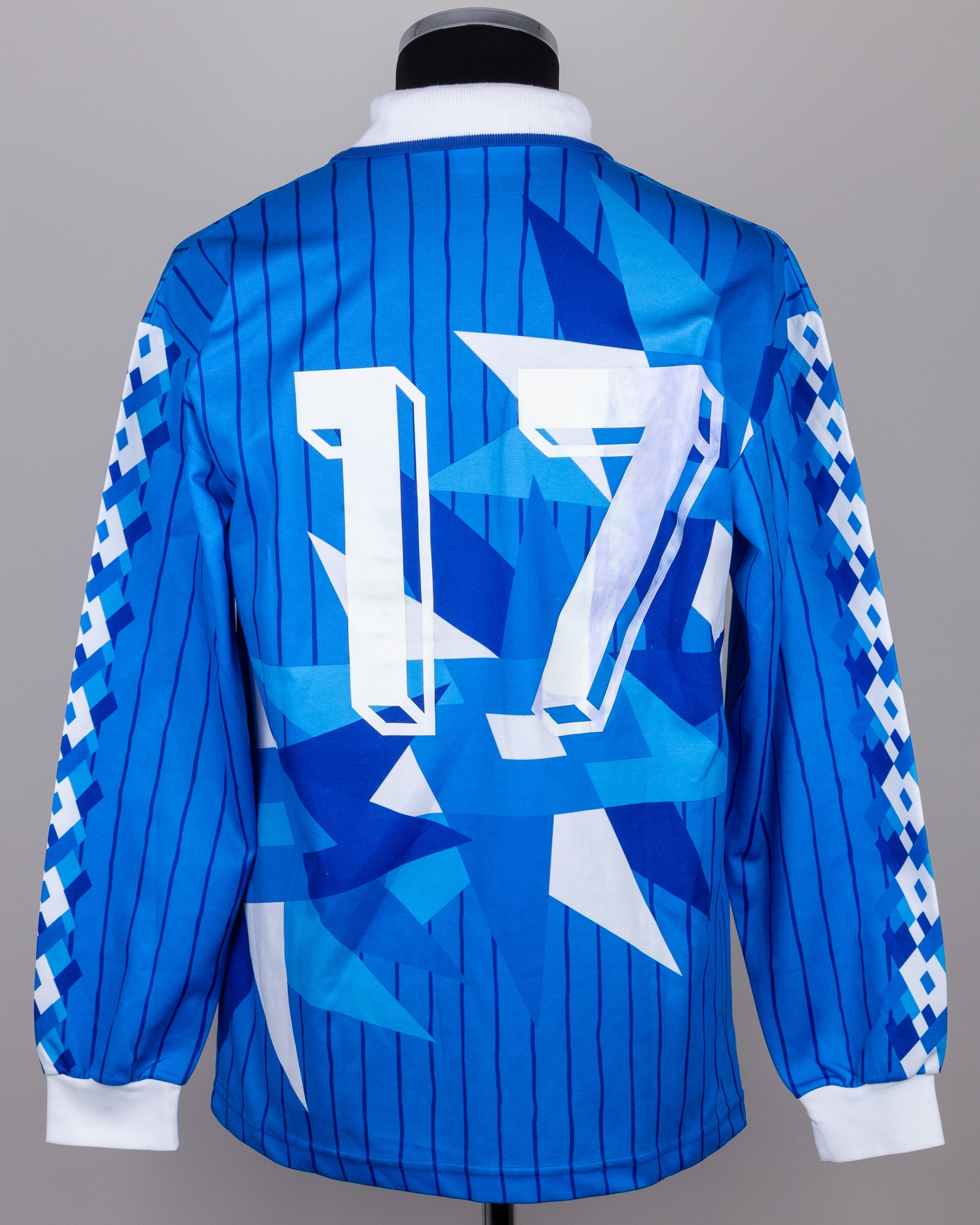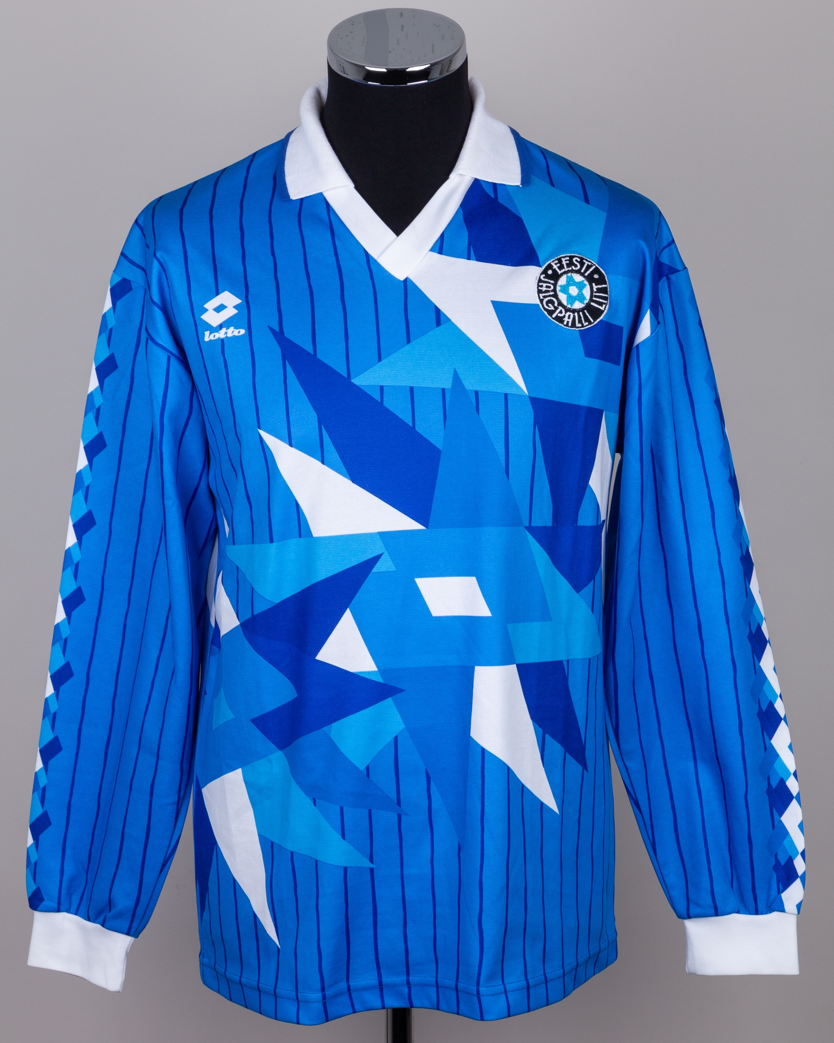 Blue and white No.17 Estonia long-sleeved shirt, 1990s, Lotto, with v-neck collar and embroidered cloth badge