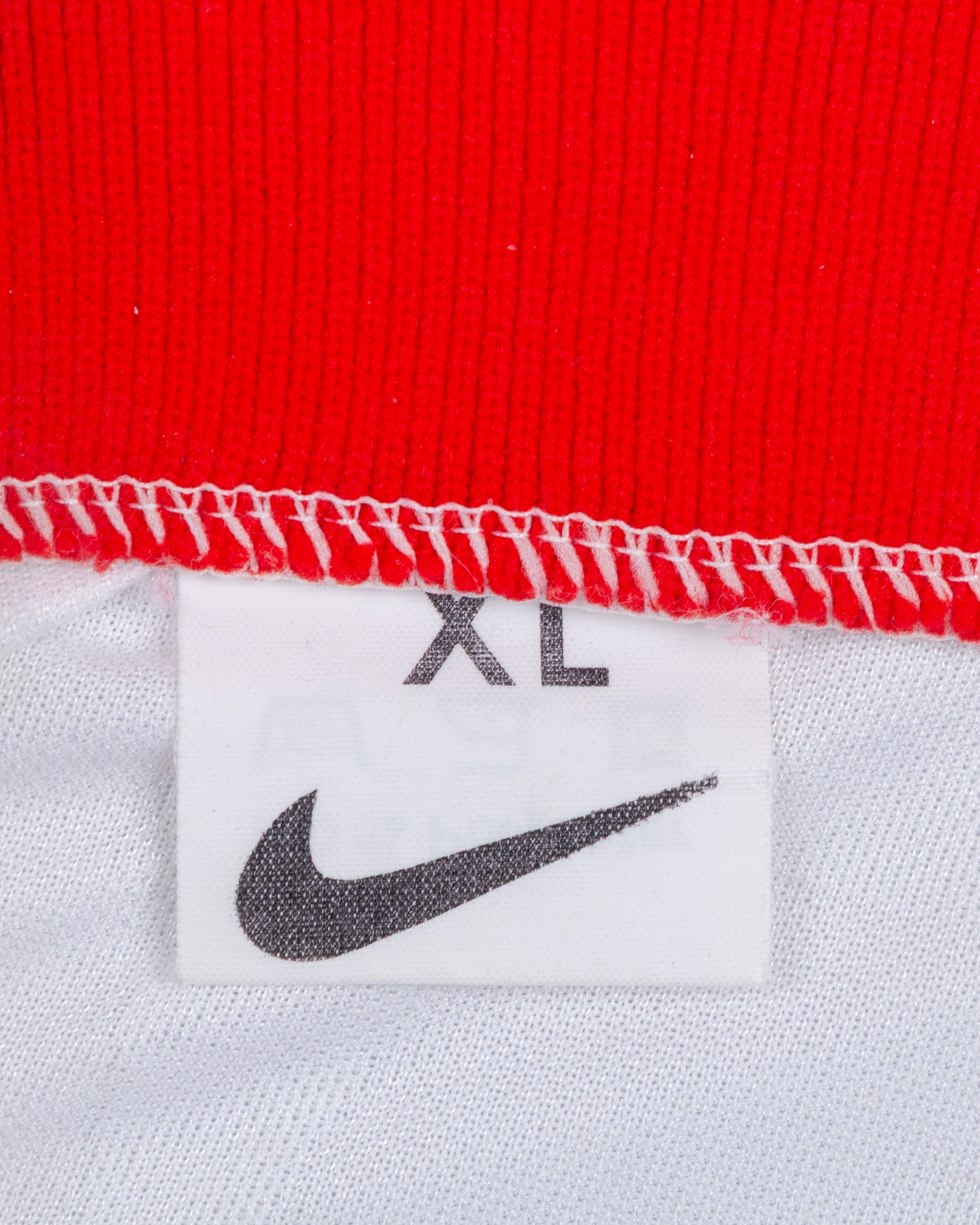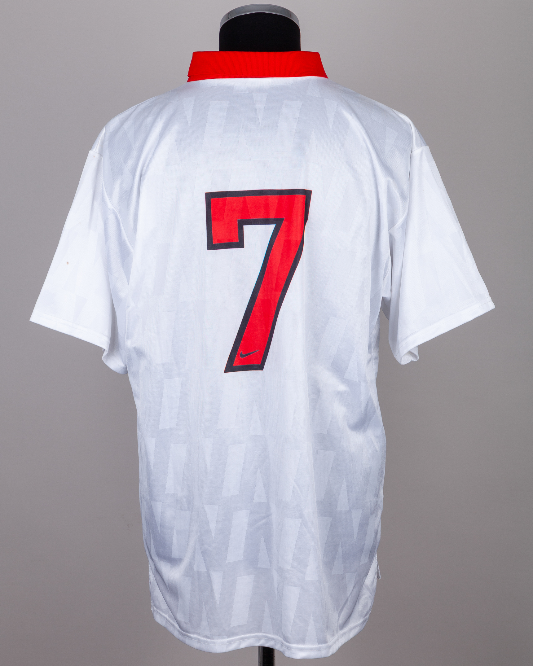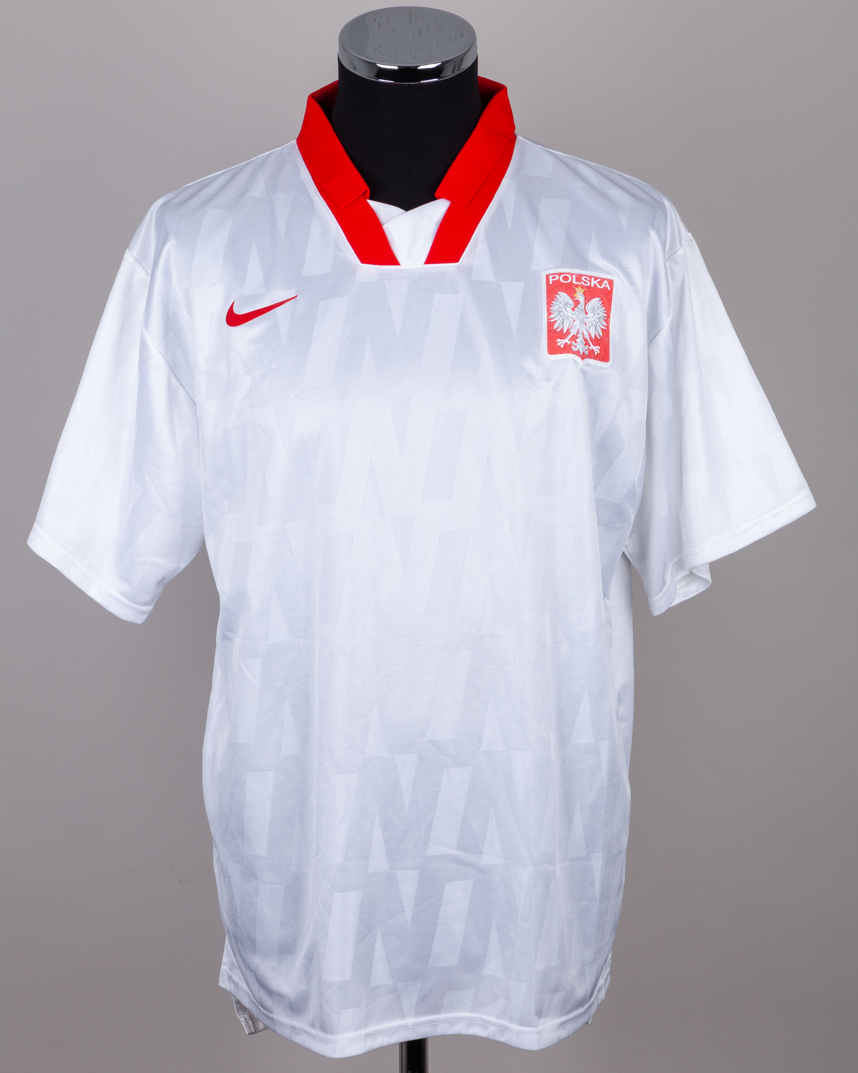 White and red No.7 Poland short-sleeved shirt, 1996, Nike, XL, with v-neck collar and sponge badge