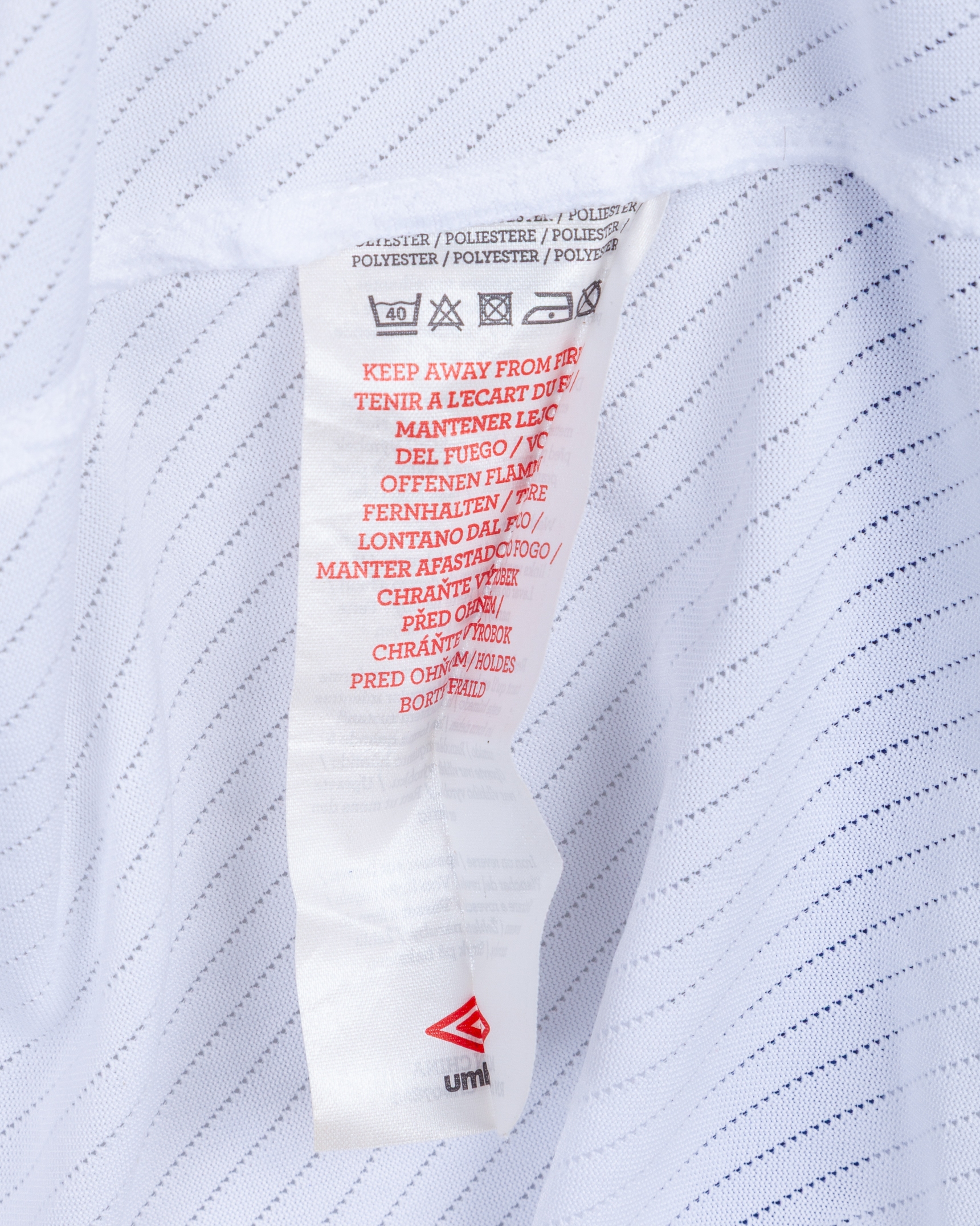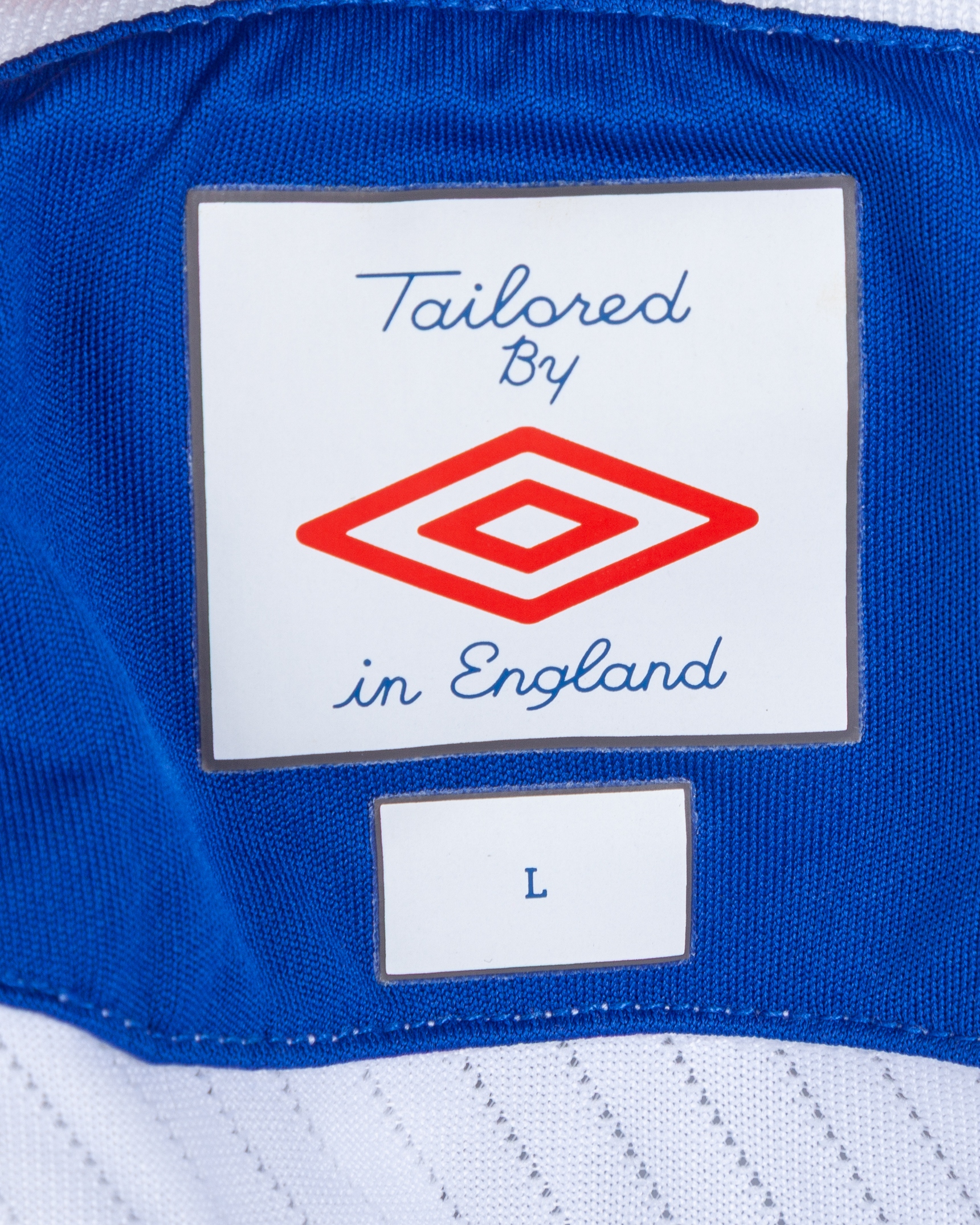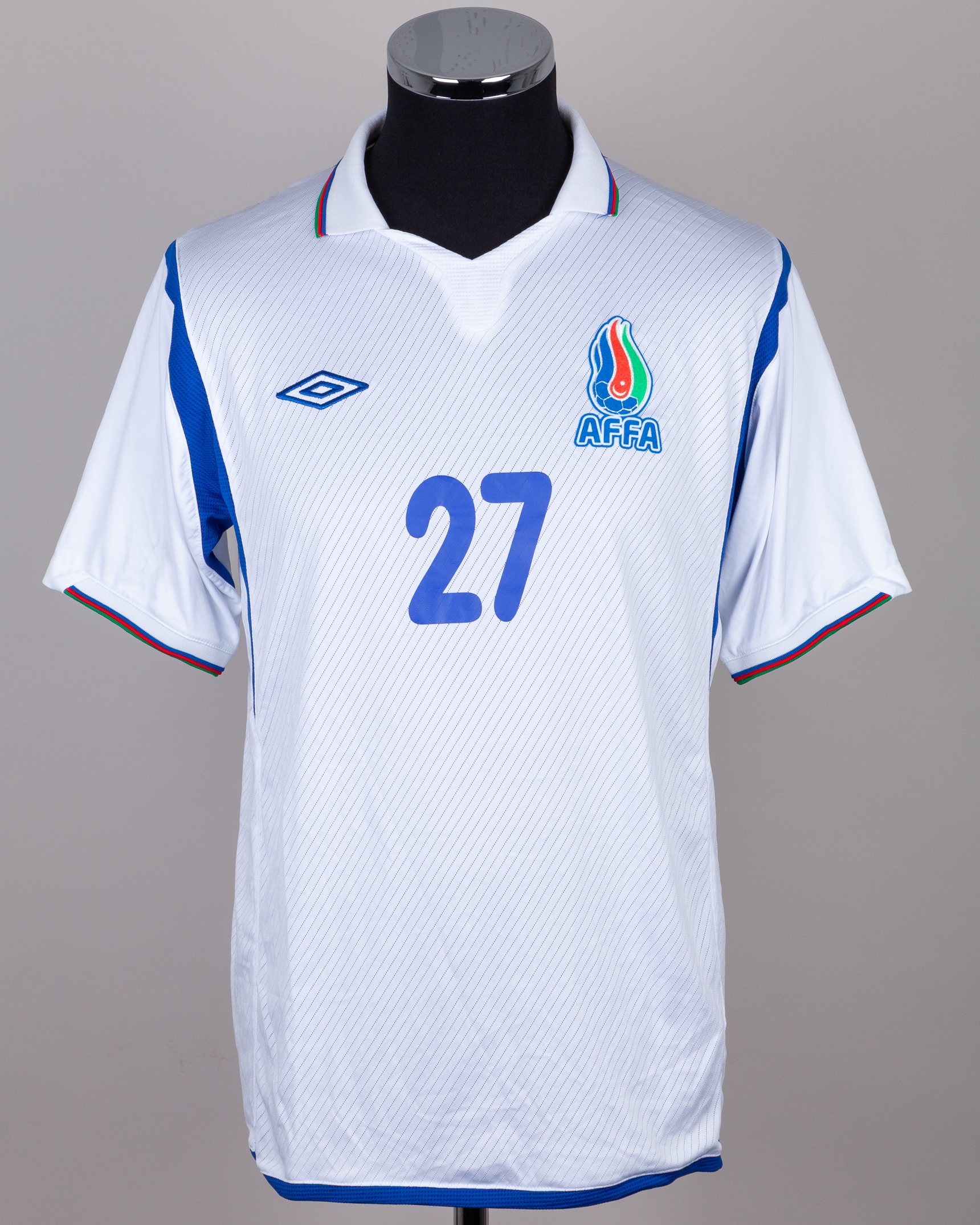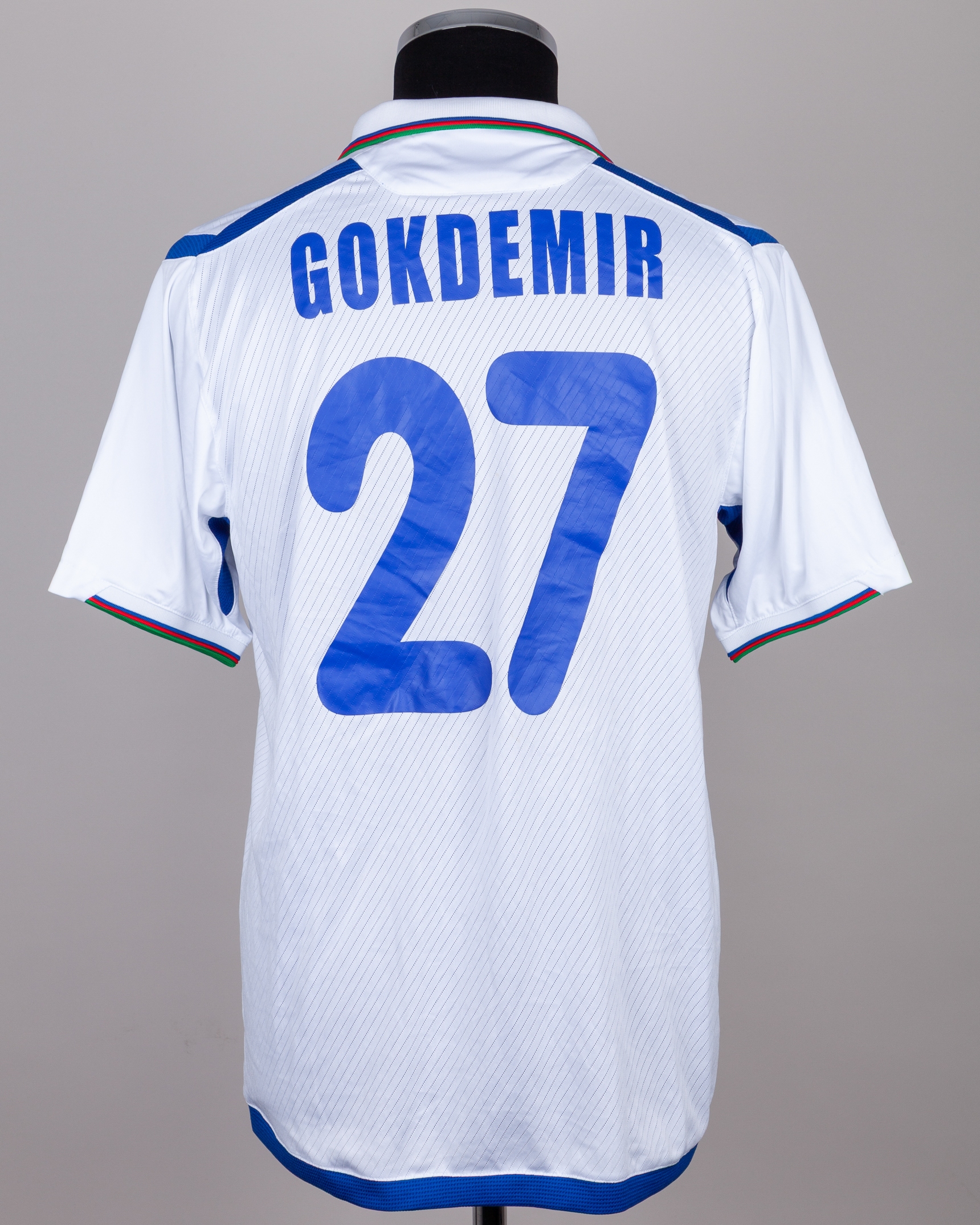 Ali Gokdemir blue and white No.27 Azerbaijan v. Japan short-sleeved shirt, 2012, Umbro, L, with v-neck collar and felt badge, the reverse lettered GOKDEMIR