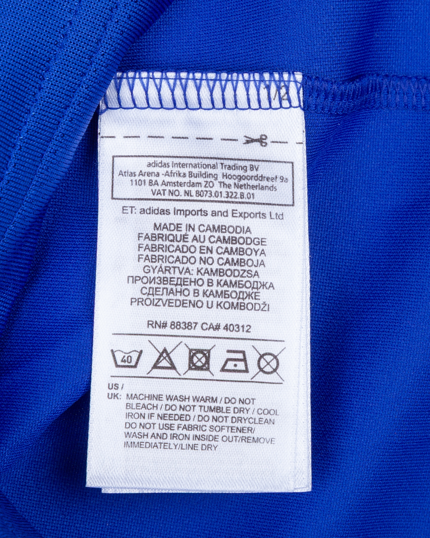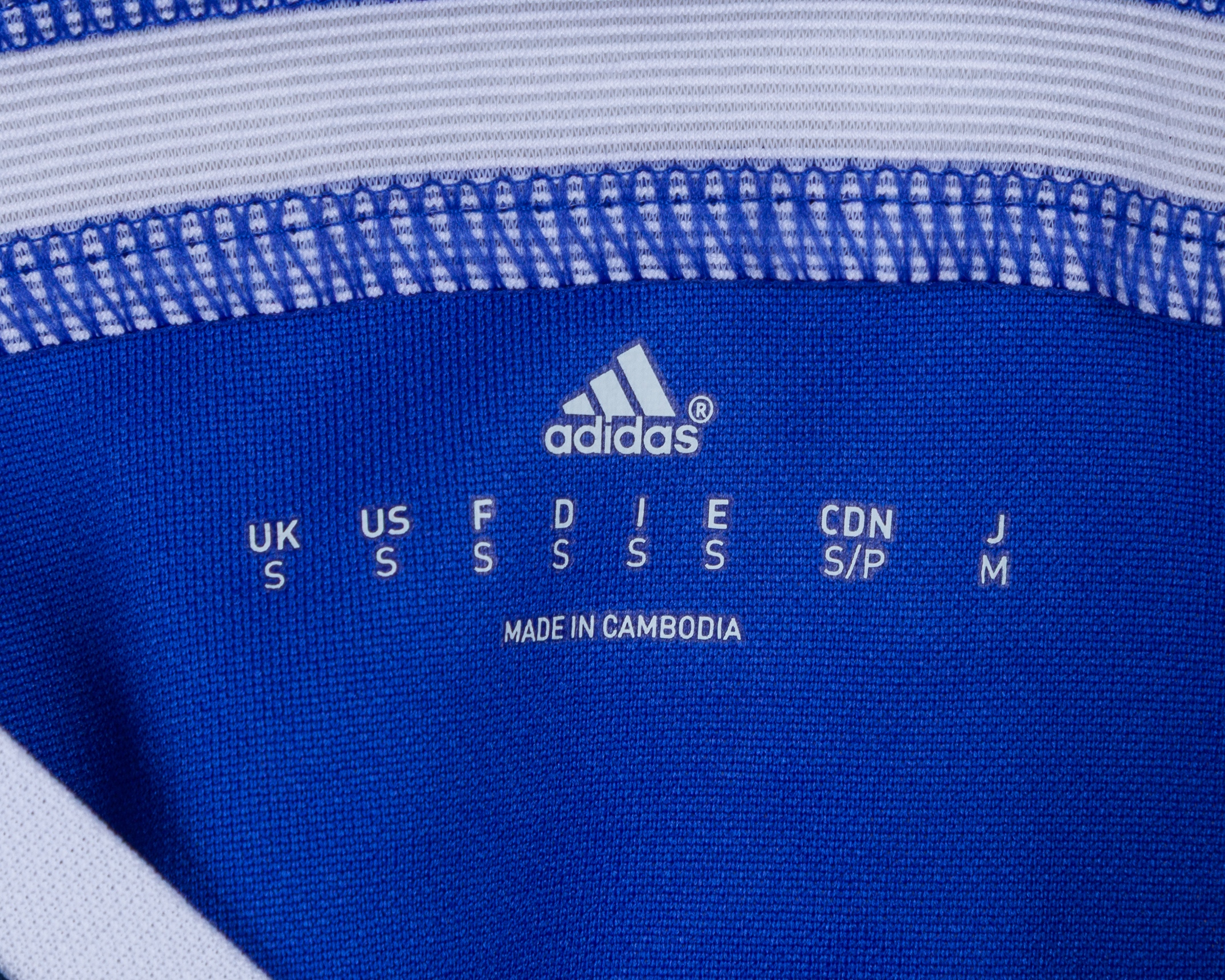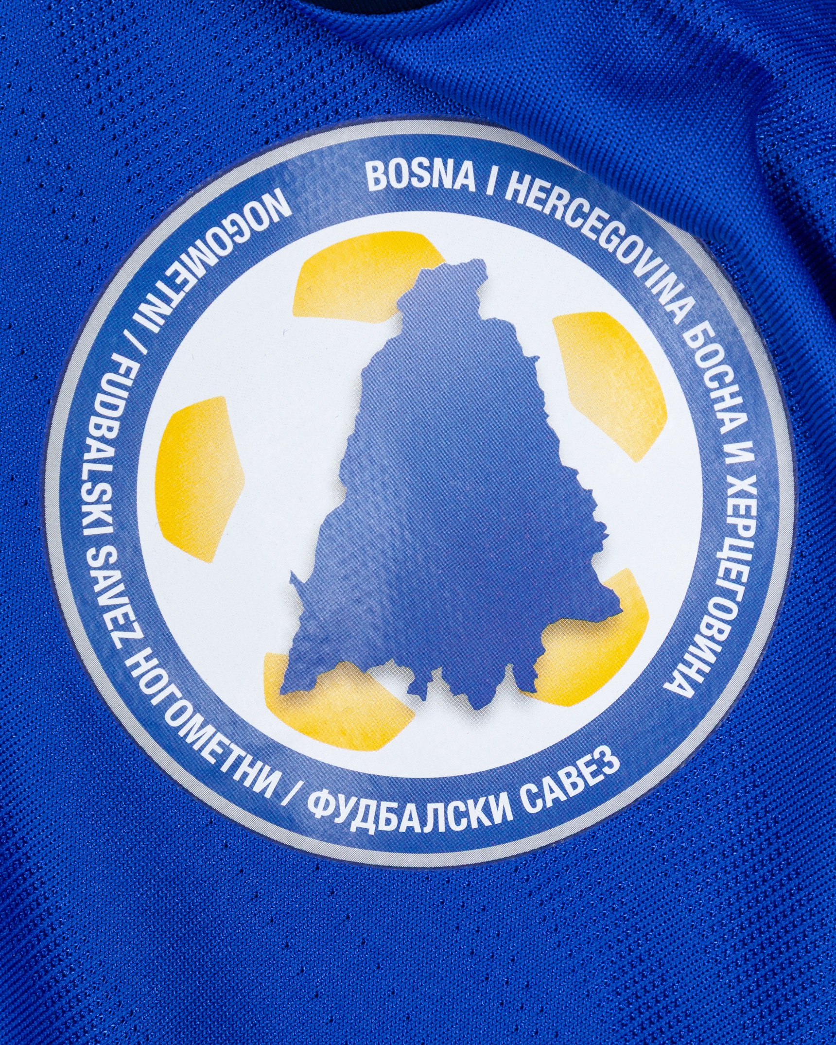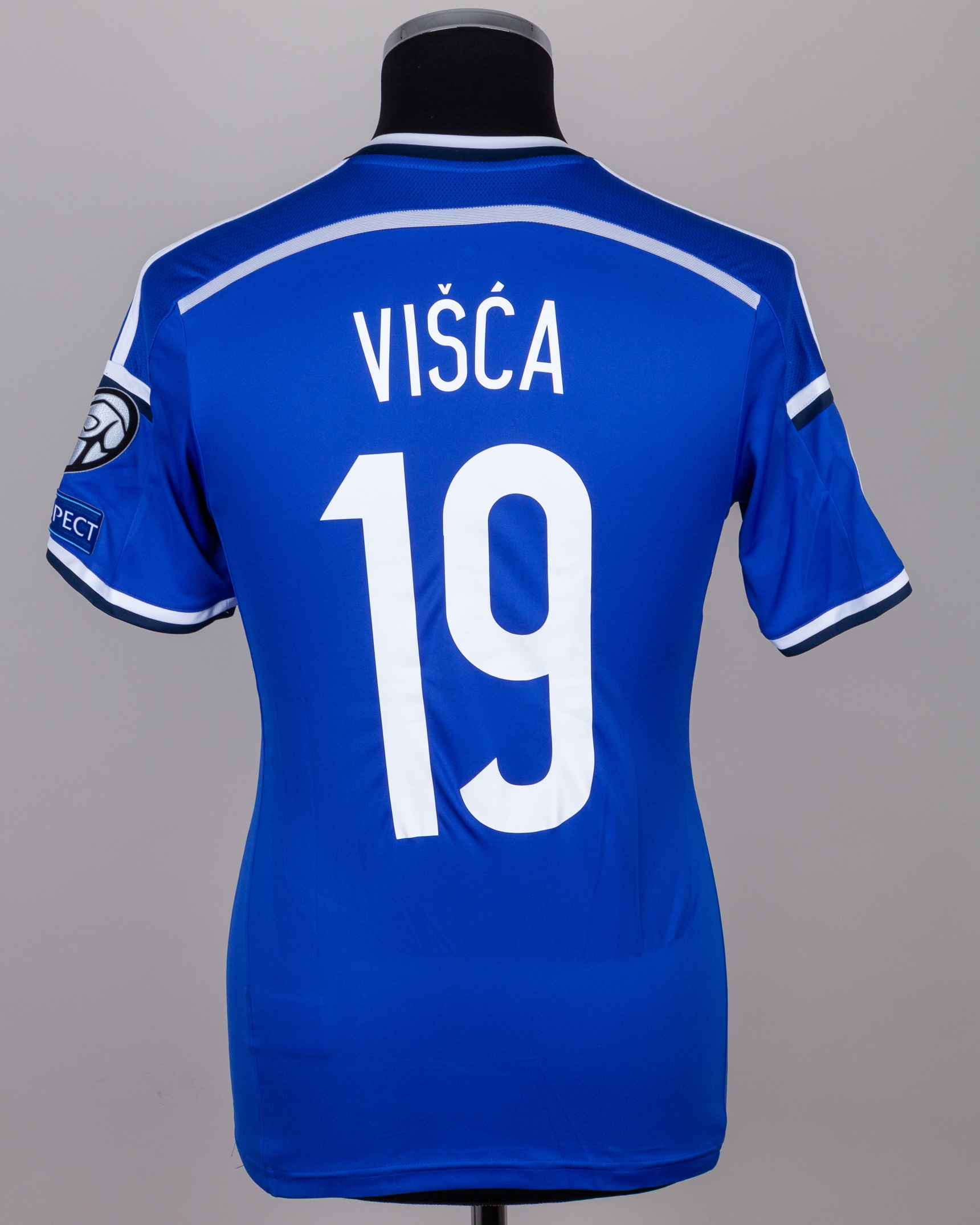 Erin Visca blue and white No.19 Bosnia v. Belgium short-sleeved shirt, 2015, Adidas, S, with v-neck collar and printed badge, the reverse lettered VISCA, the right sleeve with Euro flash, the other with UEFA Respect flash