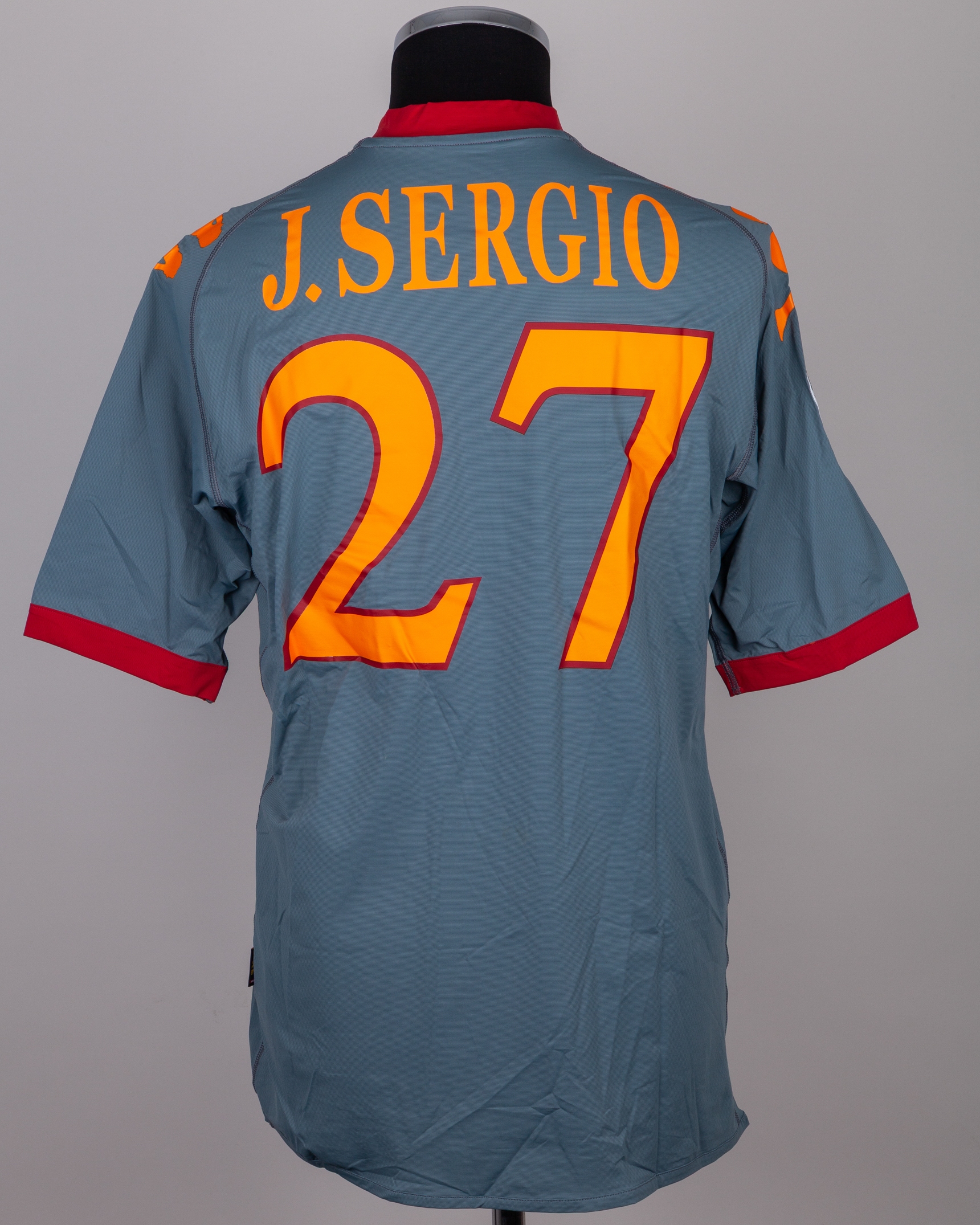 Julio Sergio grey and red No.27 AS Roma short-sleeved shirt, 2009-10, Kappa, with v-neck collar and embroidered cloth badge inscribed ASR, the reverse lettered J. SERGIO, the right sleeve with Lega Calcio Serie A flash
