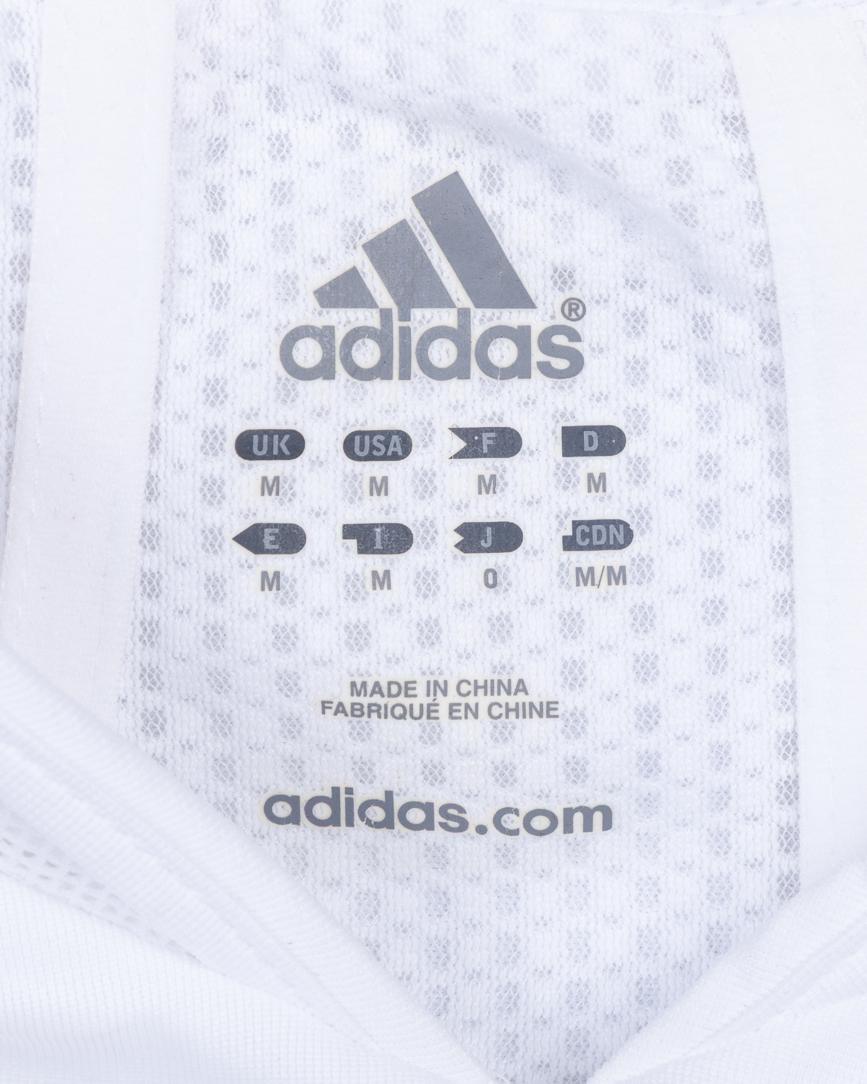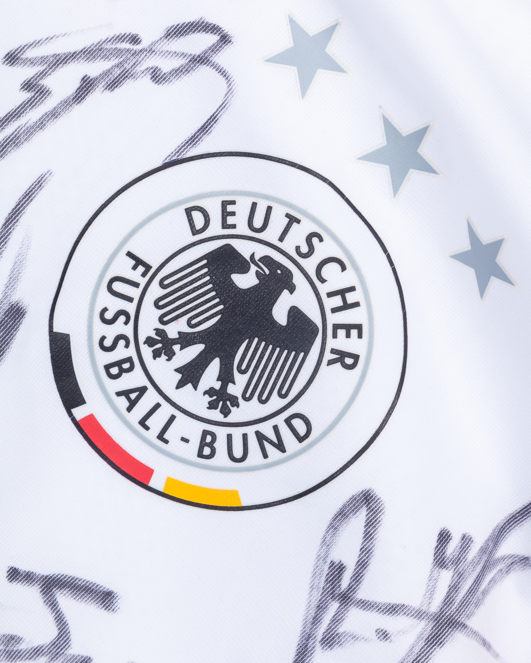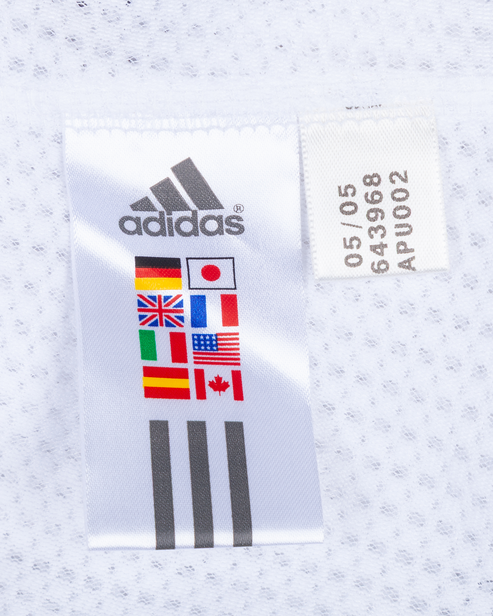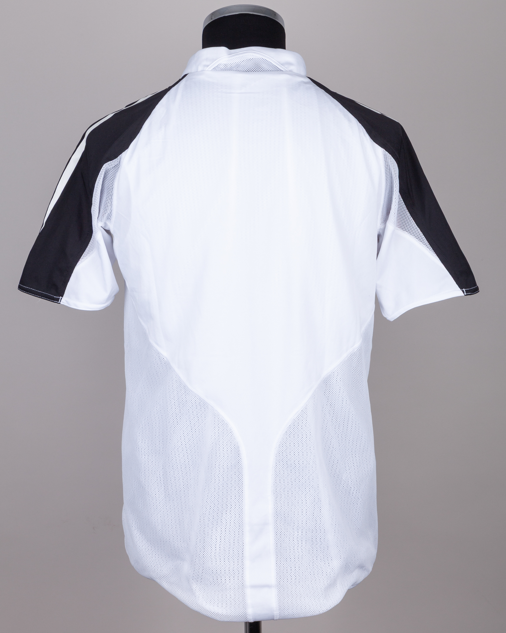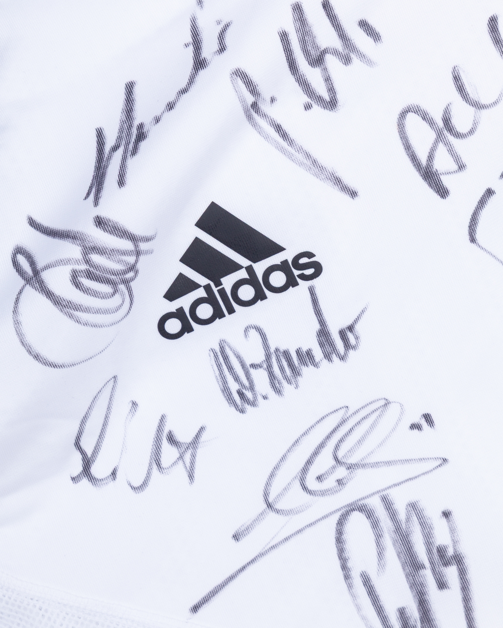 A white Germany squad signed short-sleeved shirt, 2005-06, Adidas, M, with v-neck collar