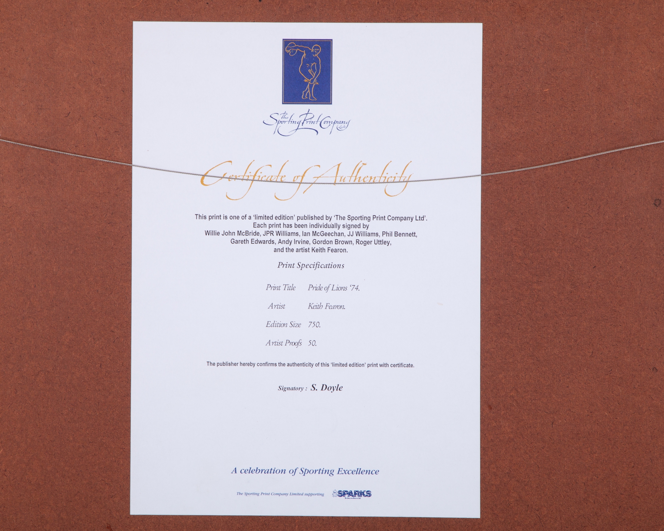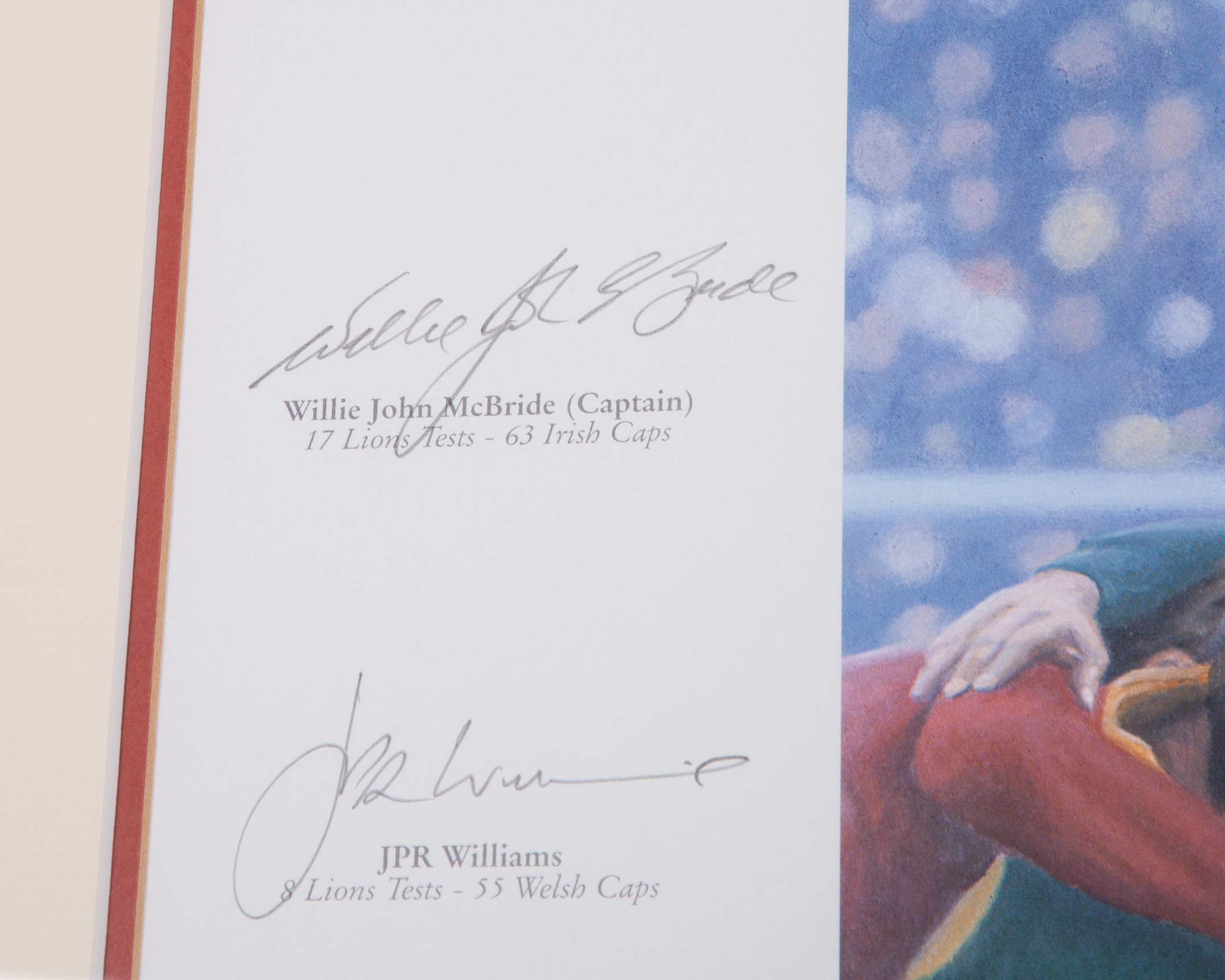 Pride of Lions '74 by Keith Fearon autographed limited edition print, 42/750, with nine autographs including Willie John McBride, JPR Williams, Ian McGeechan, JJ Williams, Phil Bennett, Gareth Edwards, Andy Irvine, Gordon Brown and Roger Uttley, with COA, framed and glazed, 87 x 65cm