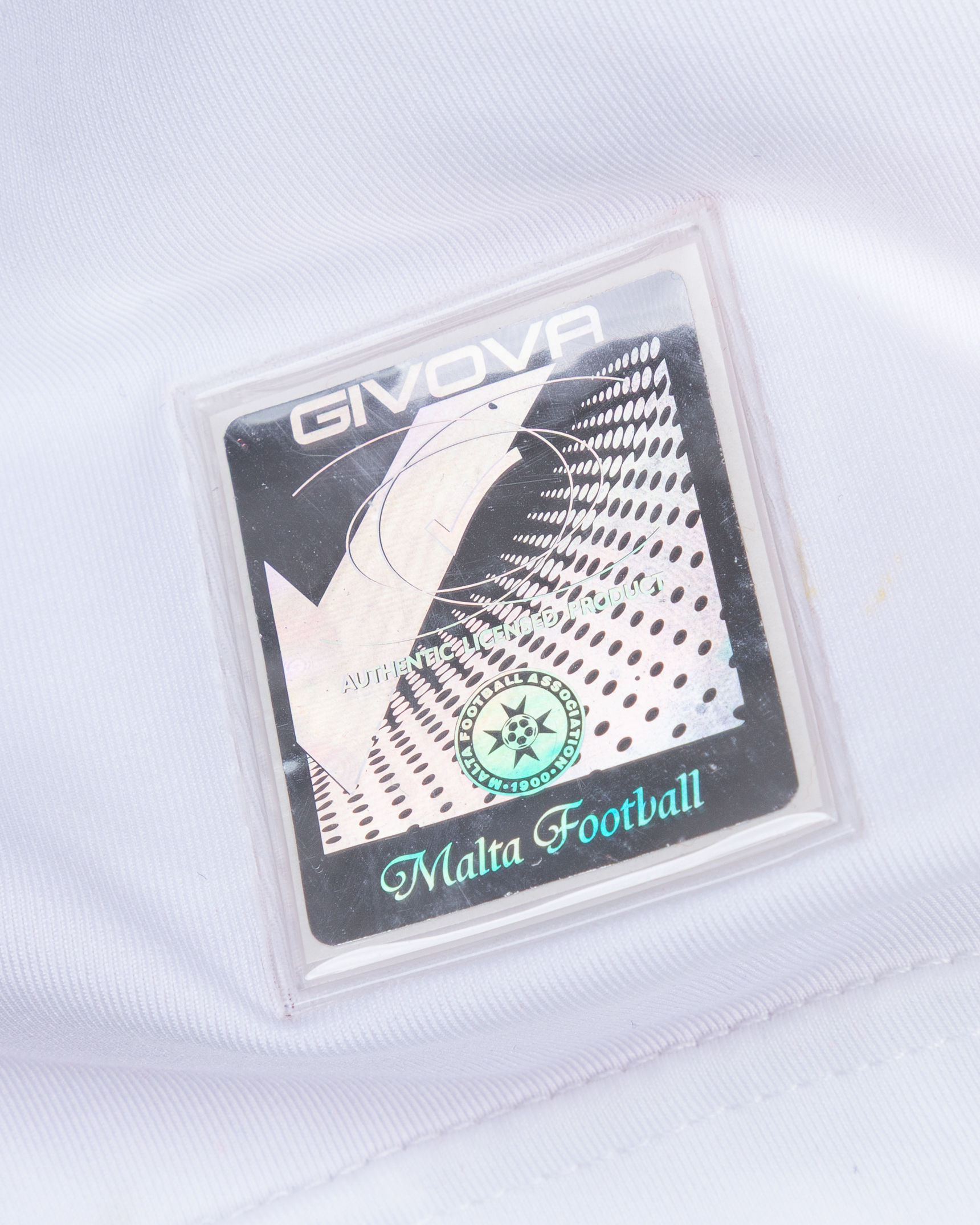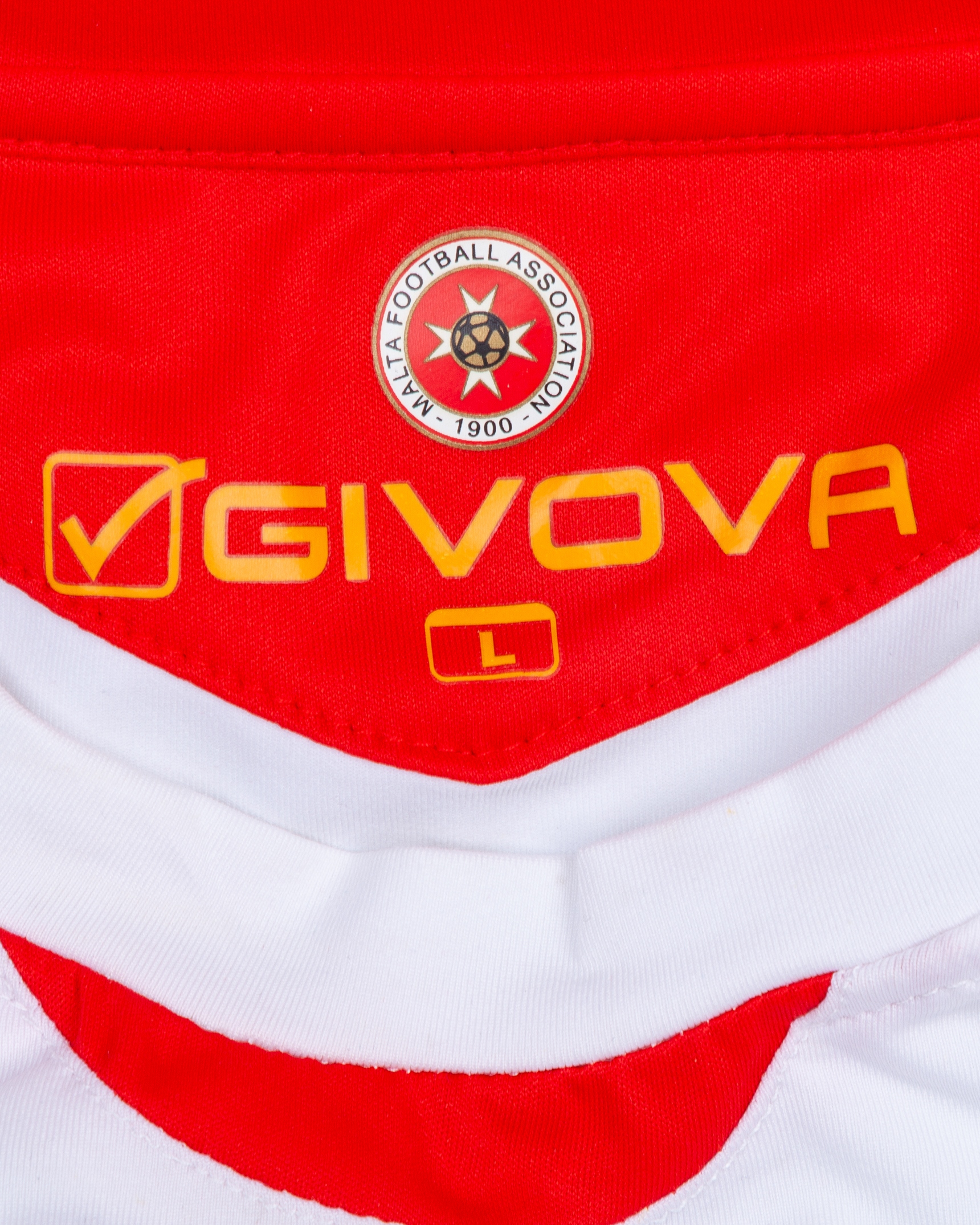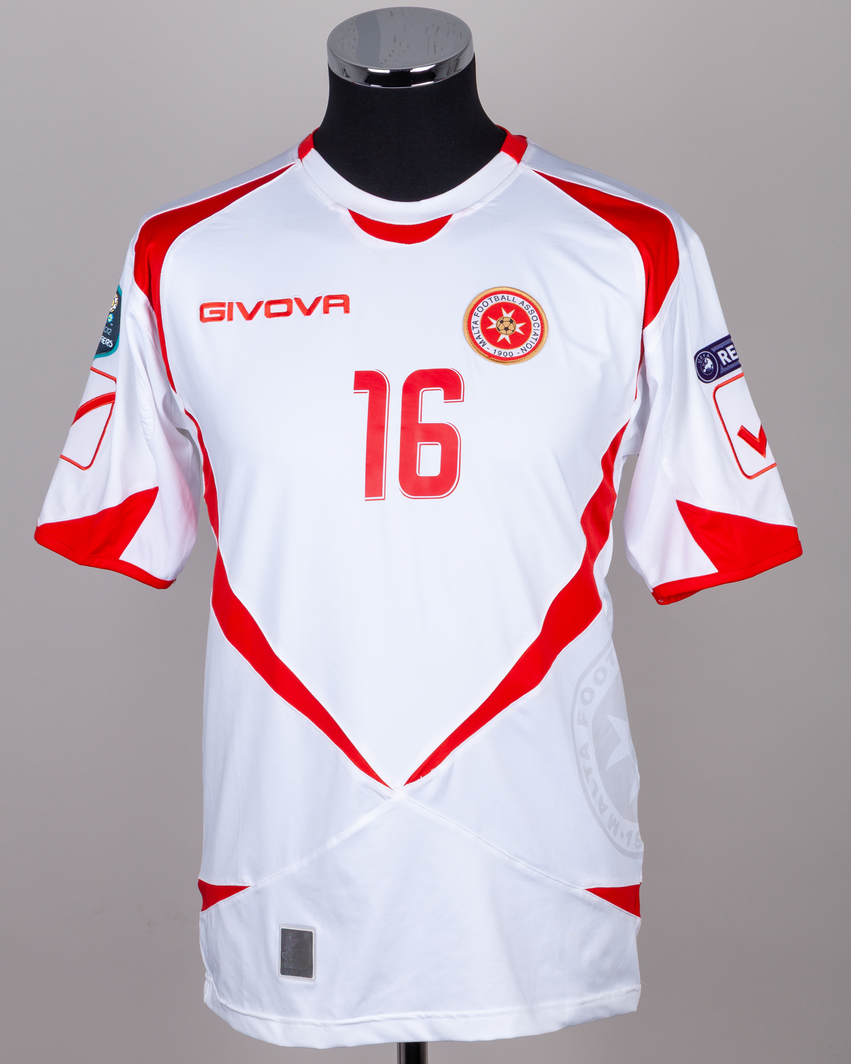 Paul Fenech white and red No.16 Malta v. Croatia short-sleeved shirt, 2010, Givova, L, with crew-neck collar and embroidered cloth badge inscribed MALTA FOOTBALL ASSOCIATION 1900, the right sleeve with UEFA EURO 2012 Qualifiers flash, the other with UEFA Respect flash