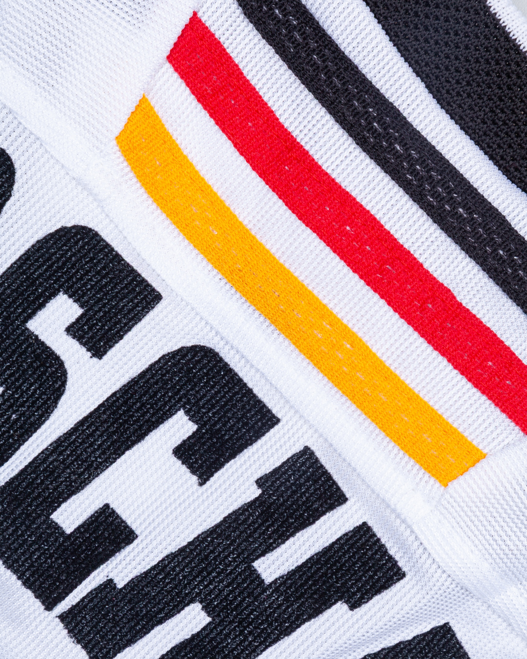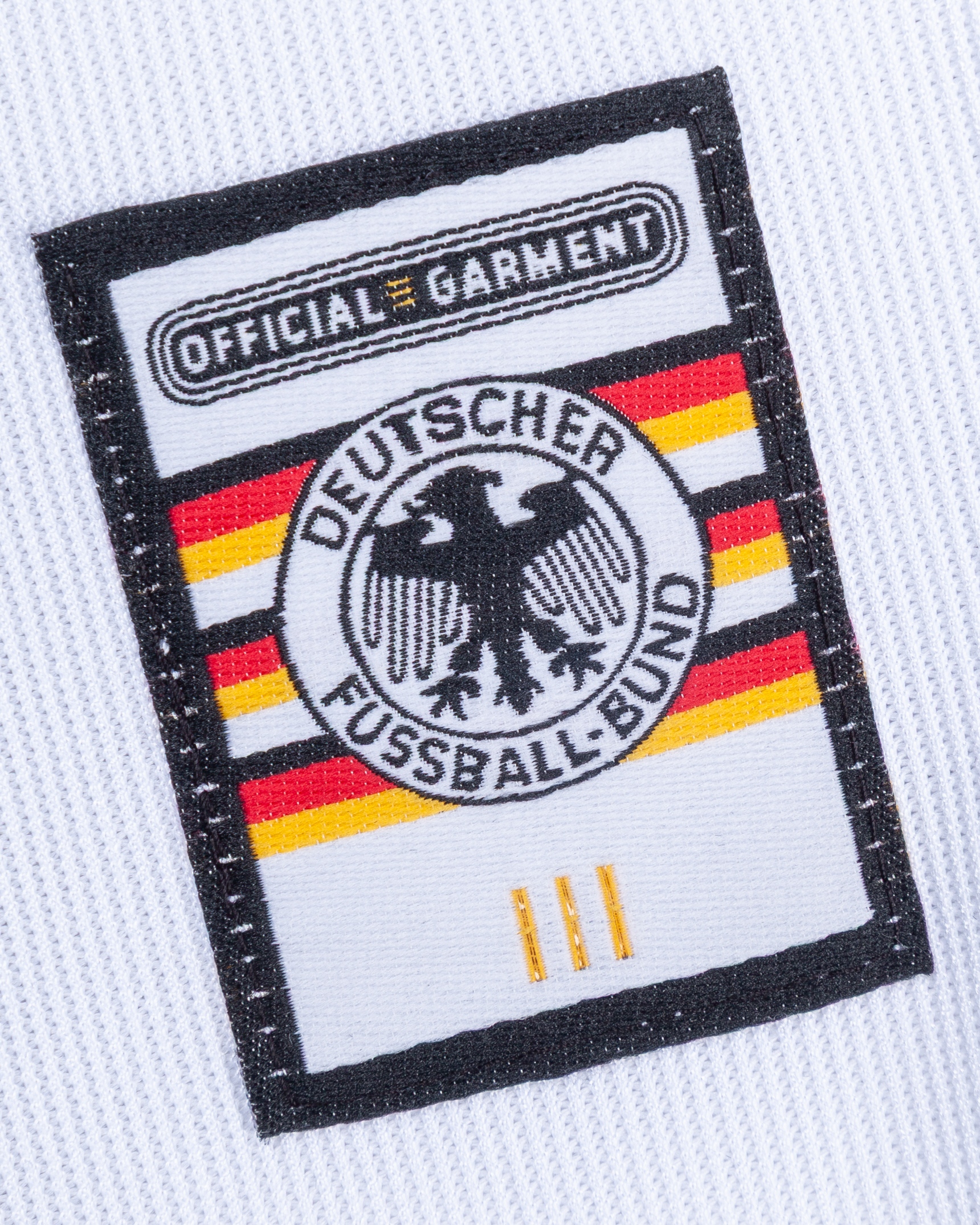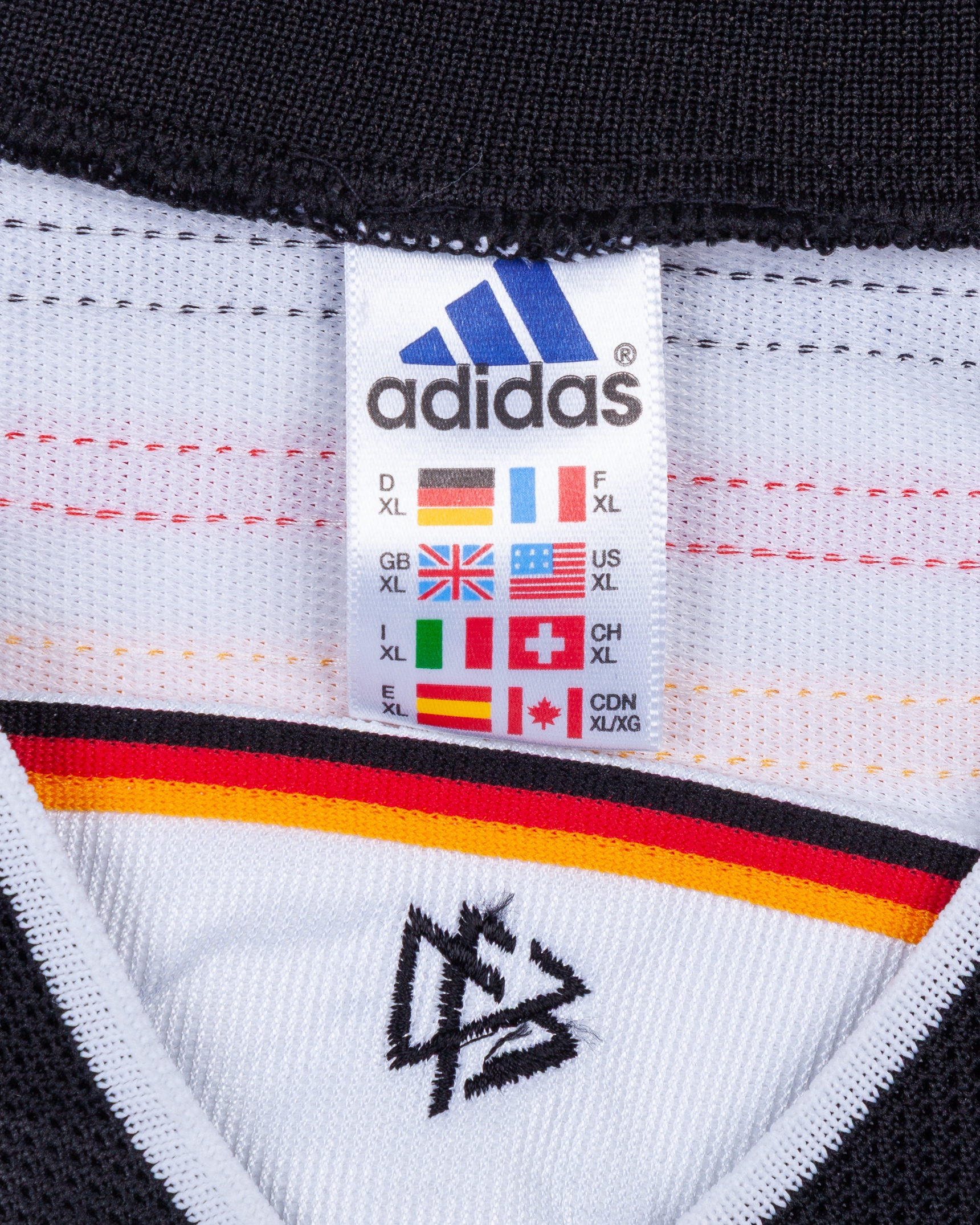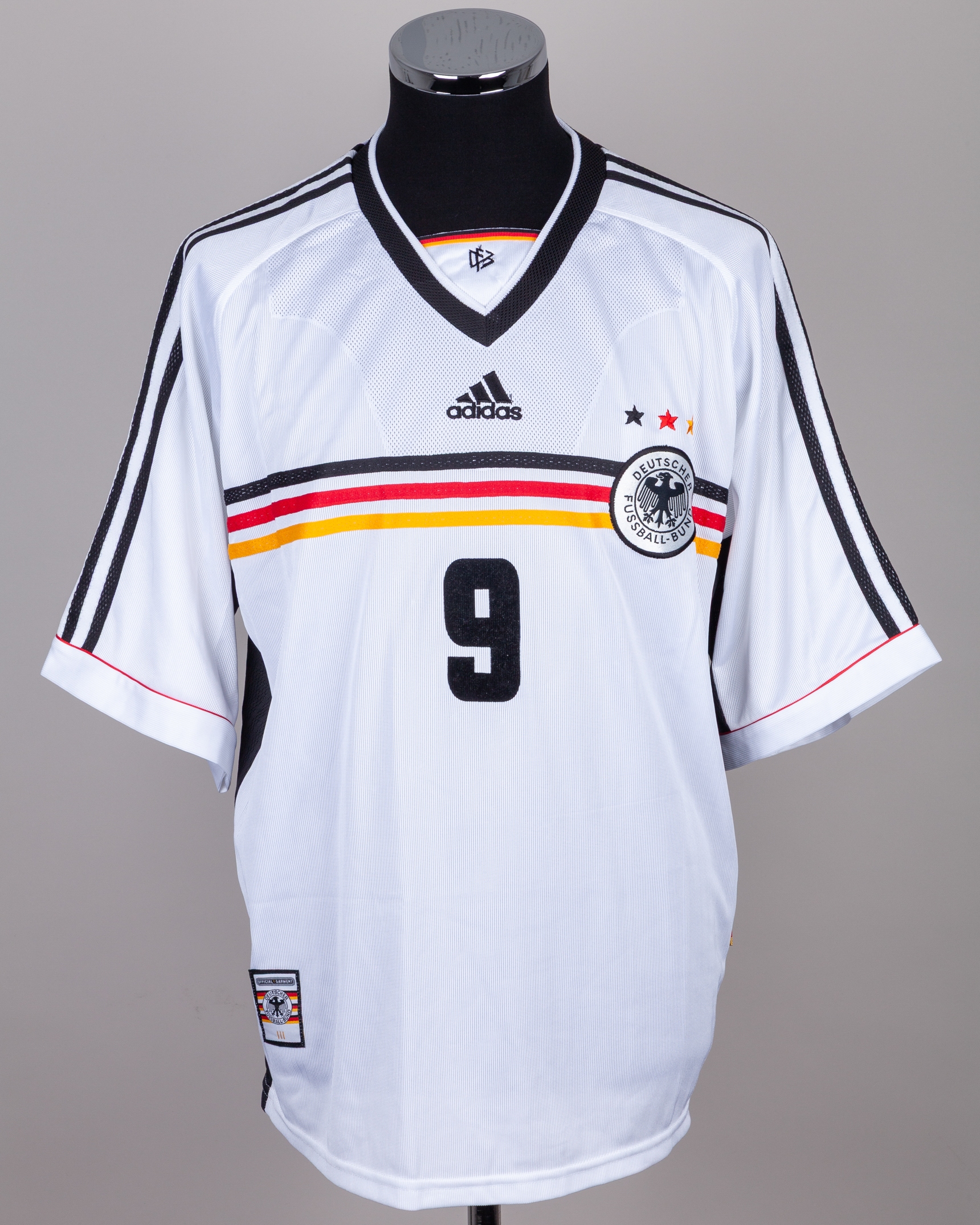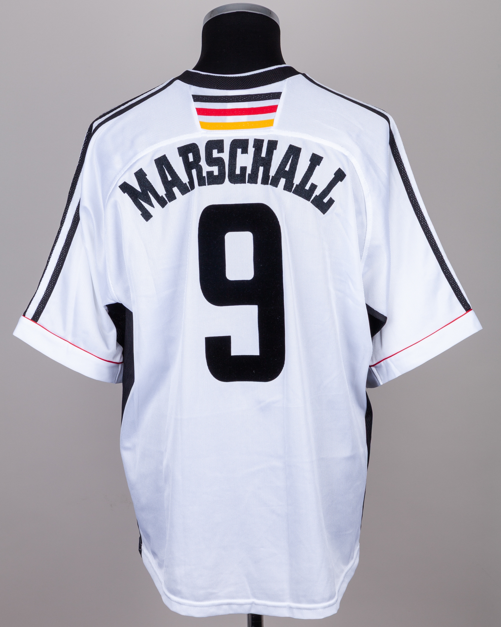 Olaf Marschall white and black No.9 Germany Confederations Cup shirt, 1999, Adidas, XL, with v-neck collar and embroidered cloth badge inscribed DEUTSCHER FUSSBALL BUND, the reverse lettered MARSCHALL, with handwritten letter of authenticity stating the shirt was worn by in either the Brazil or New Zealand match
