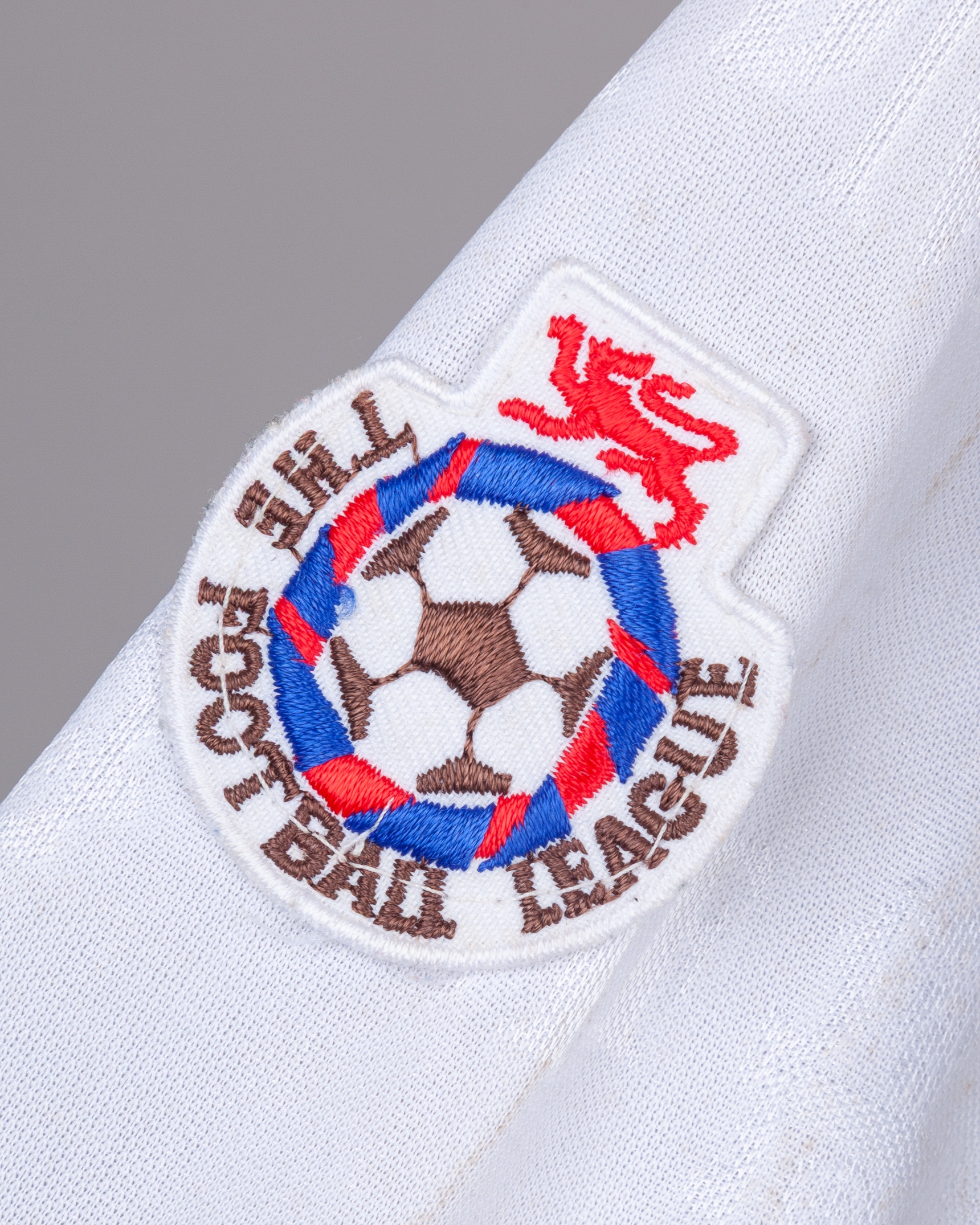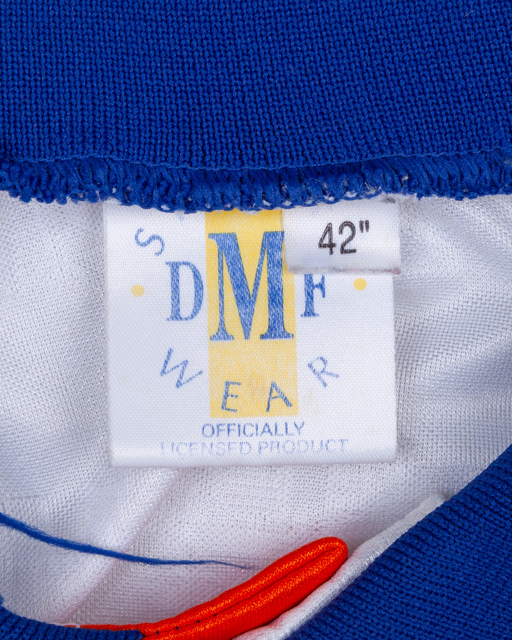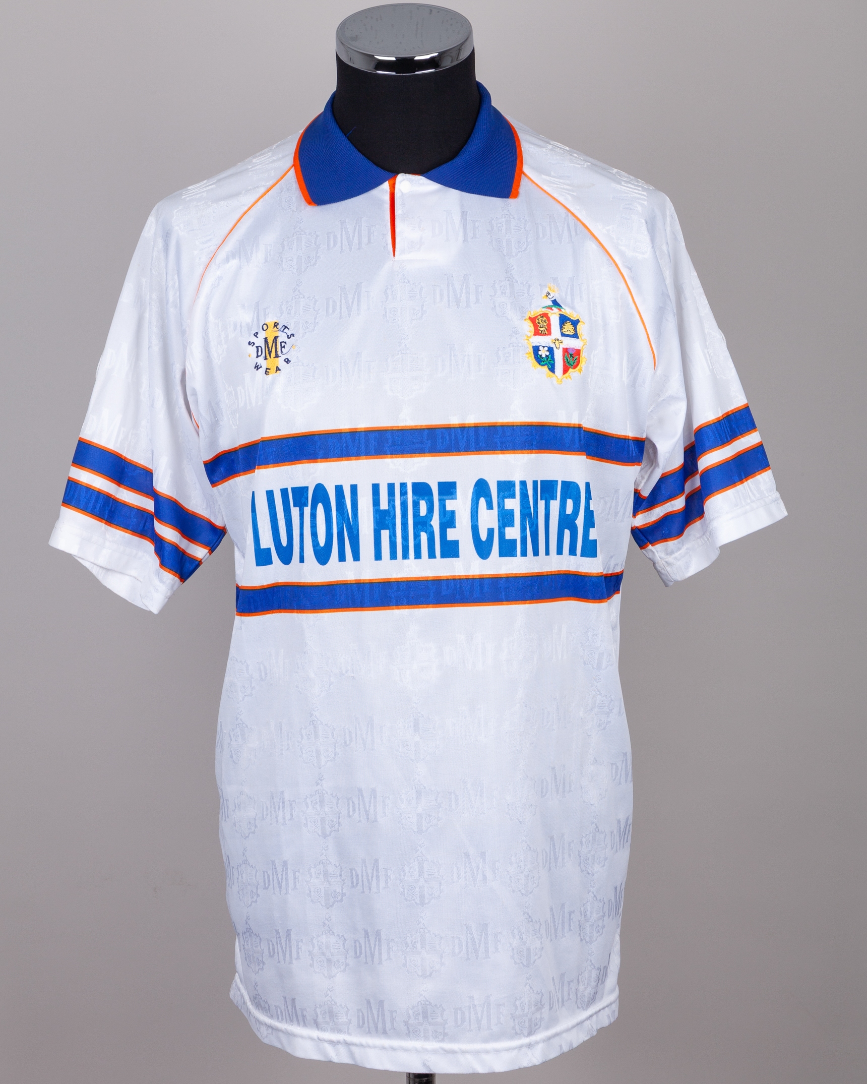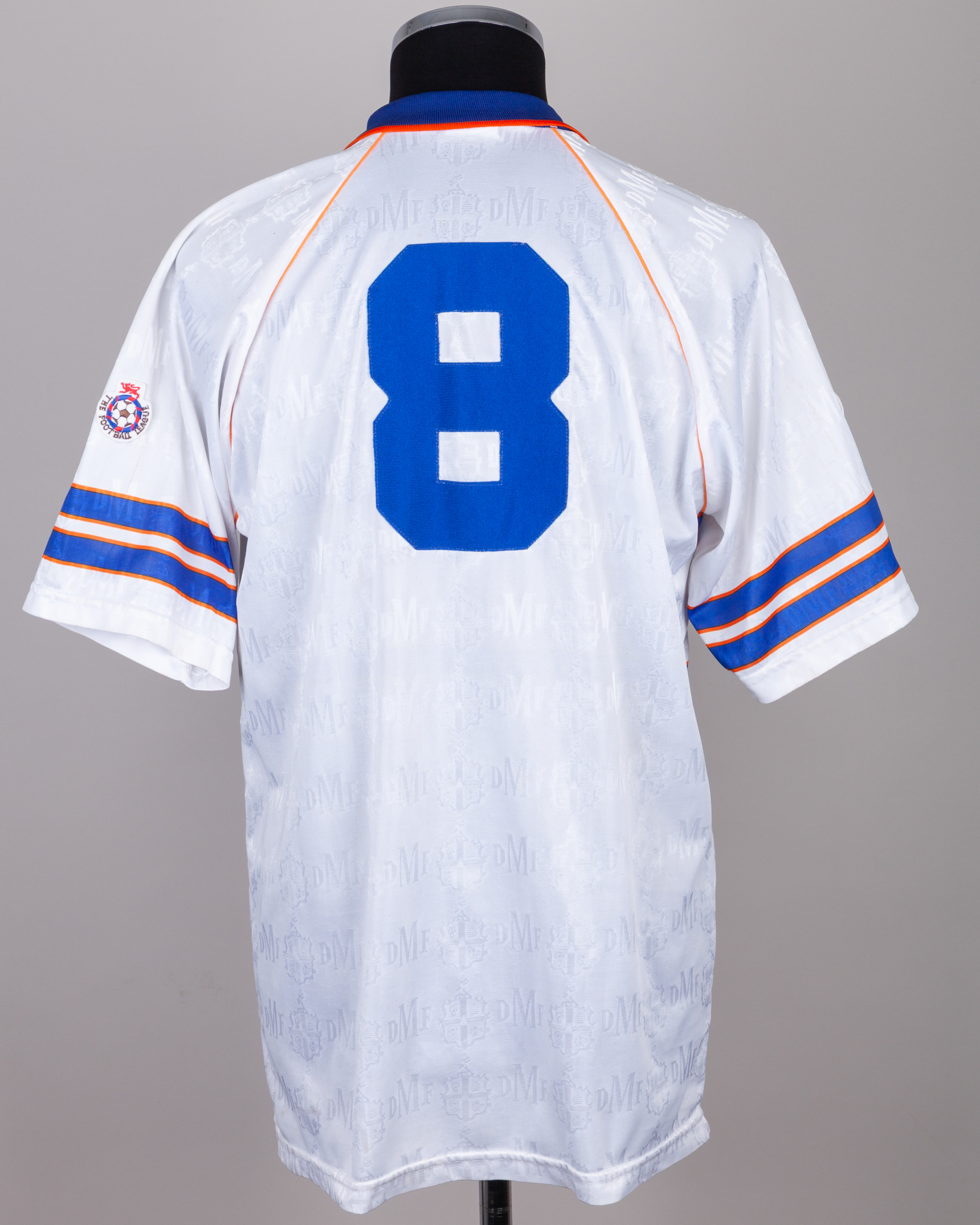 White and blue No.8 Luton Town short-sleeved shirt, 1992-93, DMF Sports Wear, 42, with button-up collar and embroidered badge, the sleeves with The Football League flashes, some staining