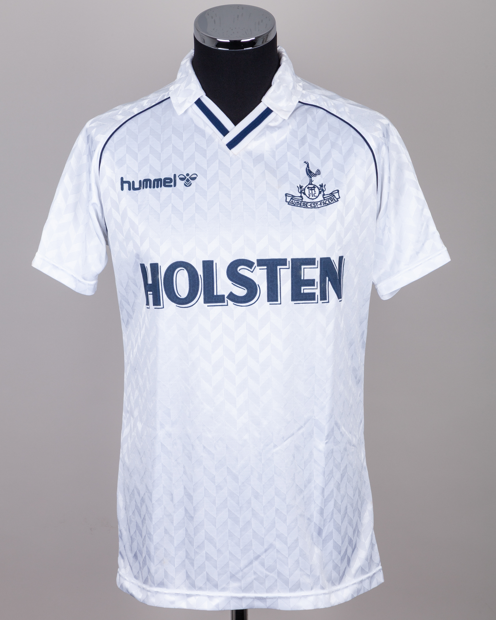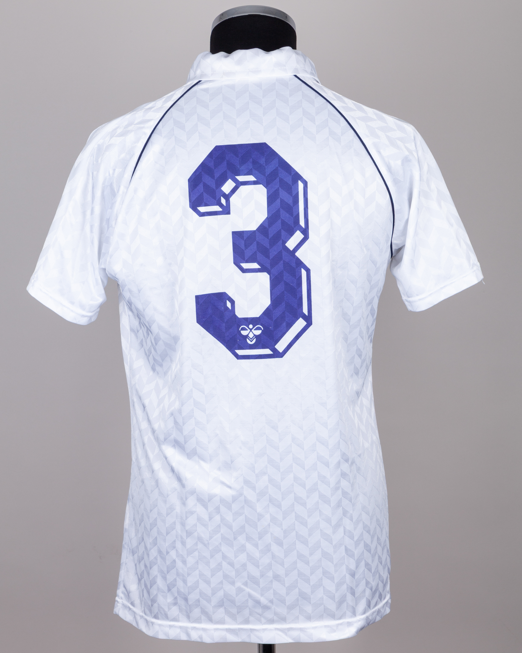 Chris Houghton white and blue No.3 Tottenham Hotspur short-sleeved shirt, 1988-89, Hummel, L, with v-neck collar and embroidered THFC