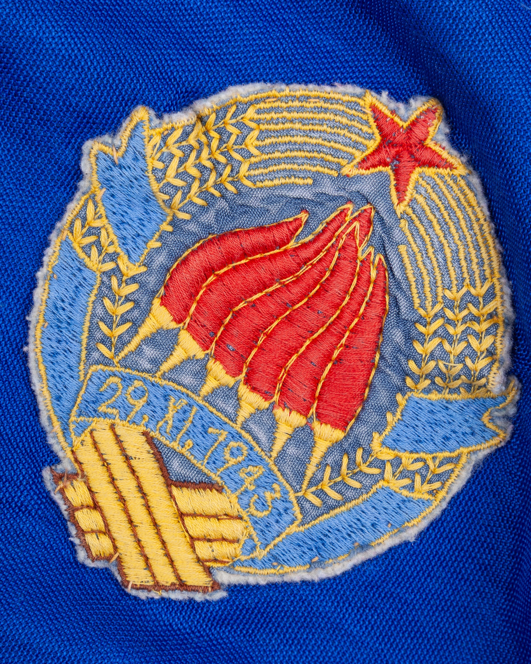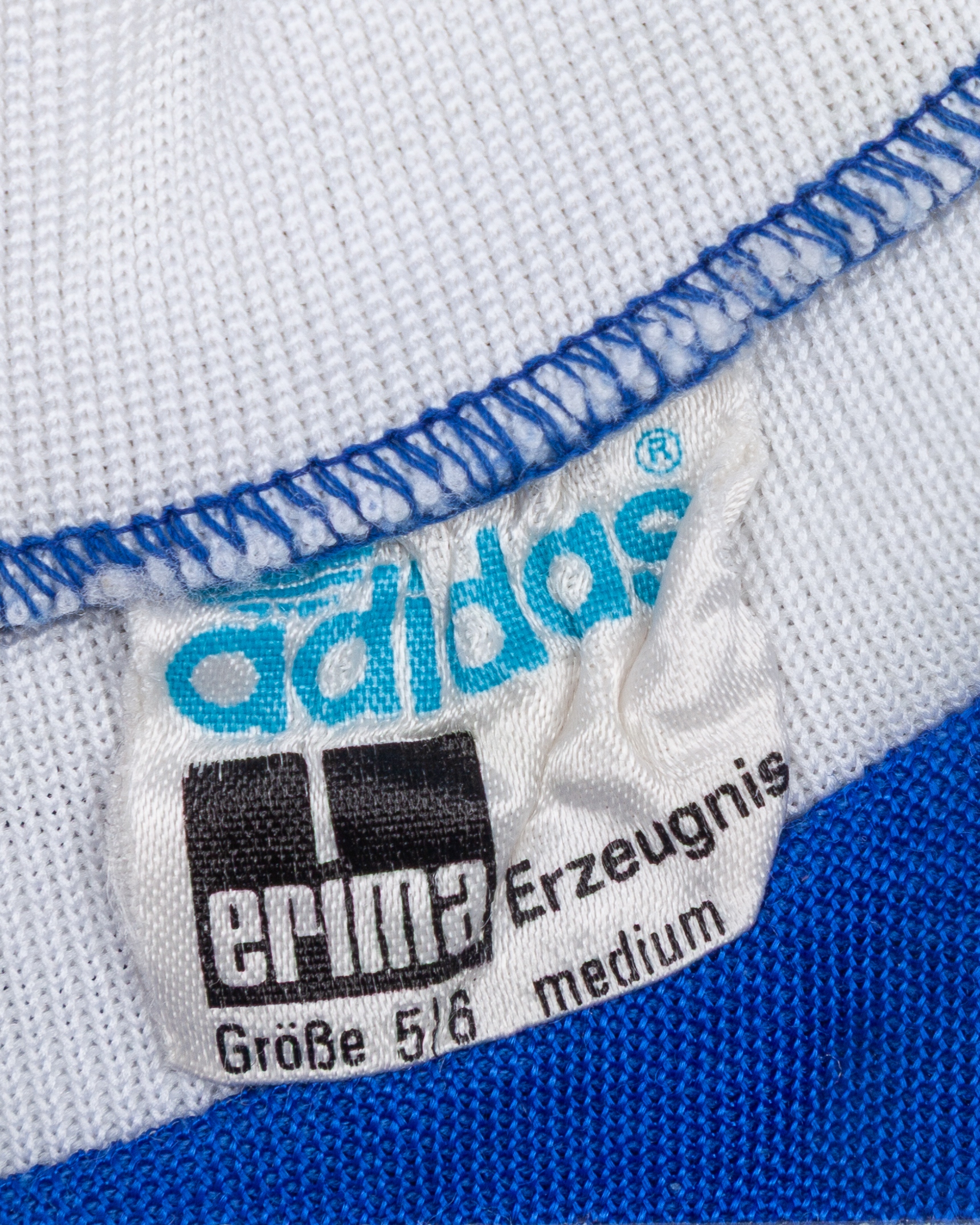 Dragan Dzajic blue and white No.11 Yugoslavia v. Northern Ireland long-sleeved shirt, 1975, Adidas, medium, with crew-neck collar and embroidered cloth badge inscribed 29.XI.1943