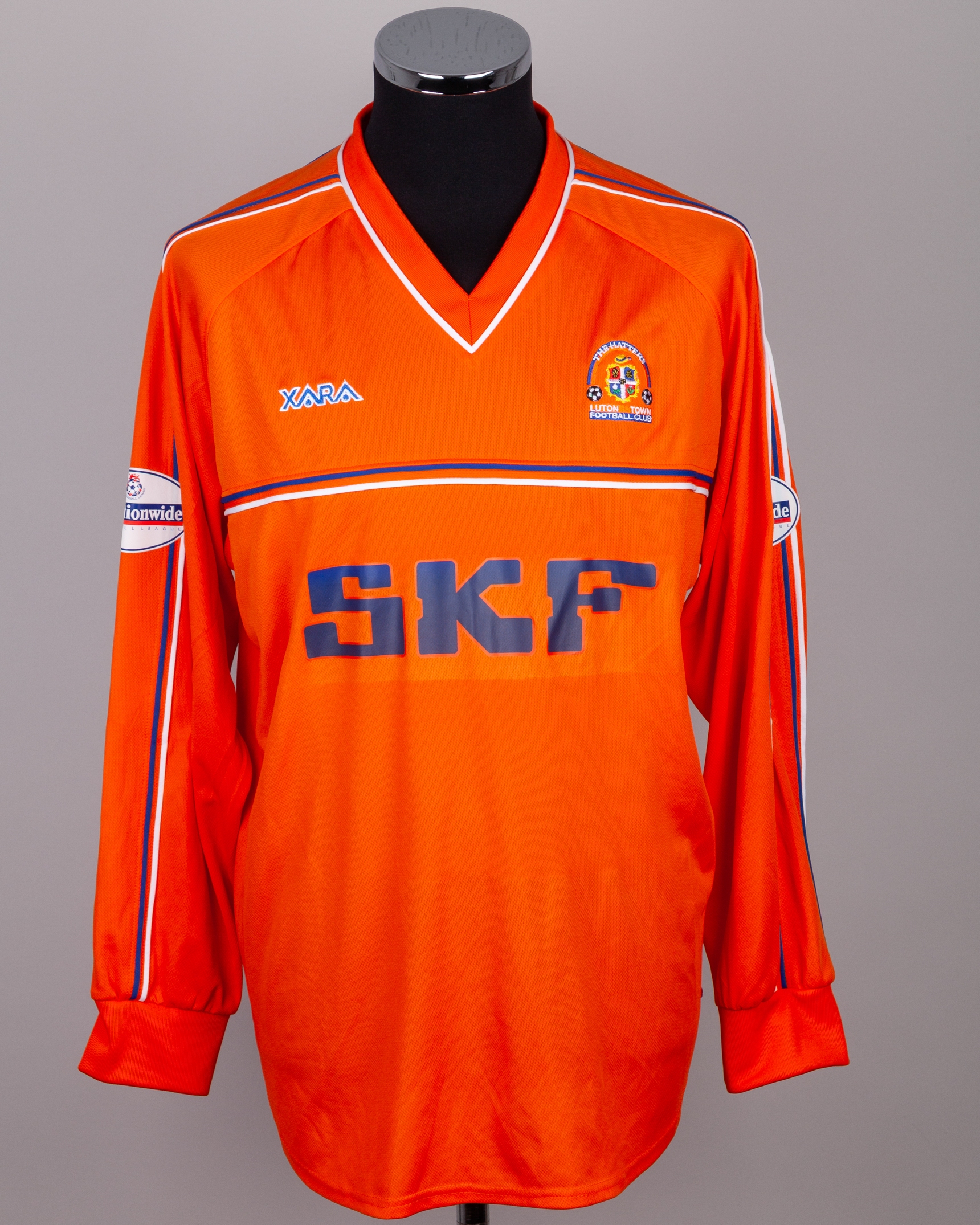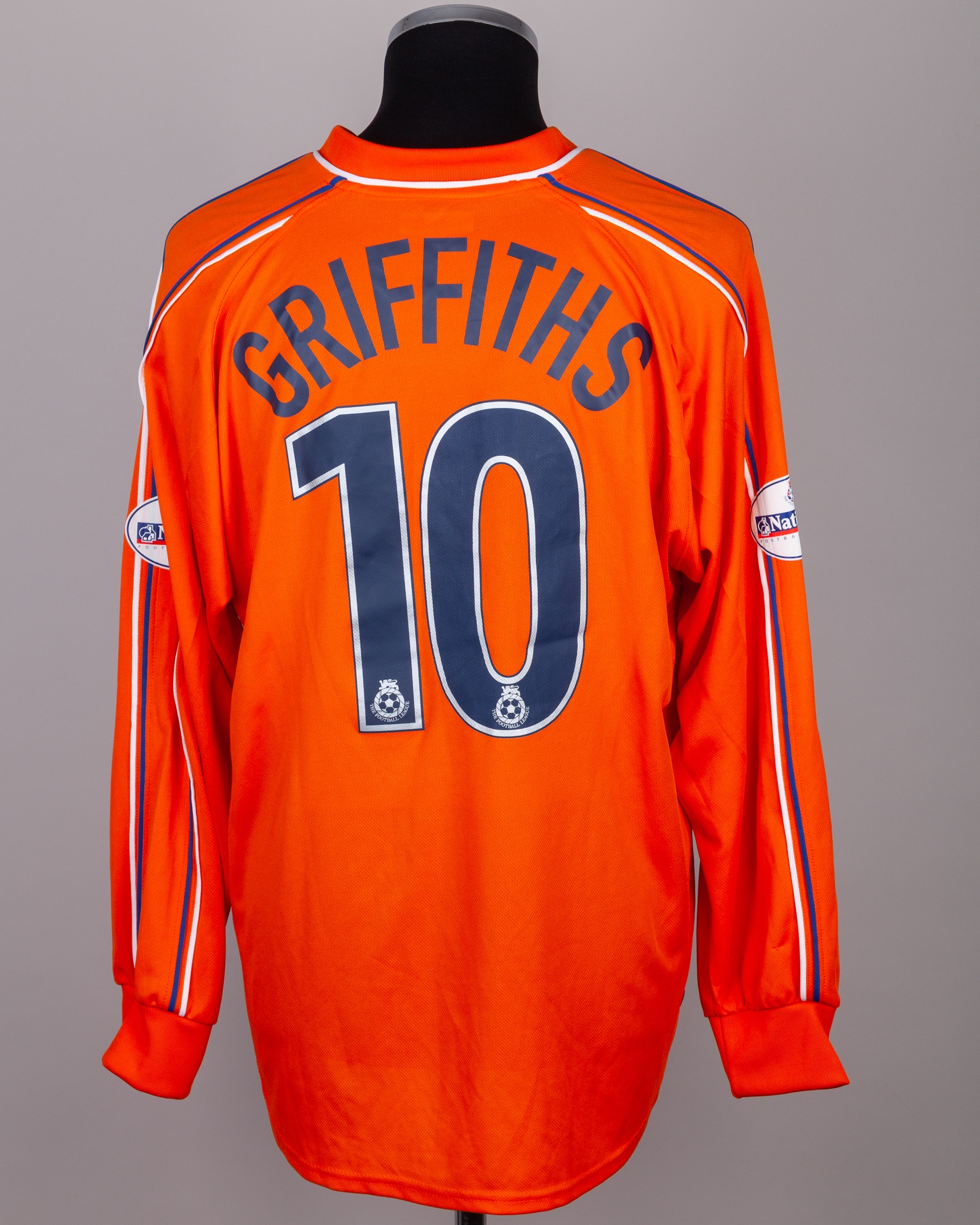 Carl Griffiths orange No.10 Luton Town long-sleeved shirt, 2001-02, XARA, XL, with v-neck collar and embroidered badge, inscribed THE HATTERS LUTON TOWN FOOTBALL CLUB, the reverse lettered GRIFFITHS, the sleeves with Nationwide Football League flashes
