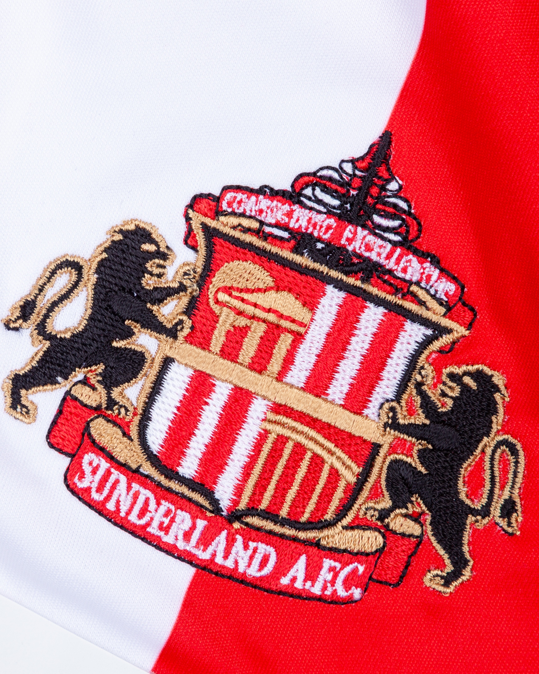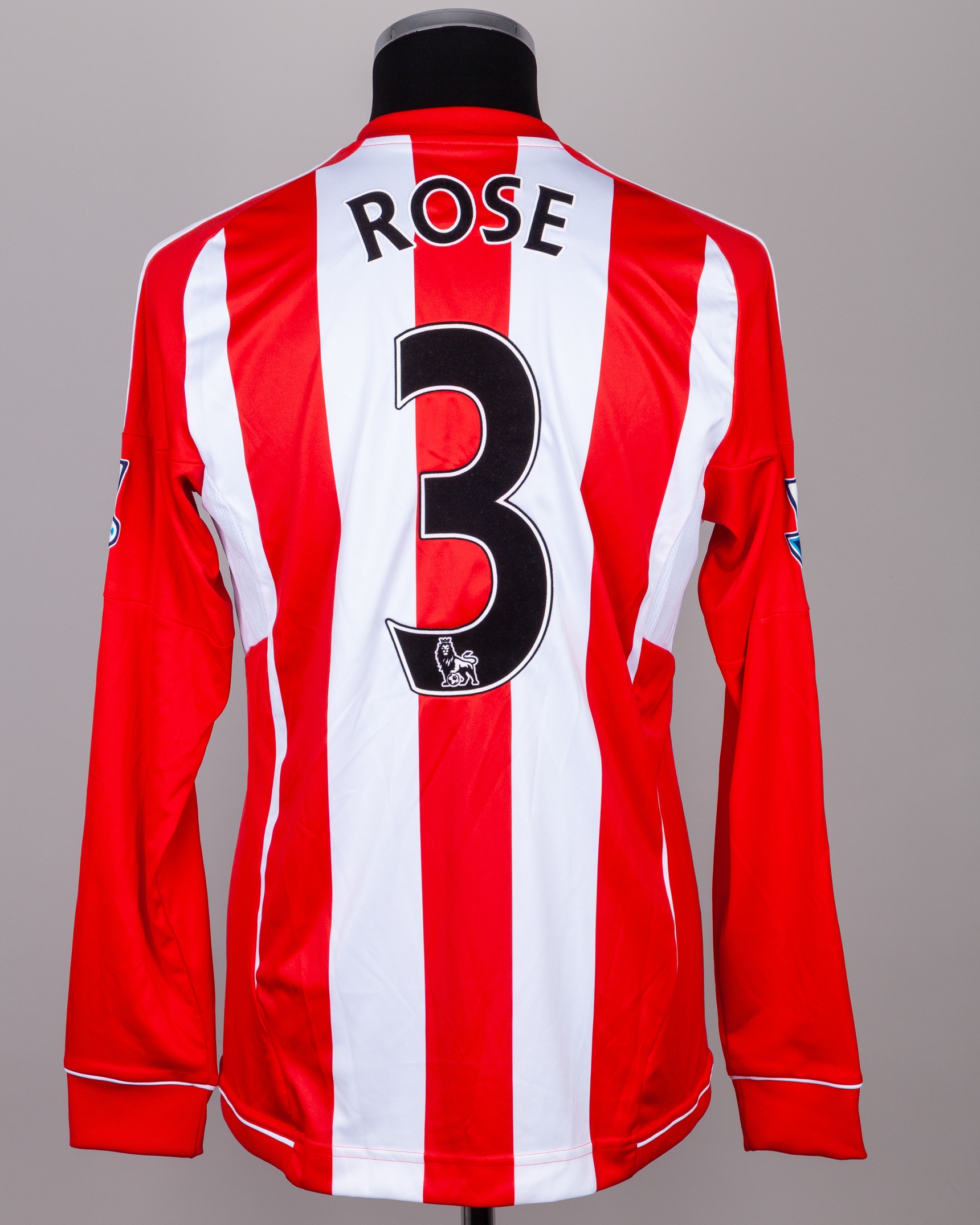 Danny Rose red and white No.3 Sunderland v. Everton long-sleeved shirt, 2012, Adidas, M, with v-neck collar and embroidered badge inscribed SUNDERLAND A.F.C., with Poppy decal, the reverse lettered ROSE, the sleeves with Barclays Premier League flashes