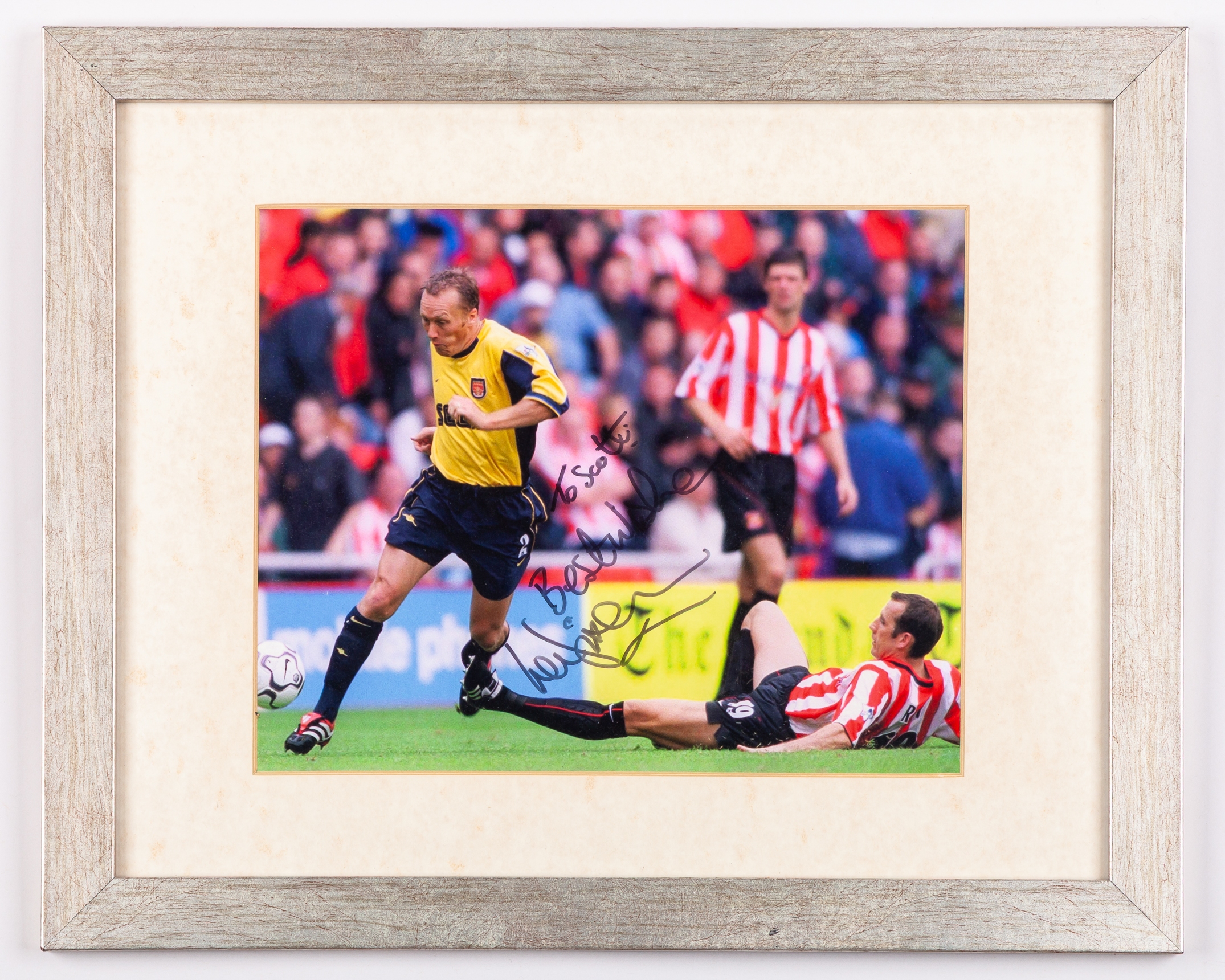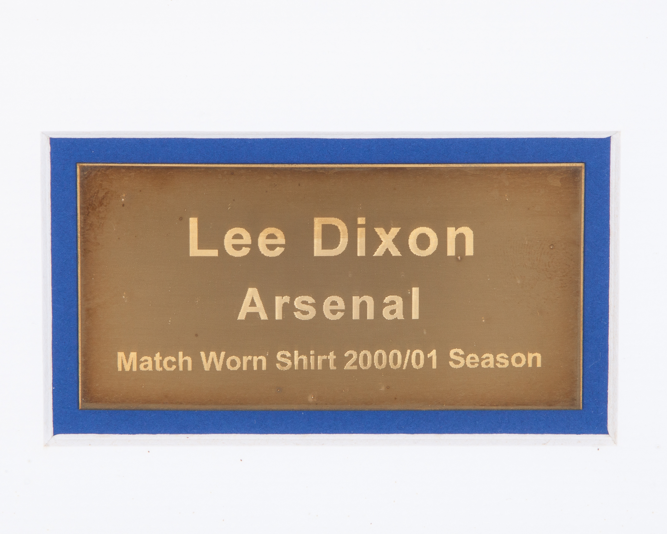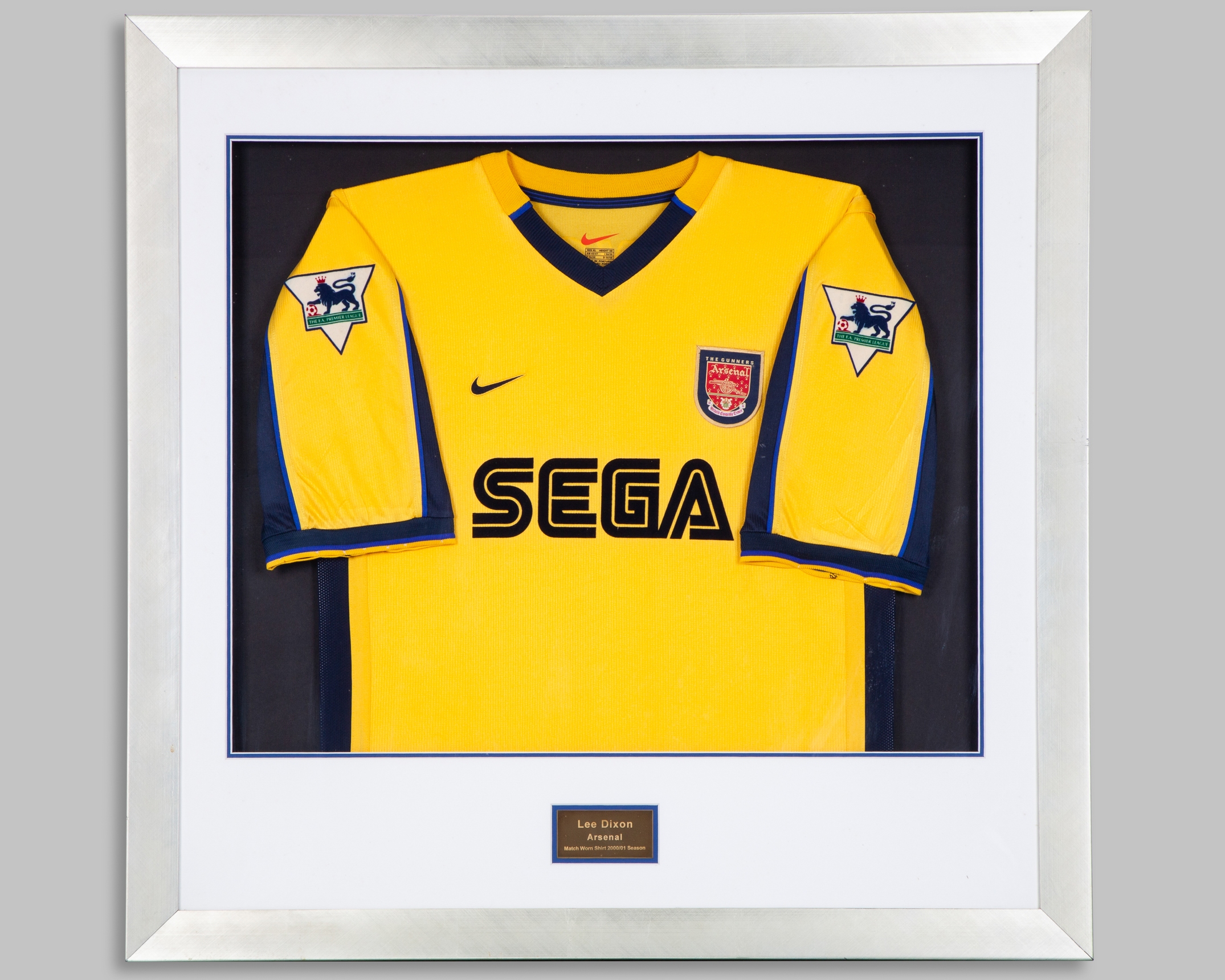 Lee Dixon yellow and blue Arsenal short-sleeved shirt, 2000-01, Nike, XL, with v-neck collar and embroidered cloth badge inscribed THE GUNNERS Arsenal Victoria Concordia Crescit, the sleeves with The F.A. Premier League flashes, with COA stating Lee Dixon match worn shirt, framed and glazed, 90 x 88cm, two Lee Dixon autographed action colour photographs, one framed and glazed, 40 x 32cm (3)