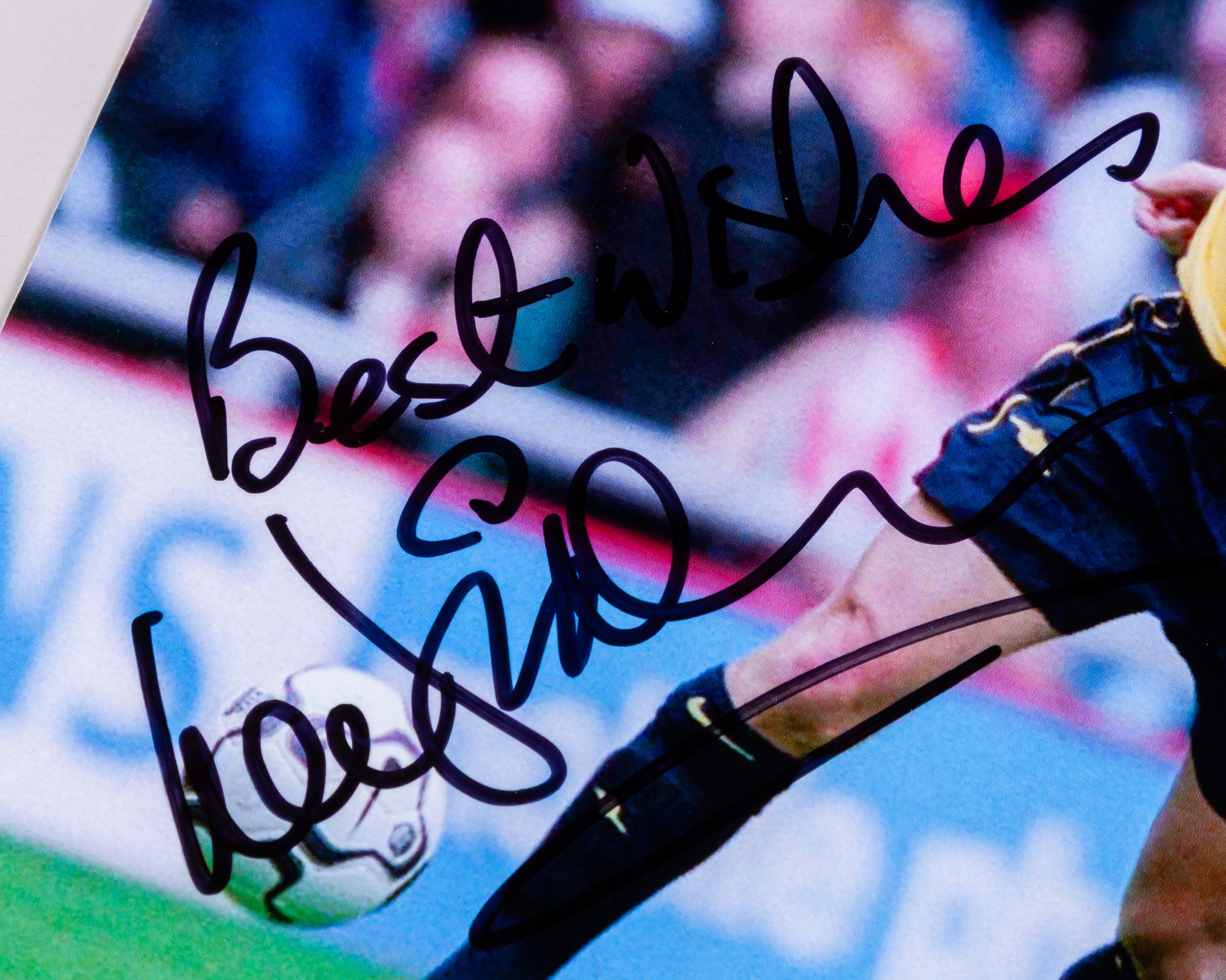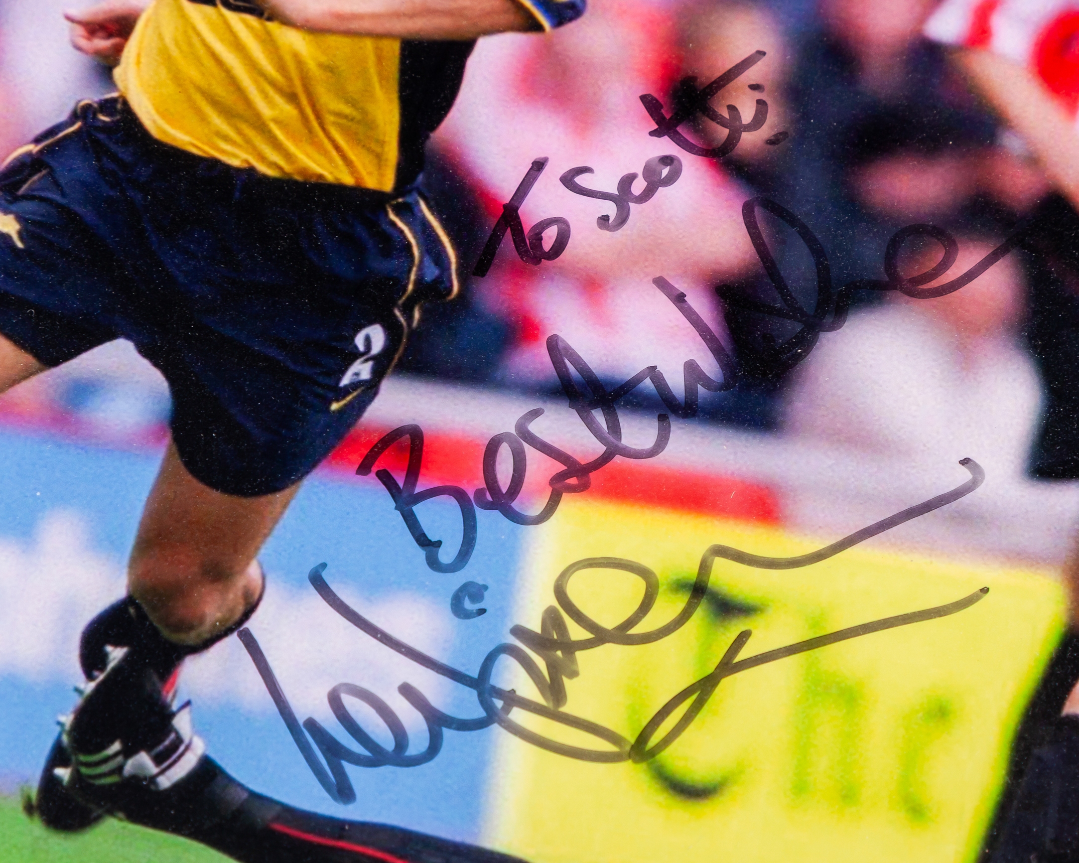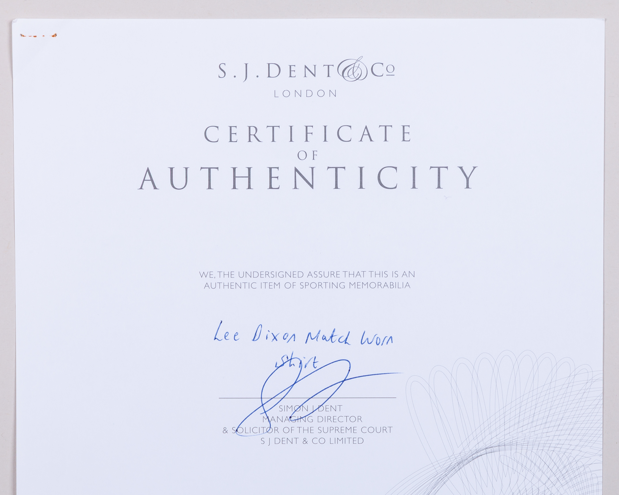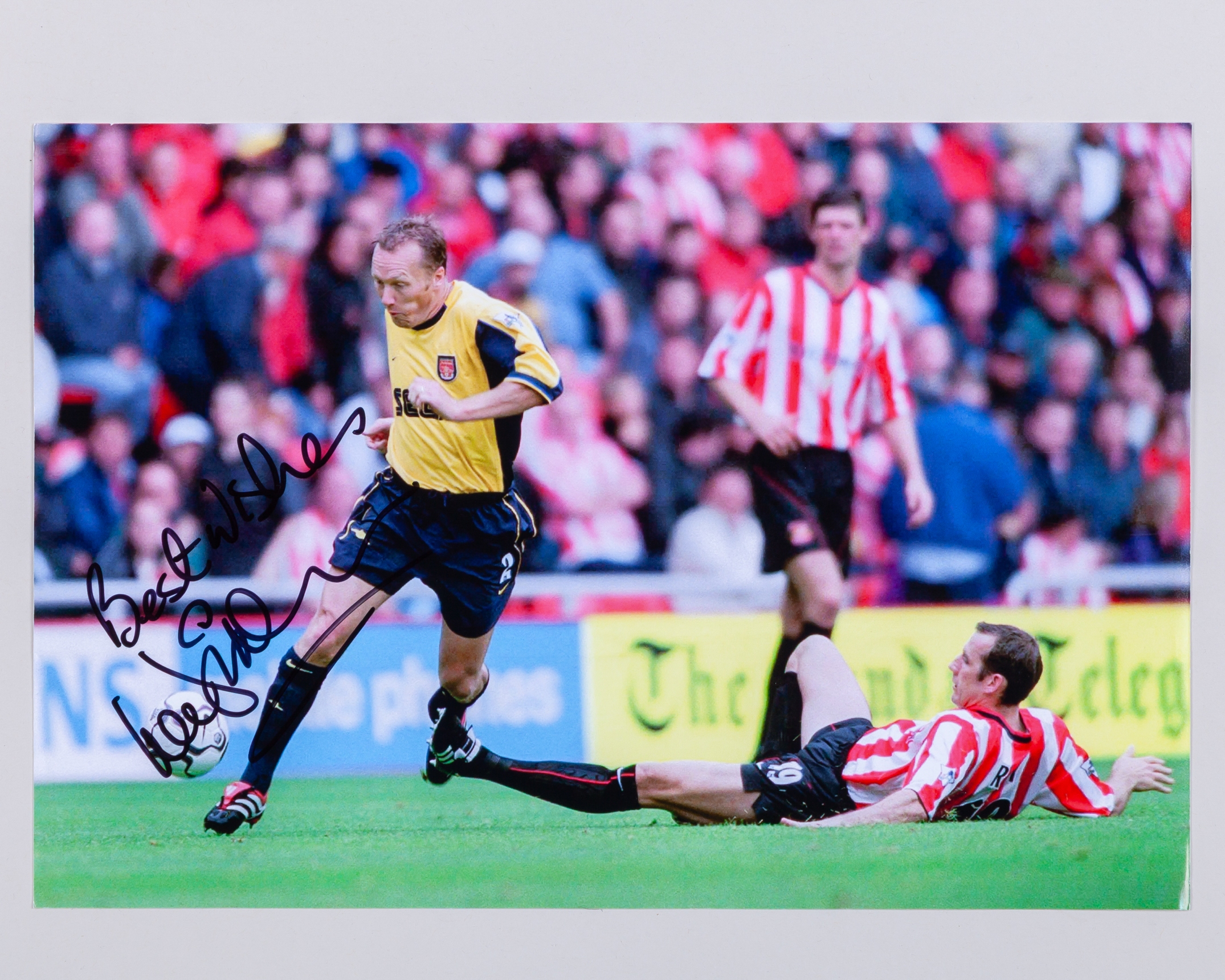 Lee Dixon yellow and blue Arsenal short-sleeved shirt, 2000-01, Nike, XL, with v-neck collar and embroidered cloth badge inscribed THE GUNNERS Arsenal Victoria Concordia Crescit, the sleeves with The F.A. Premier League flashes, with COA stating Lee Dixon match worn shirt, framed and glazed, 90 x 88cm, two Lee Dixon autographed action colour photographs, one framed and glazed, 40 x 32cm (3)
