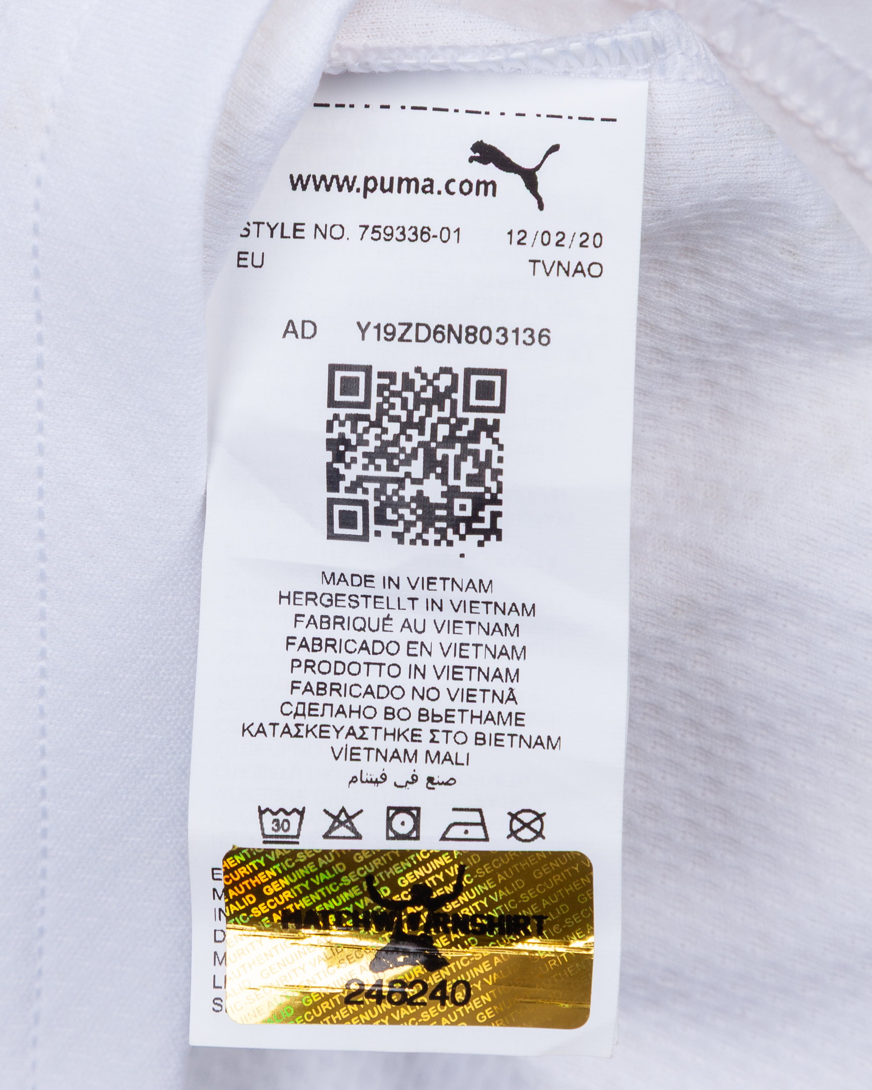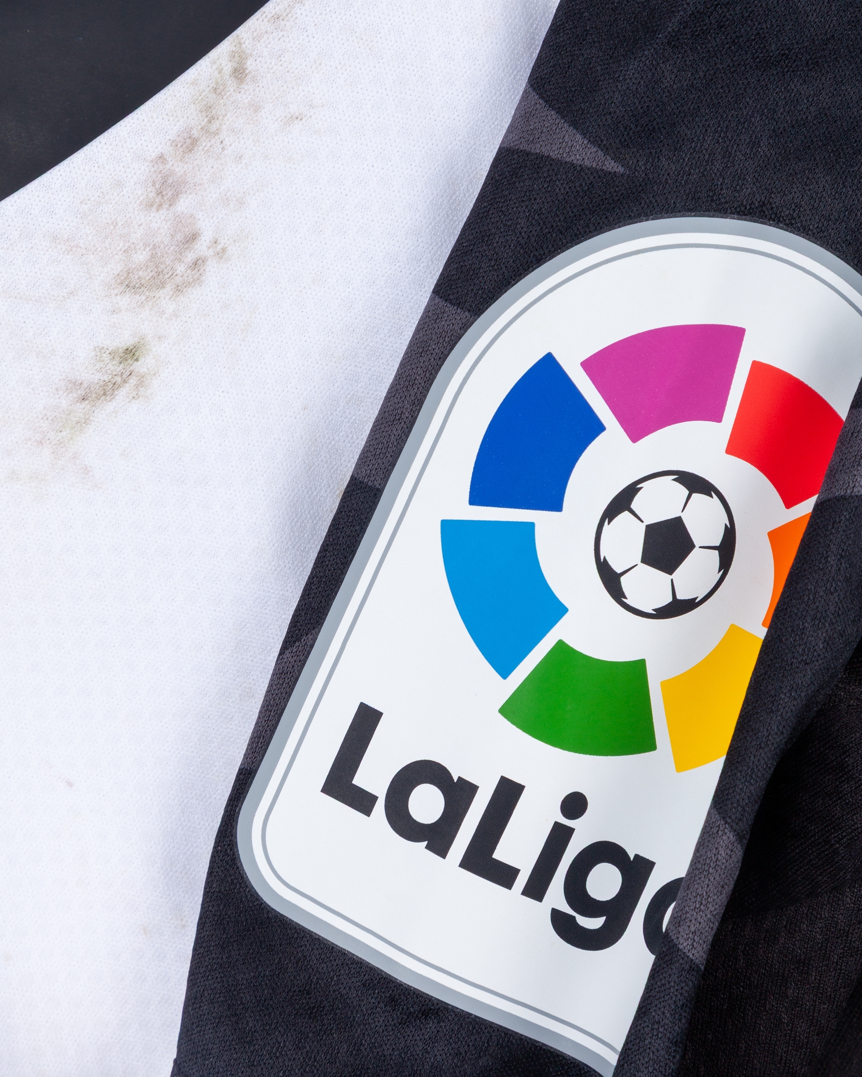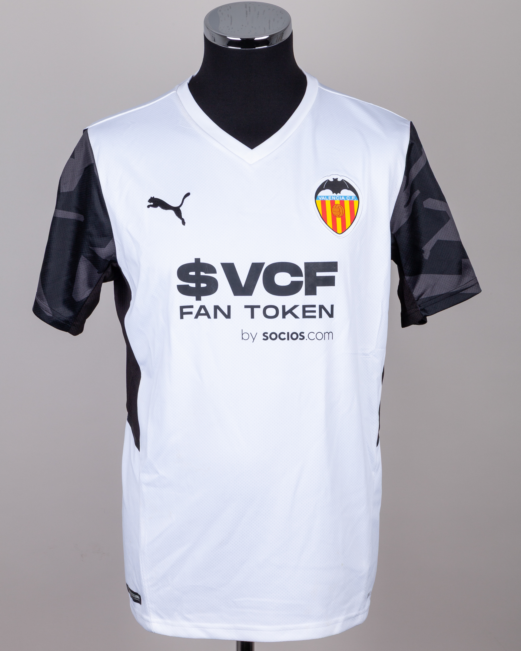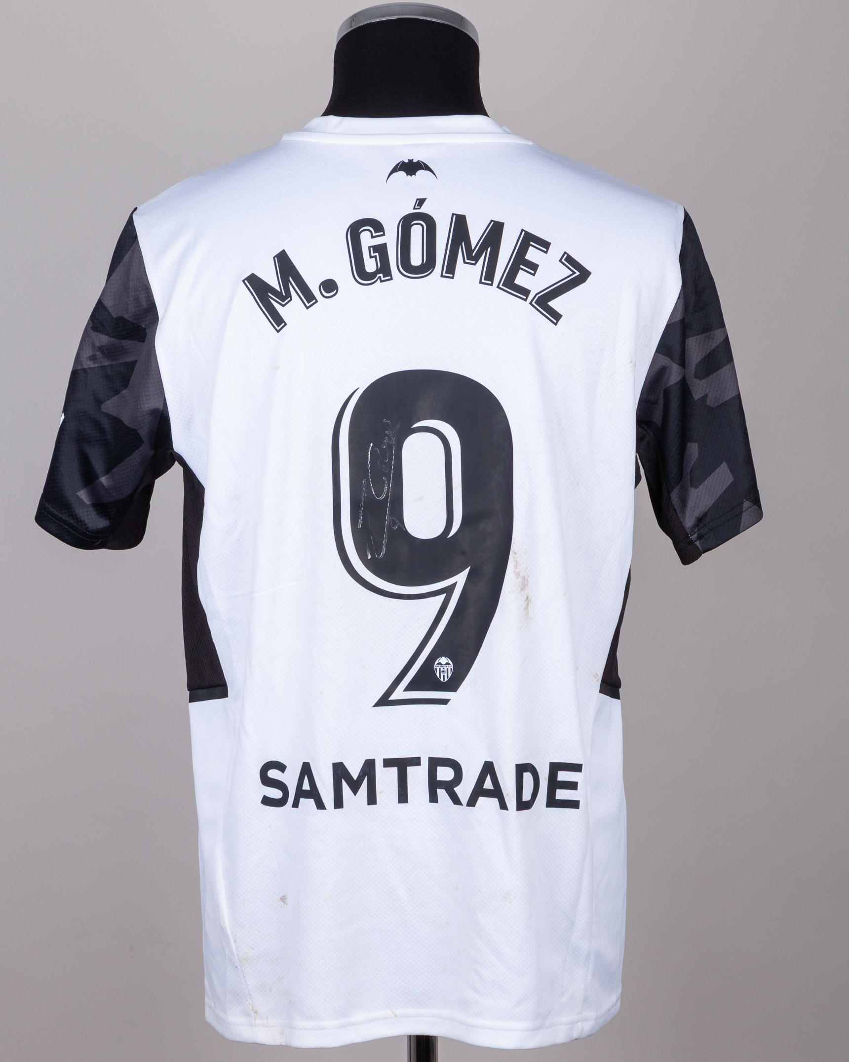 Maximiliano Gomez white and black No.9 Valencia v. Barcelona match worn autographed short-sleeved shirt, 2022, Puma, L, with v-neck collar and embroidered cloth badge inscribed VALENCIA C.F., the reverse lettered M. GOMEZ, autographed on the number, the right sleeve with La Liga flash, with MatchWornShirt COA, with pitch staining