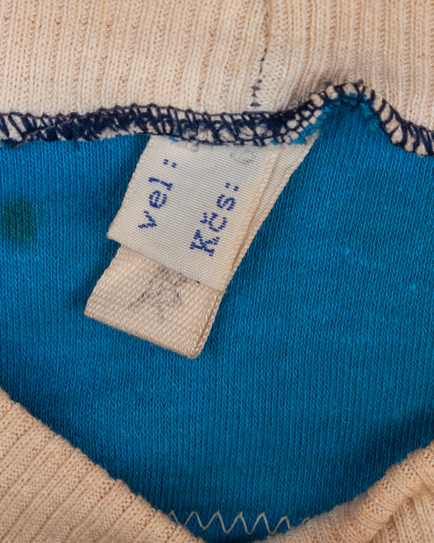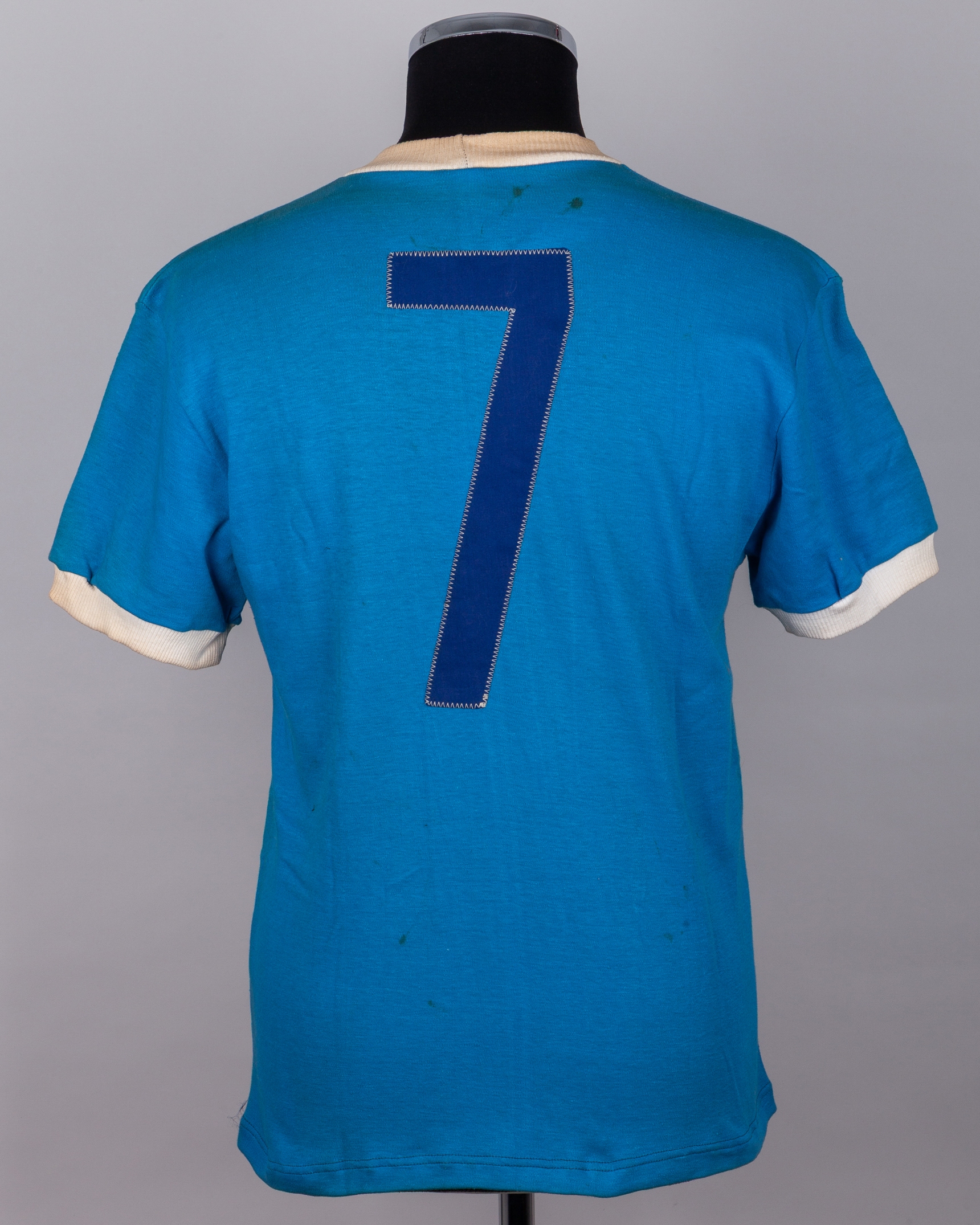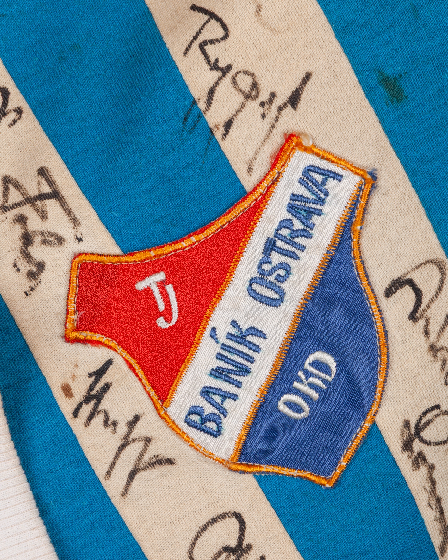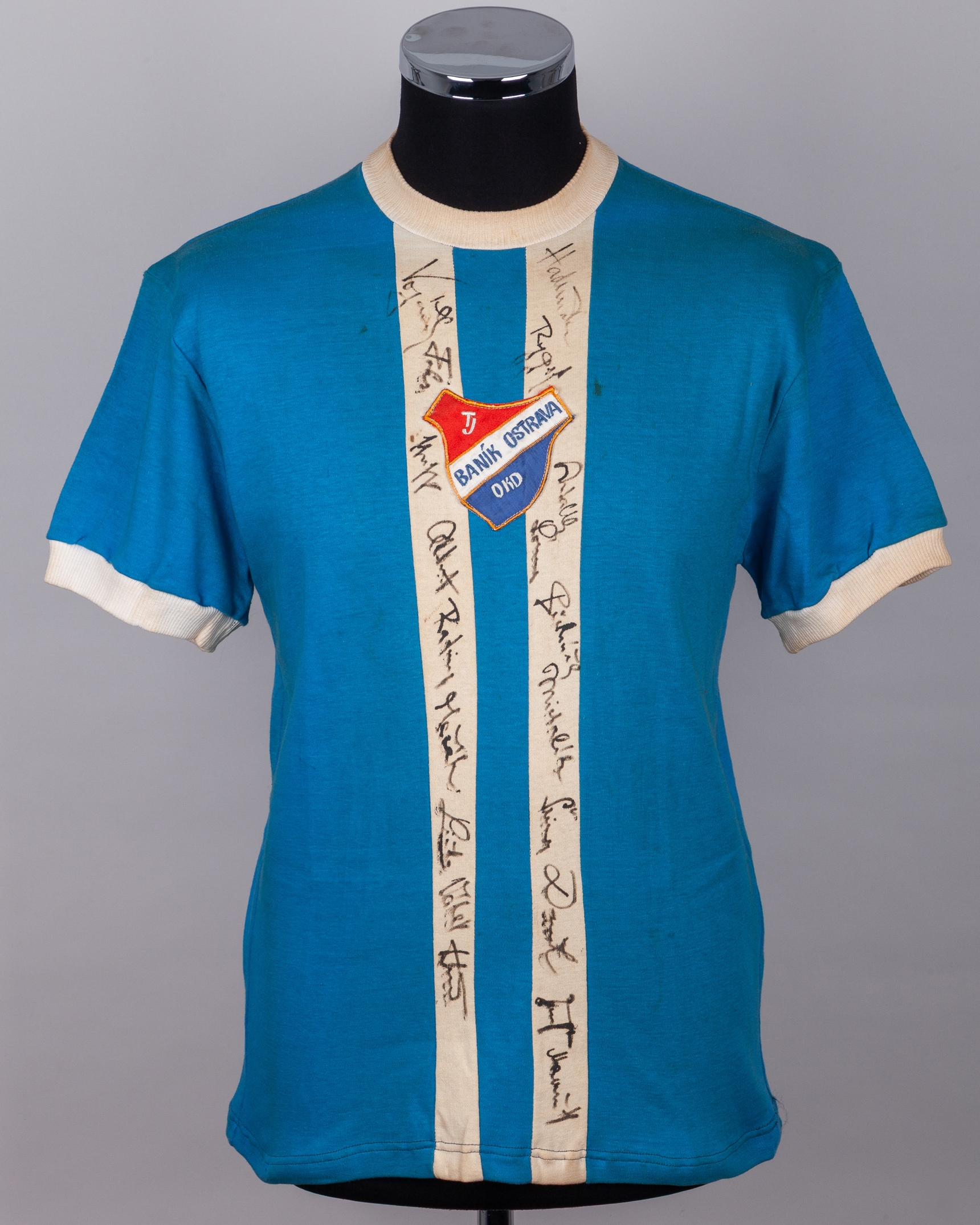Blue and white No.7 Banik Ostrava autographed short-sleeved shirt, c.1970s, vel:55, with crew-neck collar and embroidered cloth badge inscribed TJ BANIK OSTRAVA OKD, with approximately fifteen autographs, with staining and discolouration
