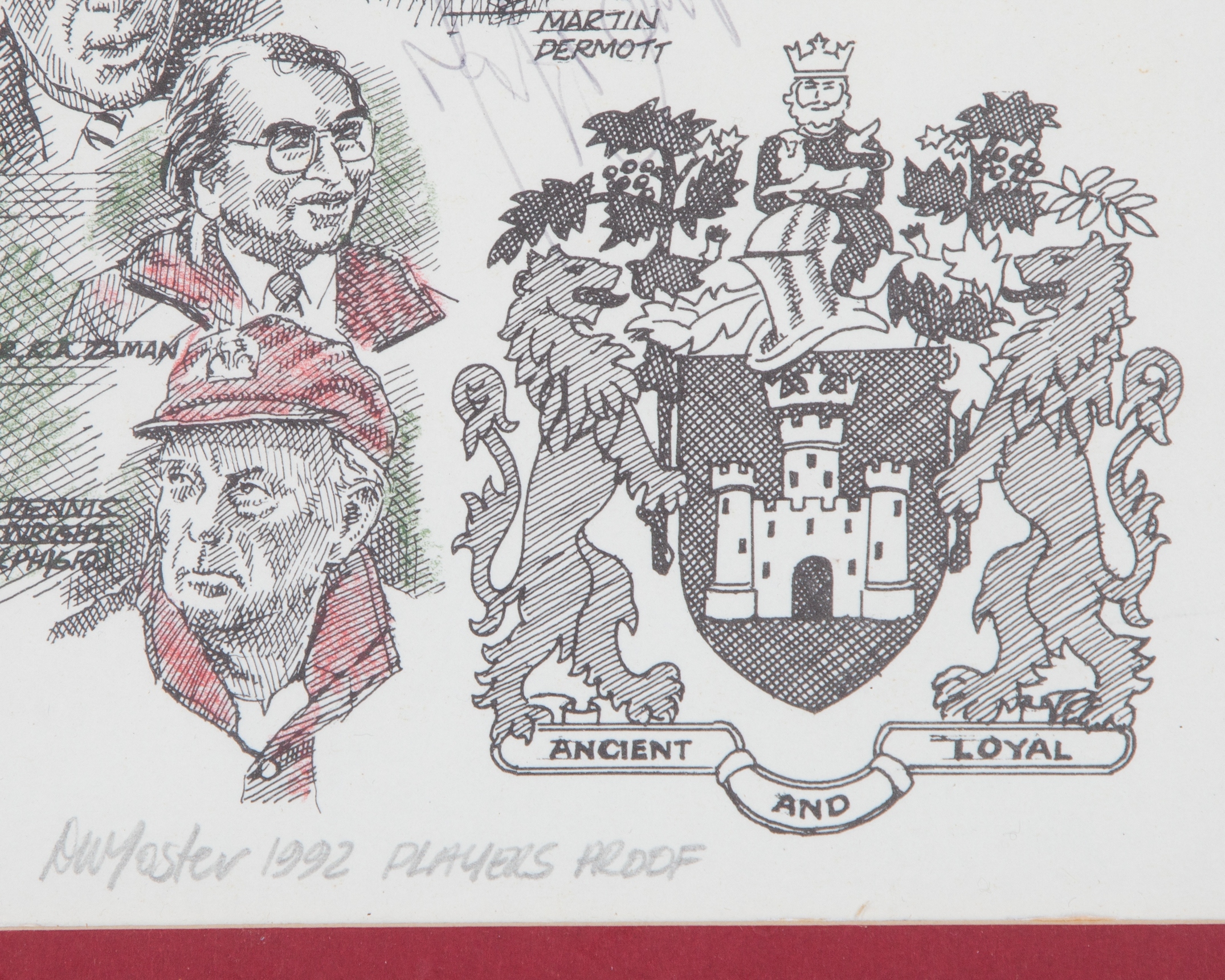 Wigan rugby league autographed 1992 double champions players proof print, with printed sketes of individual player and staff, with serval autographs including Dean Bell and Martin Offiah etc., framed and glazed, 70 x 58cm