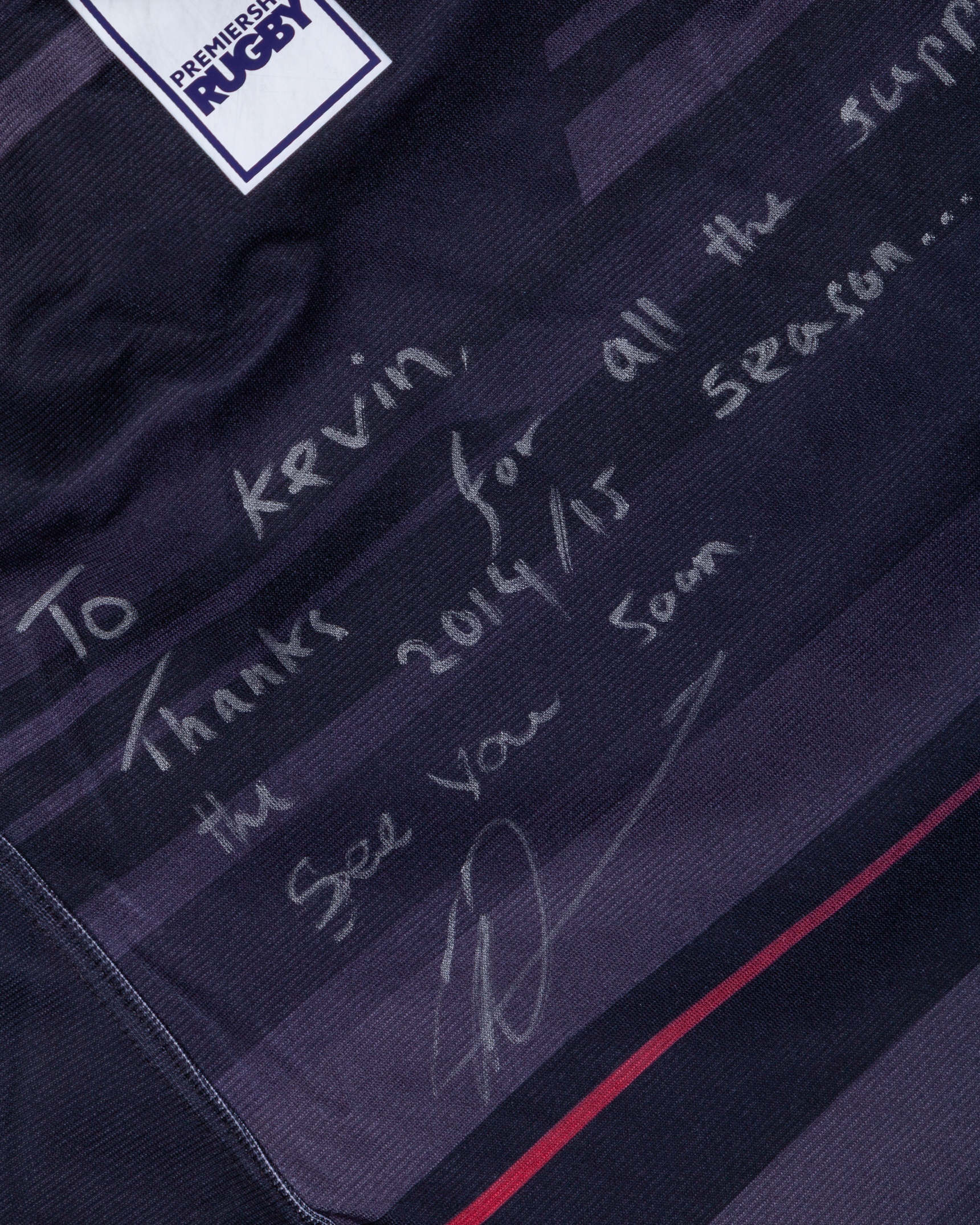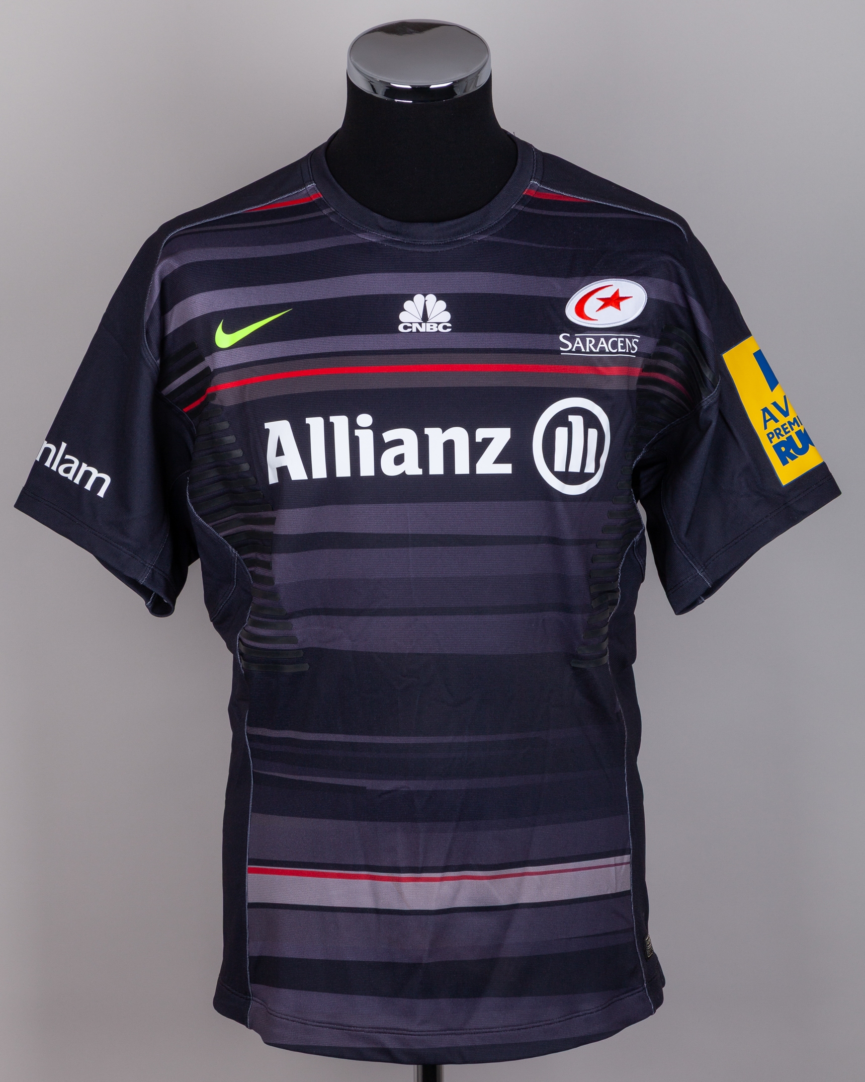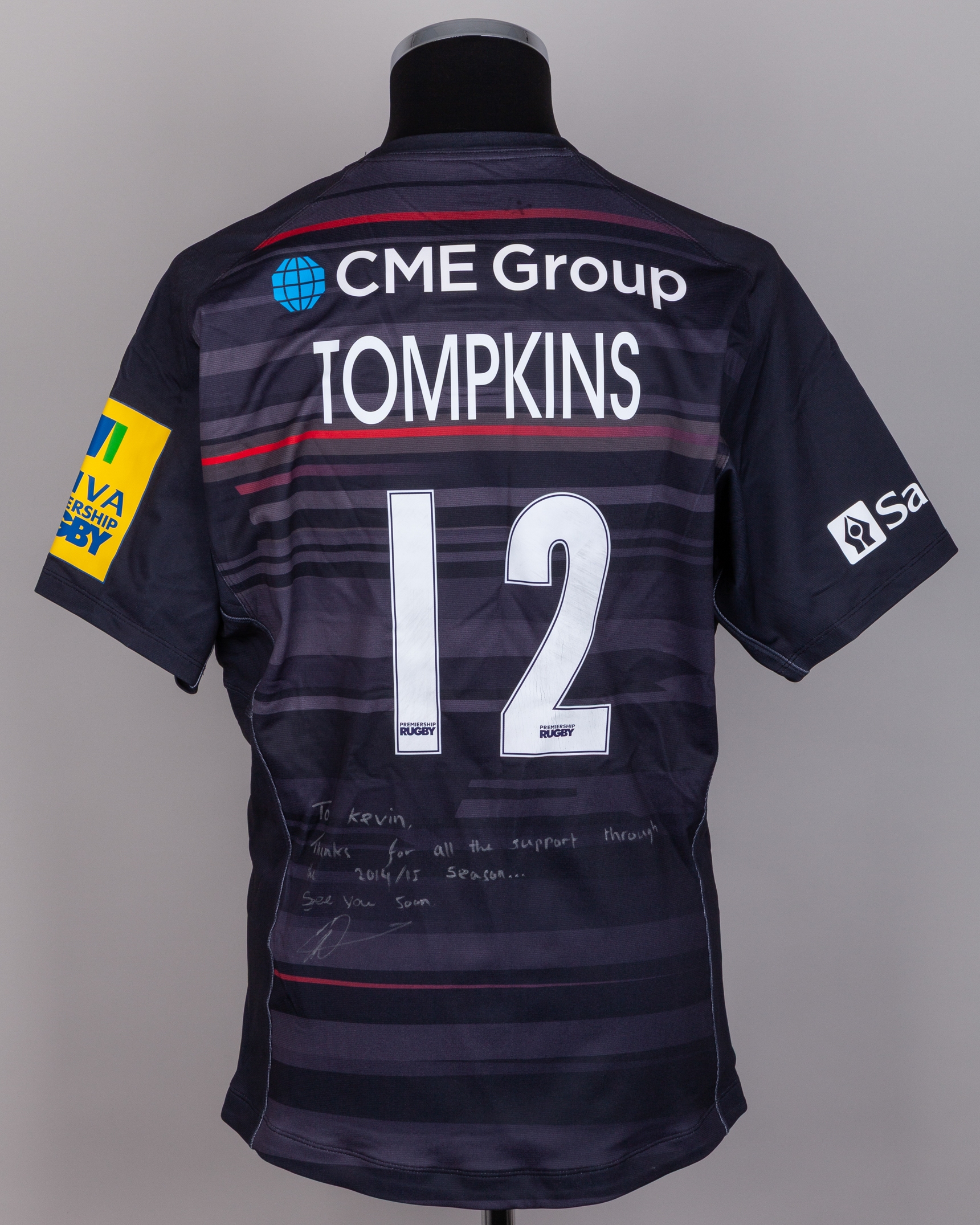 Nick Tompkins black No.12 Saracens autographed short-sleeved rugby shirt, 2014-15, Nike, XL, with crew-neck collar and printed badge, the reverse lettered TOMPLINS, autographed on the back “To Kevin, thanks for all the support through the 2014/15 season… See you soon”, the right sleeve with Aviva Premiership Rugby flash, with the number marked and worn