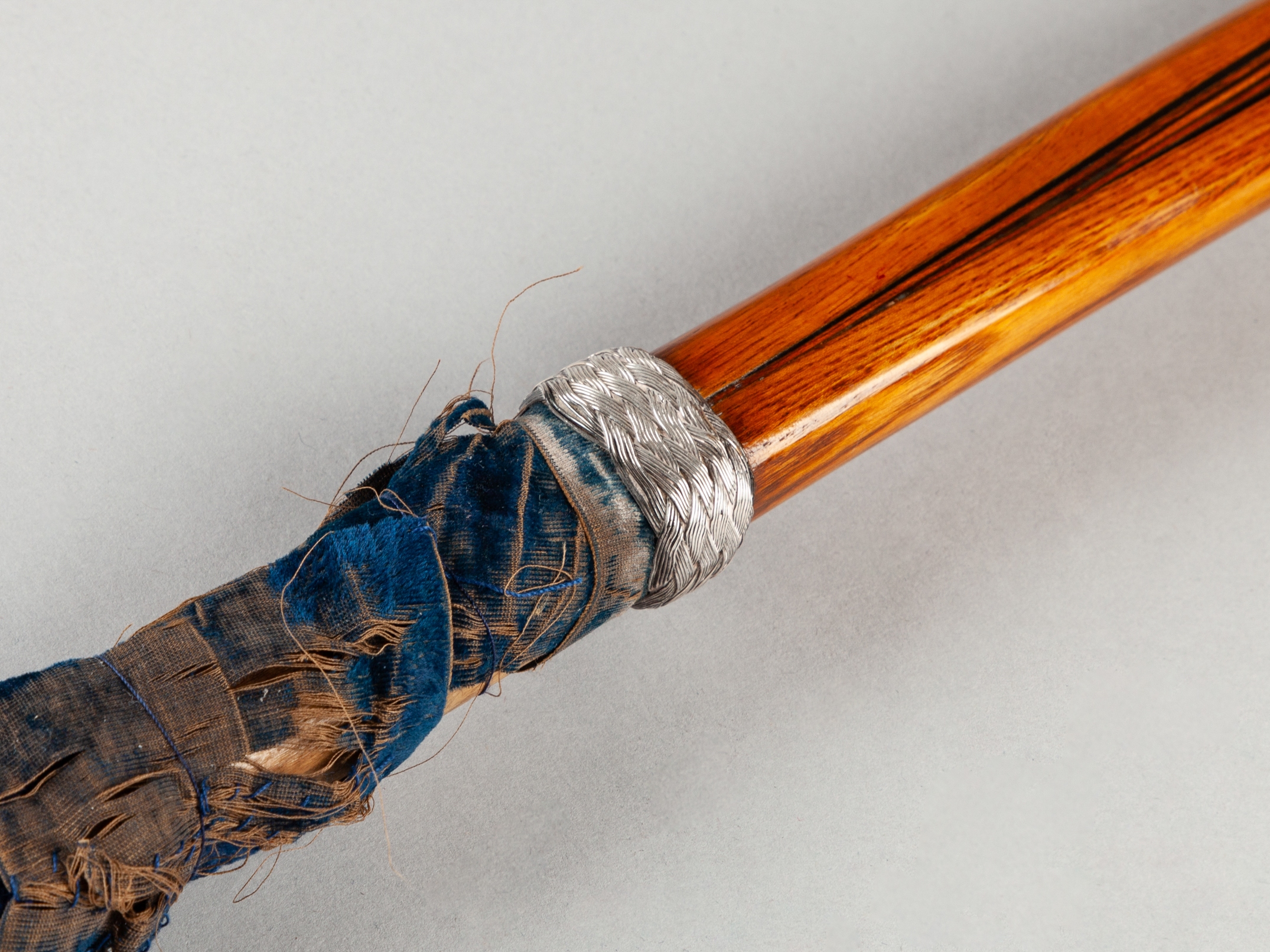 An extremely rare Rackets Racquet for the Brasenose trophy dated 1853 by Jeffries and Malings of Woolwich, with an ash head and walnut throat, strung with natural gut which was restrung around forty years ago, the sheepskin grip was covered in blue silk which is now distressed, the braided butt cap is made of Silver, the small silver shield fixed to the racquet is engraved with Davey's name as the winner but was misspelt as there was not enough space for the whole of his name on the silver shield hence it appears as 'Davy' not 'Davey'