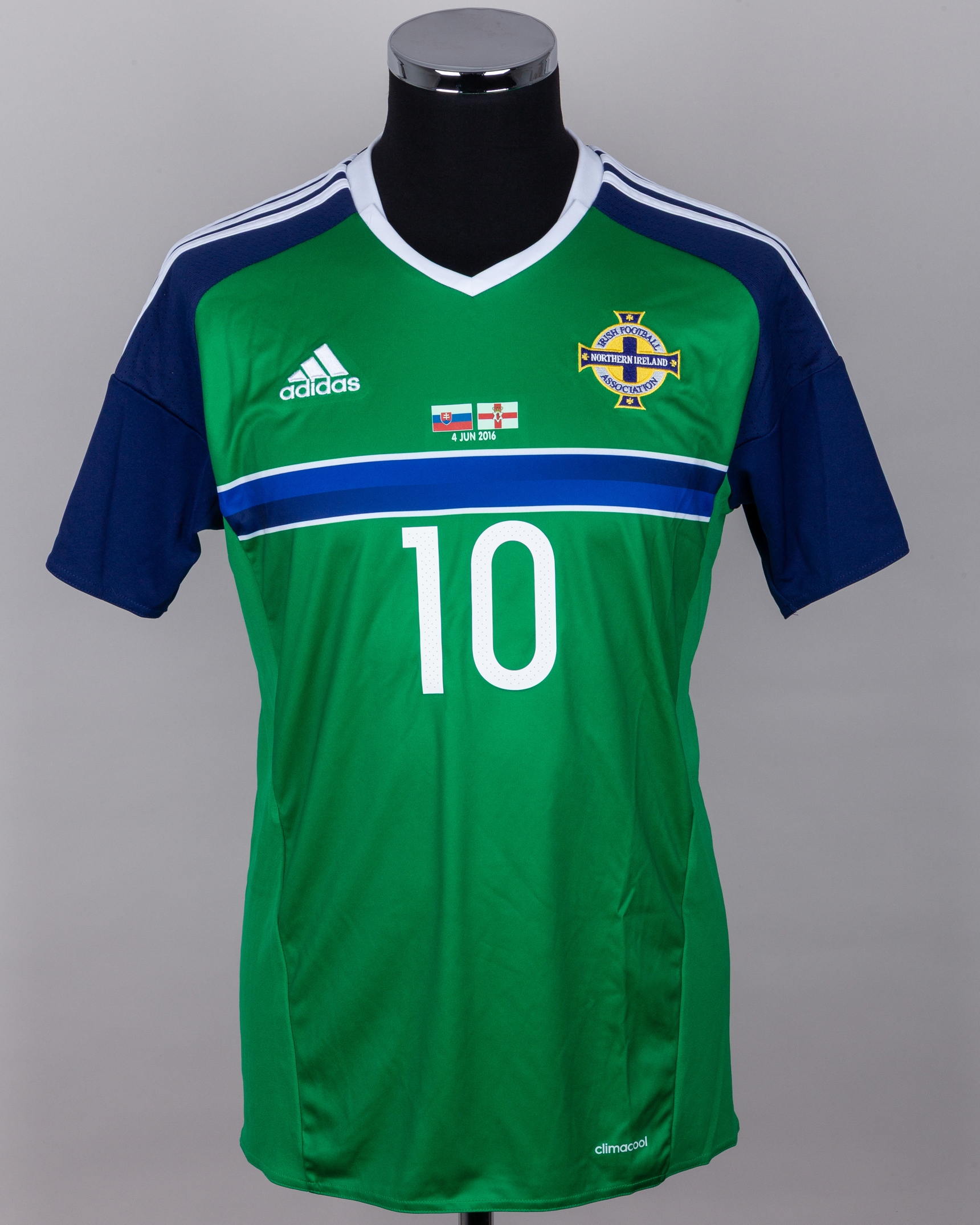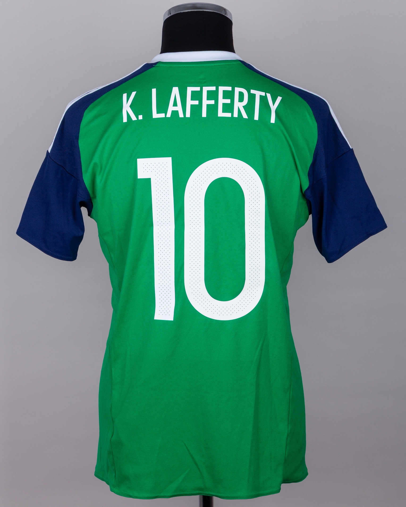 Kyle Lafferty green and blue No.10 Northern Ireland v. Slovakia match worn short-sleeved shirt, 2016, Adidas, M, with v-neck collar and embroidered badge inscribed NORTHERN IRELAND IRISH FOOTBALL ASSOCIATION, with 4 JUN 2016 decal, the reverse lettered K. LAFFERTY