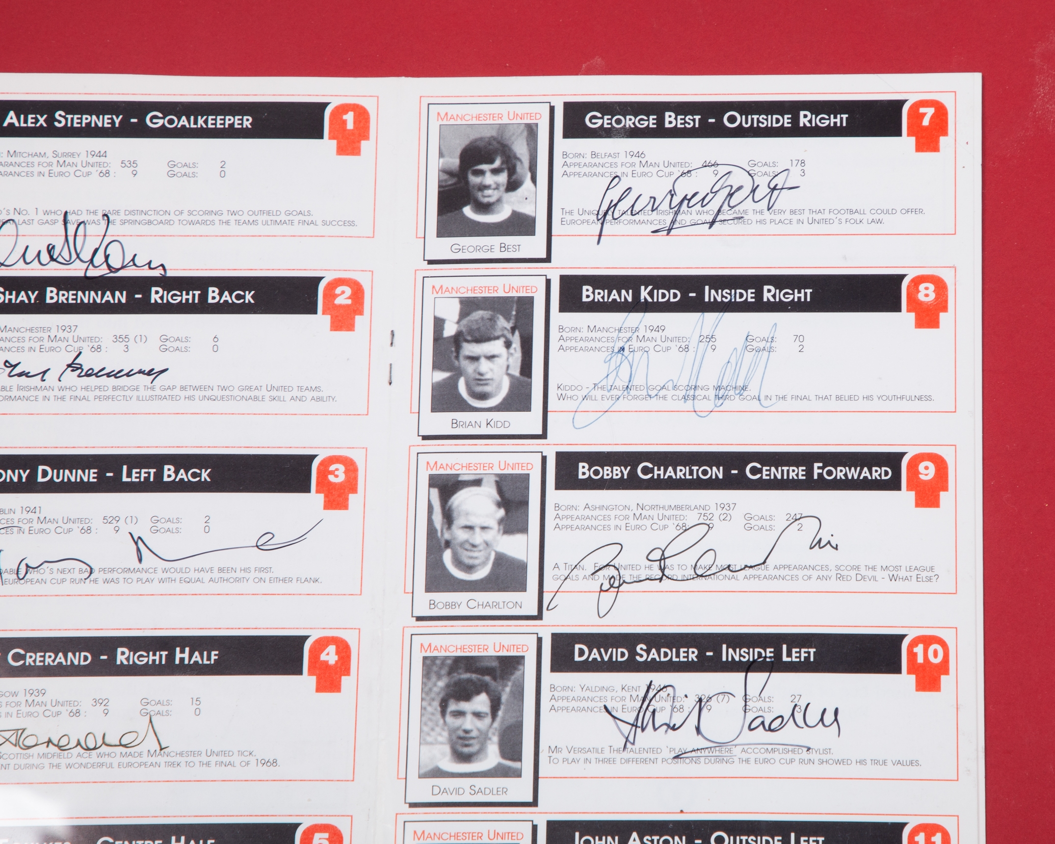 Start a valuationThe Manchester United Grand Reunion Charity Dinner invitation and autographed programme display, with twelve autographs including Alex Stepney, Shay Brennan, Tony Dunne, Pat Crerand, Bill Foulkes, Nobby Stiles, George Best, Brian Kidd, Bobby Charlton, David Sadler, John Aston, Denis Law and one other, with two colour photographs, framed and glazed, 53 x 43cm